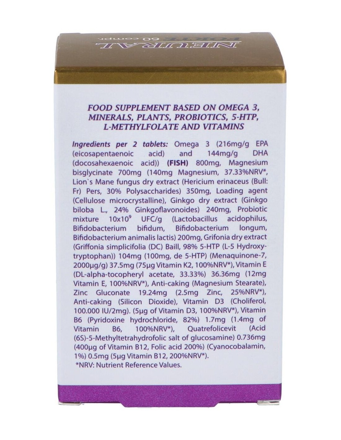 Por 2 comprimidos: Omega 3 (EPA 216 mg DHA 144 mg) 800 mg, bisglicinato de magnesio 350 mg (140 mg de magnesio), melena de león 350 mg, celulosa microcristalina, ginkgo biloba 240 mg, mistura de probióticos 10x10(9) UFC/g (lactobacillus acidophillus bifidobacterium bifidum, bifidobacterium longum, bifidobacterium animalis lactis) 200 mg, grifonia (DC 98% de 5HTP) 104 mg, vitamina K2 (menaquinona 7 2000 ppm) 37,50 mg, (75 mcg de vitamina K2), vitamina E (33,33% de acetato de alfa tocoferol) 36,36 mg (12 mg de vitamina E), estearato de magnesio, dióxido de silicio, gluconato de zinc (13% zn) 9,62 mg (2,5 mg de zinc), vitamina D3 (colecalciferol 100000 UI/g) 2 mg (5 mcg de vitamina D3), vitamina B6 (piridoxina HCL 82%) 1,70 mg (1,4 mg de vitamina B6), quatrefolic (ácido-5-metiltetra-hidrofólico sal de glucosamina) 0,736 mg (400 mcg de vitamina B9), vitamina B12 (cianocobalamina 1%) 0,50 mg (2,5 mcg de vitamina B12).