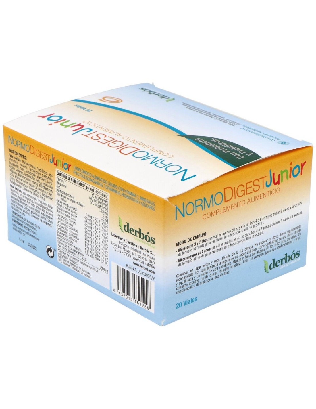 Derbos Normodigest Junior es un complemento alimenticio ayuda a activar la flora intestinal. Su fórmula con cepas bioactivas de bifidus y lactobacilos contribuye a la mejora de la asimilación de los alimentos y al refuerzo del sistema inmunitario.