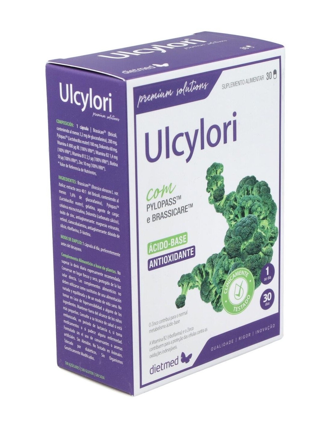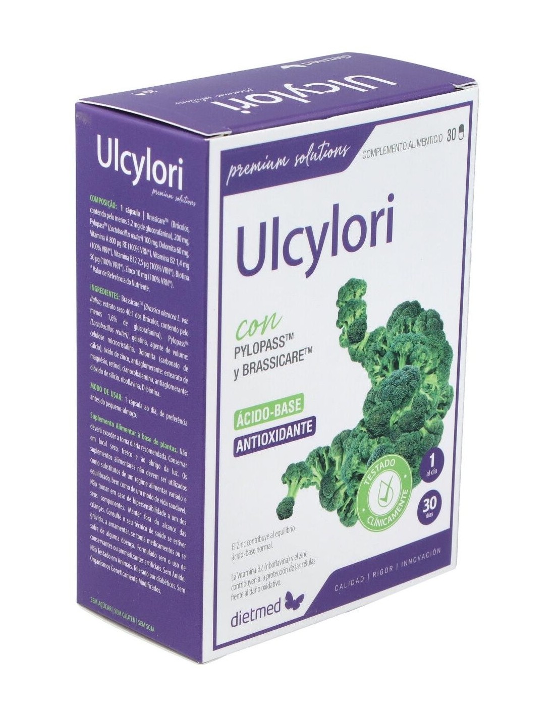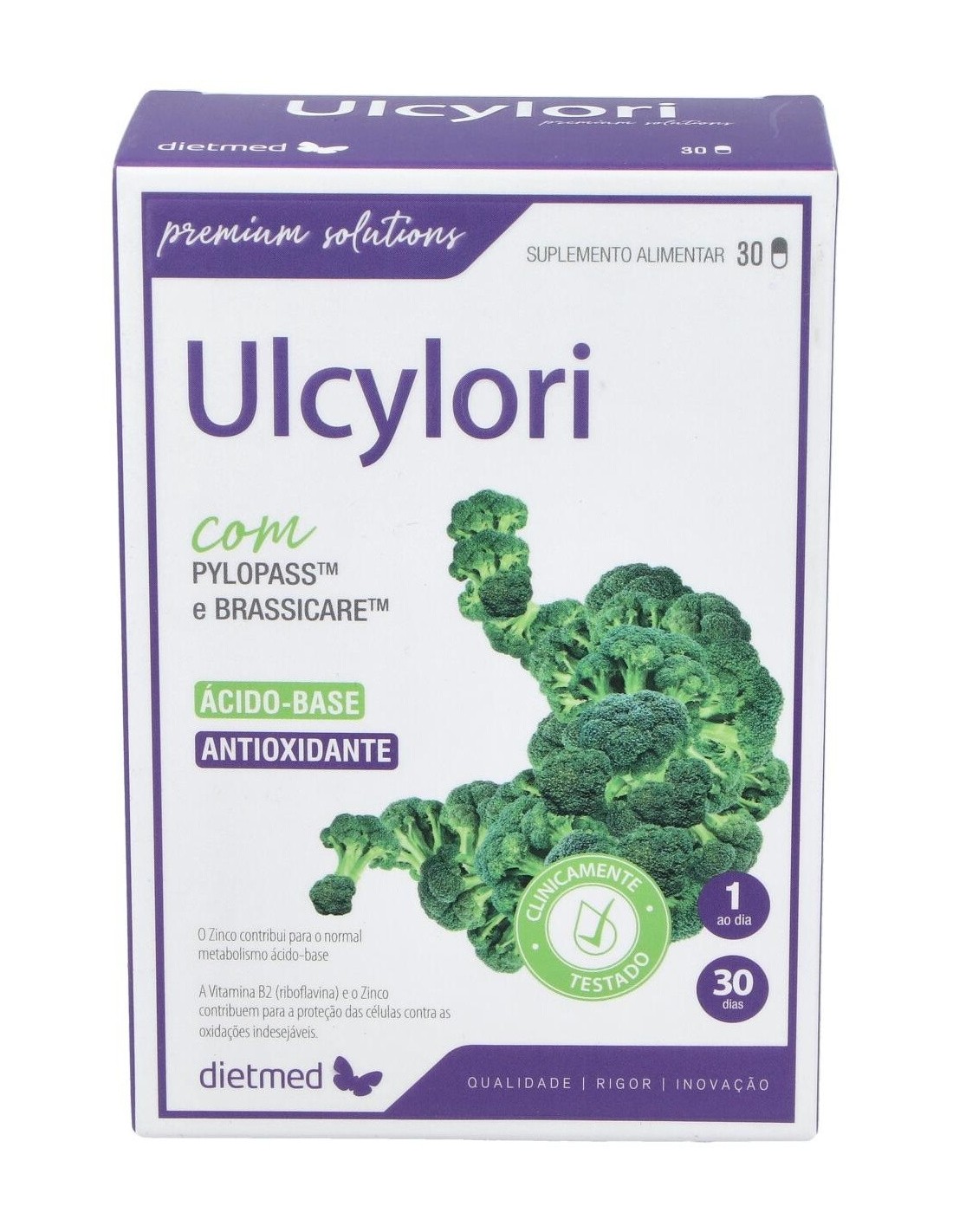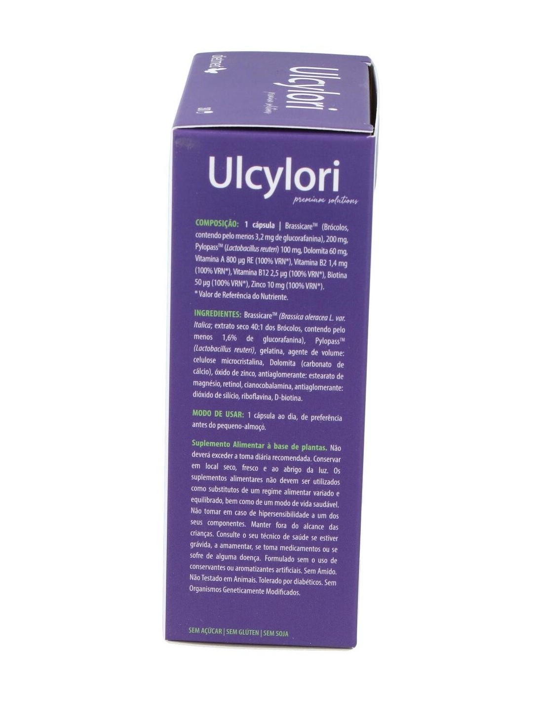 BrassicareTM (Brócoli, conteniendo al menos 3,2 mg de glucorafanina) 200 mg, PylopassTM (Lactobacillus reuteri) 100 mg, Dolomita 60 mg, Vitamina A 800 µg RE (100% VRN*), Vitamina B2 1,4 mg (100% VRN*), Vitamina B12 2,5 µg (100% VRN*), Biotina 50 µg (100% VRN*), Zinc 10 mg (100% VRN*).