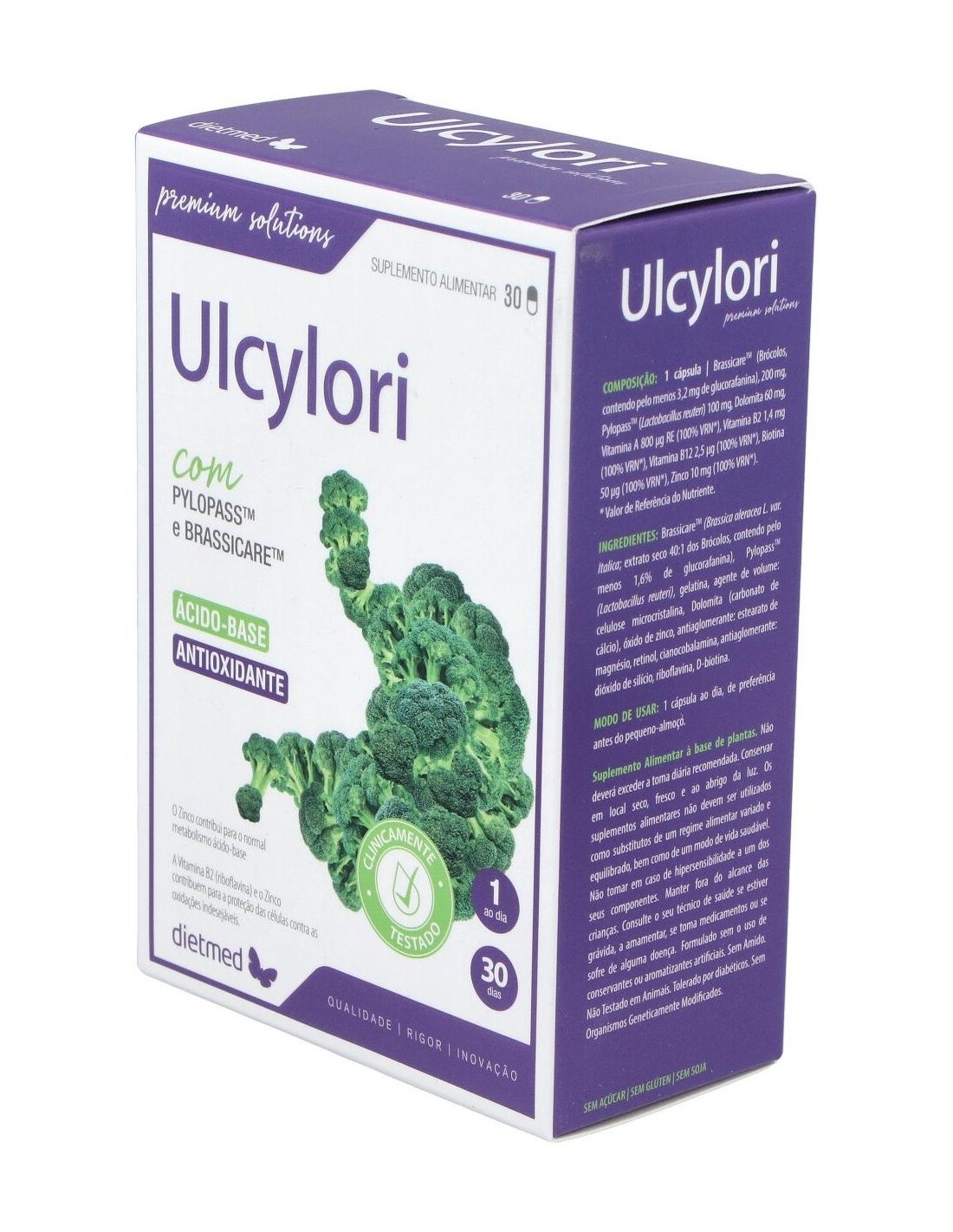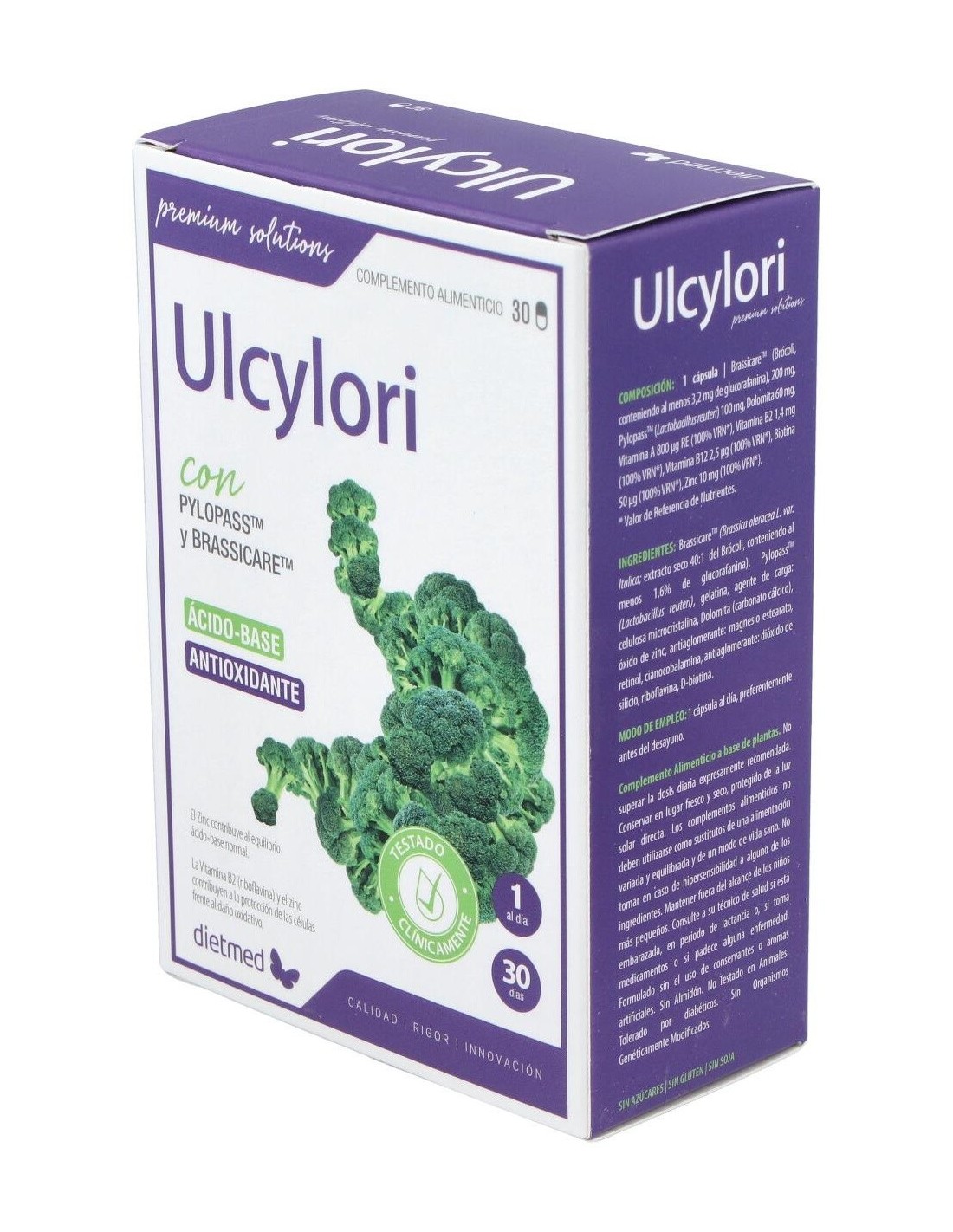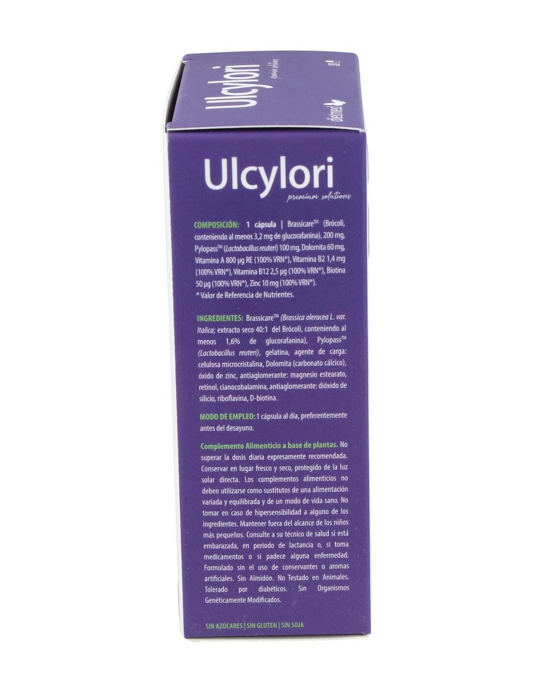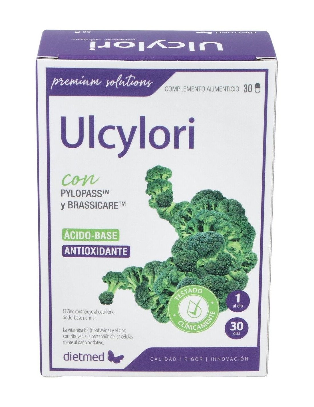 BrassicareTM (Brócoli, conteniendo al menos 3,2 mg de glucorafanina) 200 mg, PylopassTM (Lactobacillus reuteri) 100 mg, Dolomita 60 mg, Vitamina A 800 µg RE (100% VRN*), Vitamina B2 1,4 mg (100% VRN*), Vitamina B12 2,5 µg (100% VRN*), Biotina 50 µg (100% VRN*), Zinc 10 mg (100% VRN*).