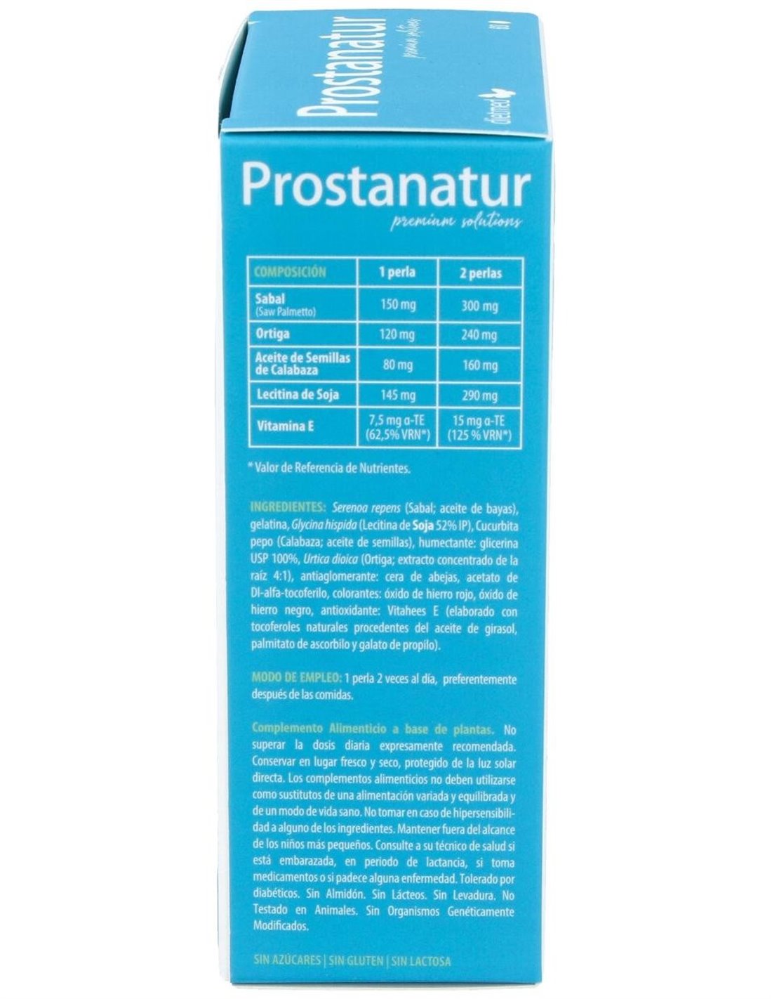 Saw Palmetto 300 mg, Ortiga 240 mg, Aceite de semillas de Calabaza 160 mg, Lecitina de Soja 240 mg, Vitamina E 10 mg a-TE (83,2 % VRN*).