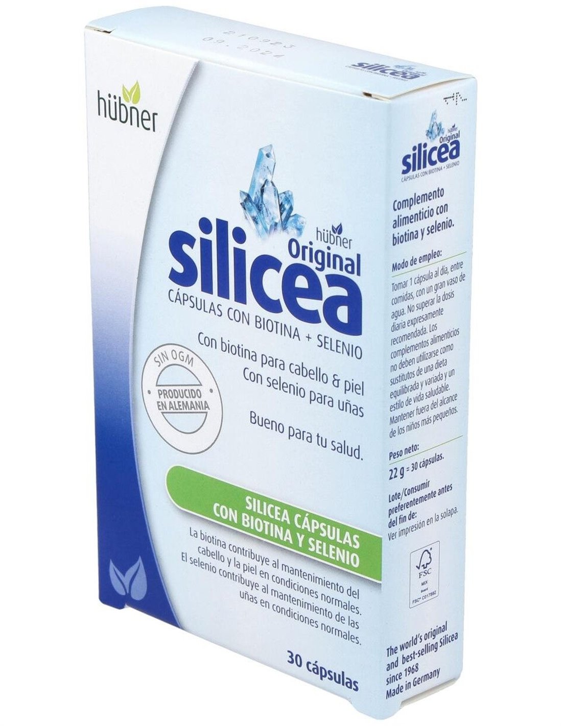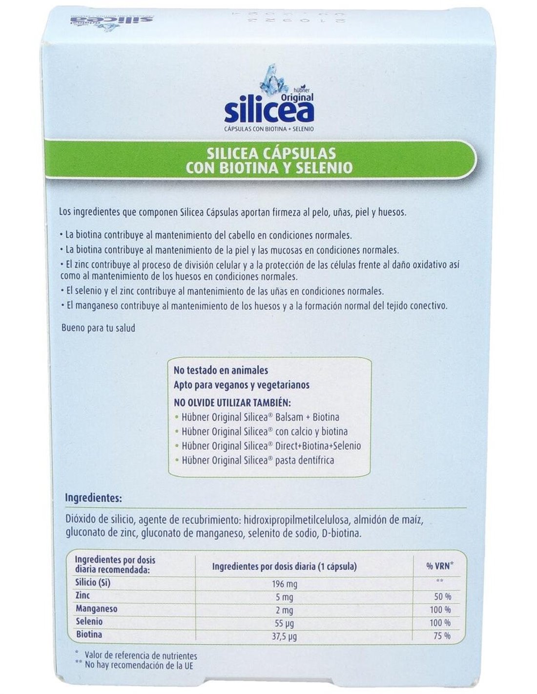 Hübner Silicea + Biotina + Selenio 30 cáps. es un complemento alimenticio que aporta un gran contenido de silicio al cuerpo, ideal para reforzar el tejido conectivo el piel, uñas y cabello. Cada capsula aporta silico puro biodisponible, biotina, selenio, zinc y manganeso. Al tomar estas cápsulas durante un tiempo prolongado, se obtiene una piel tersa y reluciente, un cabello fuerte y brillante y, unas uñas duras y resistentes.