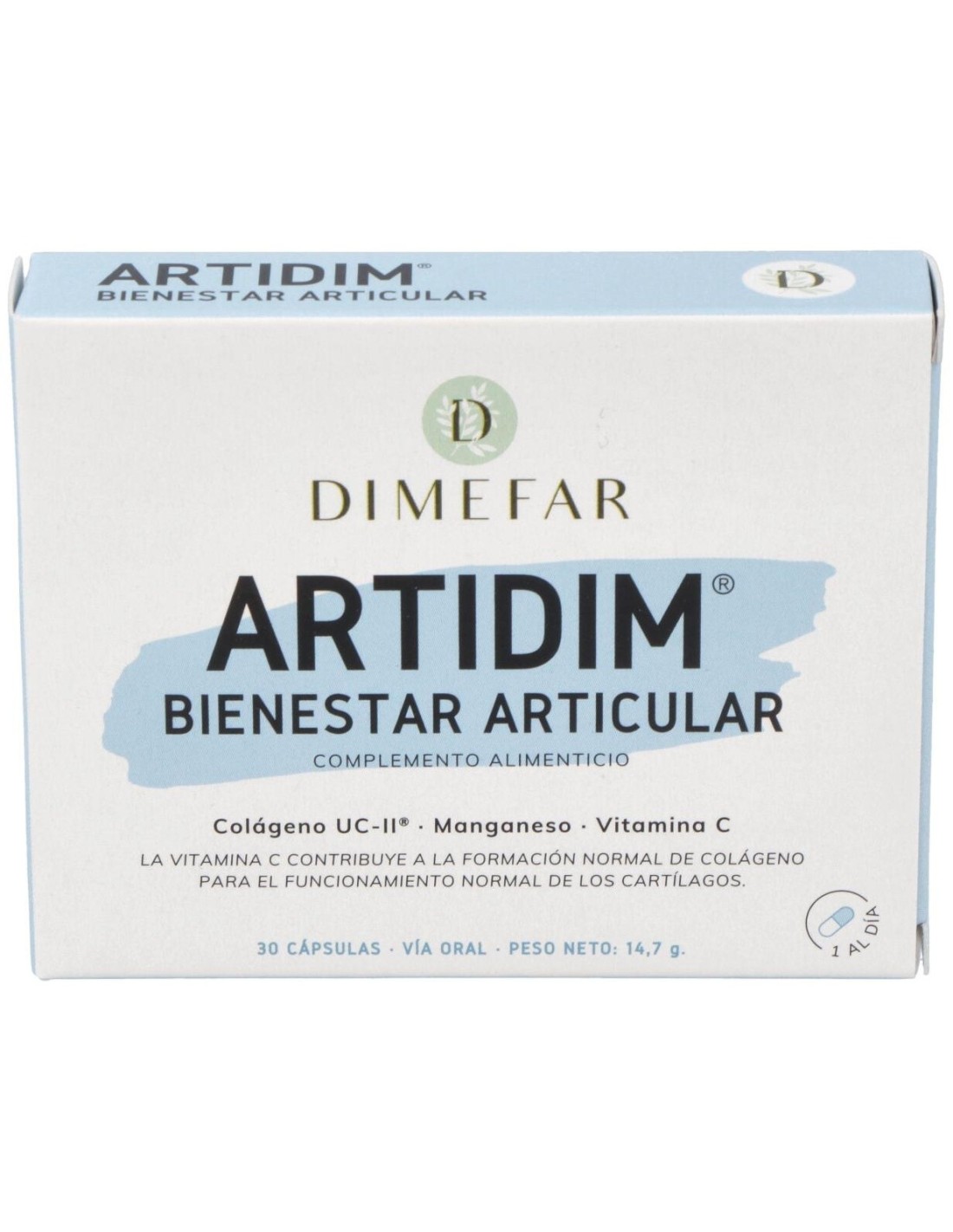Dimefar Artidim 30Cáps es un complemento alimenticio a base de colágeno tipo II no hidrolizado, manganeso y vitamina C que contribuye a mantener la salud articular.