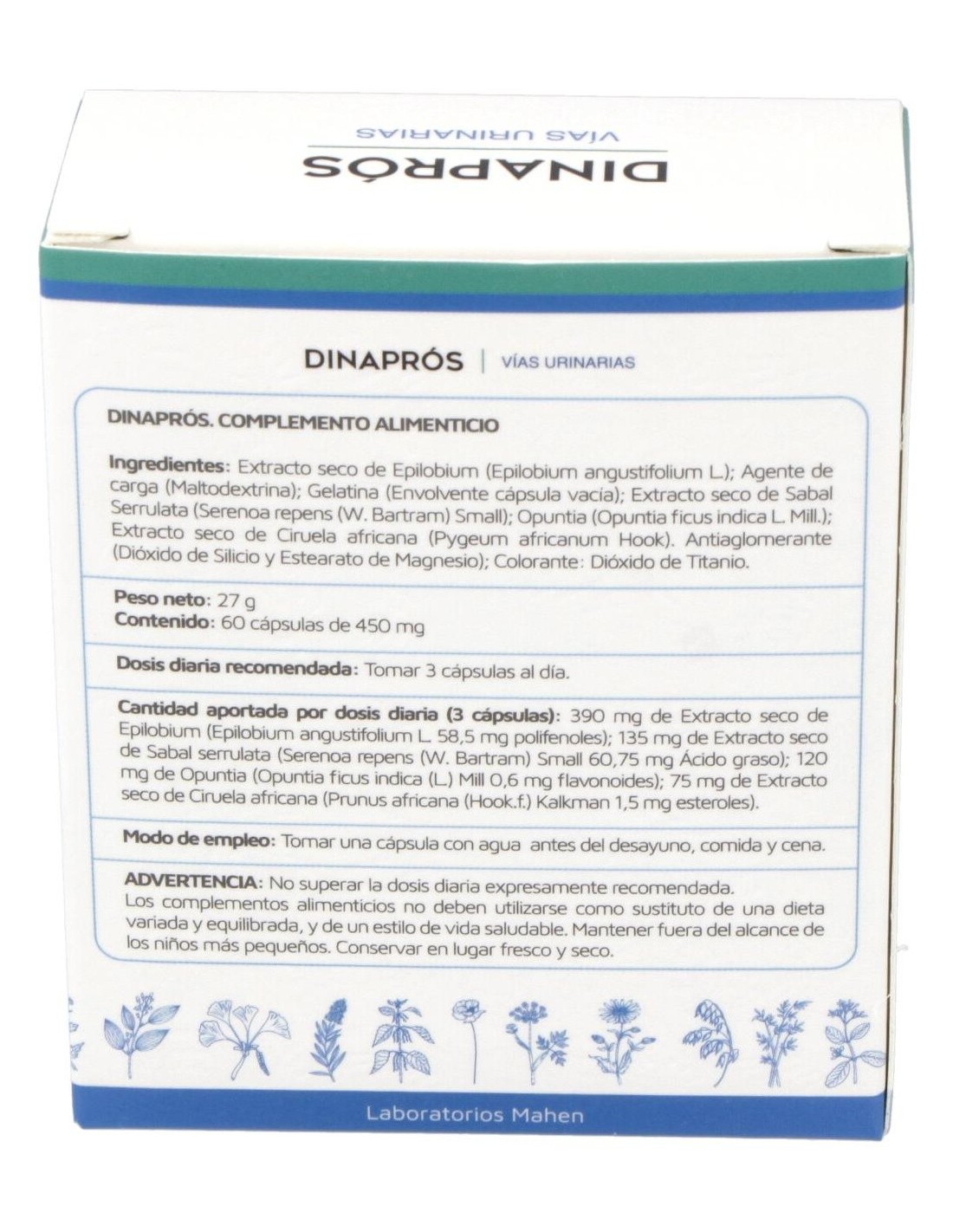 EXTO SECO DE EPILOBIUM ( EPILLOBIUM ANGUSTIFOLIUM L.) . 28,88% : 390 MG - AGENTE DE CARGA : MALTODEXTRINA - GELATINA ( ENVOLVENTE DE LA CÁPSULA VACIA ) - EXTO SECO DE SABAL SERRULATA ( SERENOA REPENS ( W. BARTRAM) SMALL 10% : 135 MG - OPUNTIA ( OPUNTIA FICUS INDICA L MILL. ) 8,88% : 120 MG- EXTO SECO DE PYGEUM AFRICANUM ( PYGEUM AFRICANUM HOOK) : 5,55% : 75 MG - ANTIAGLOMERANTES ( DIÓXIDO DE SILICIO Y ESTEARATO DE MAGNESIO ).