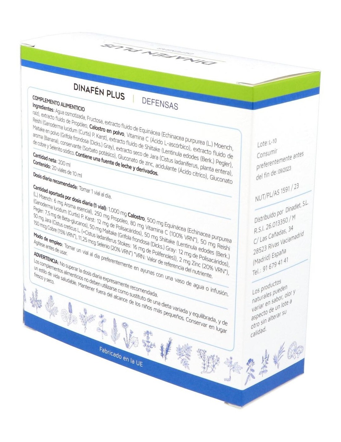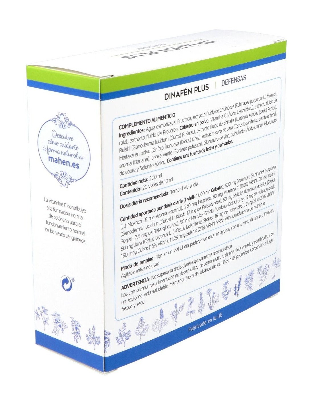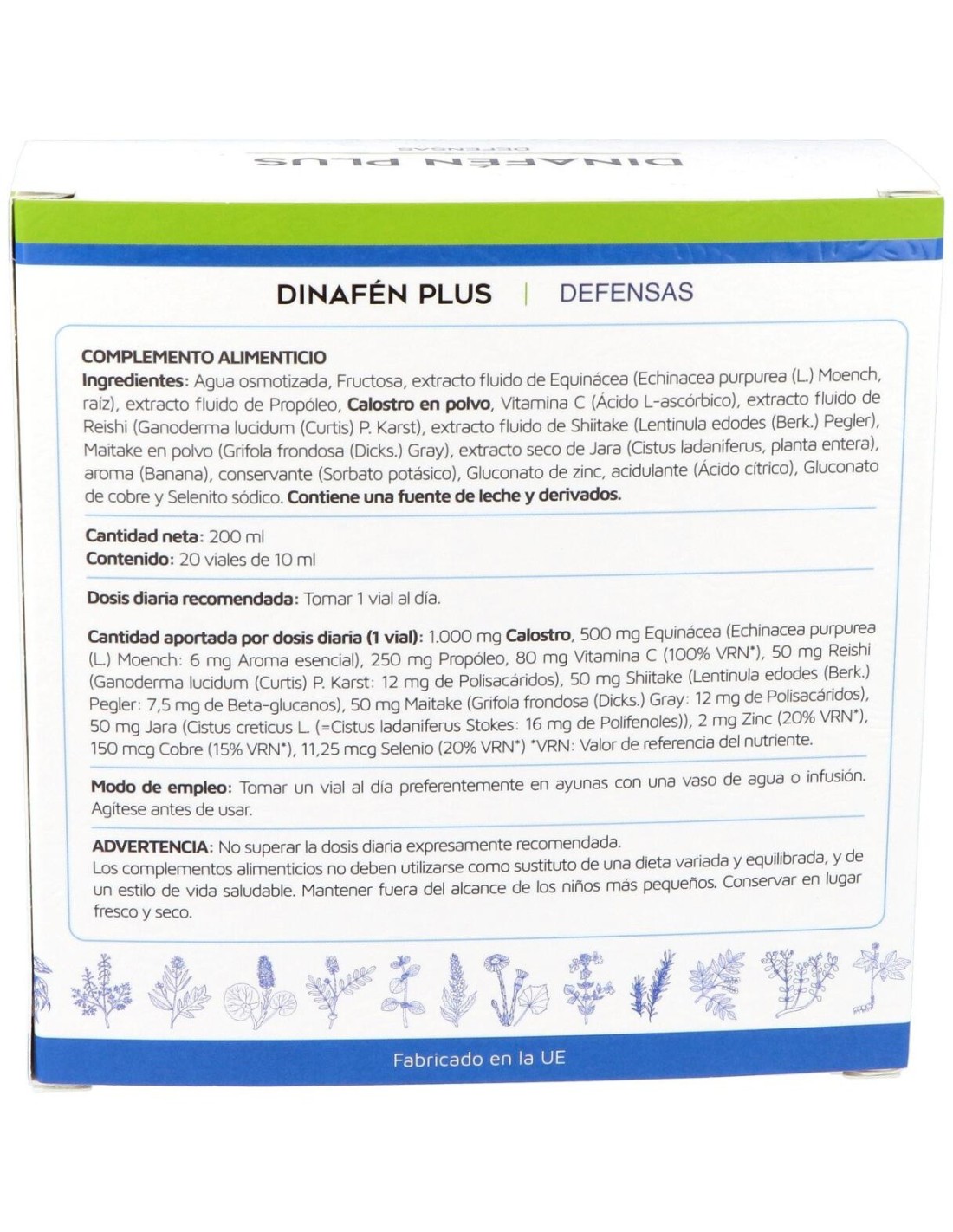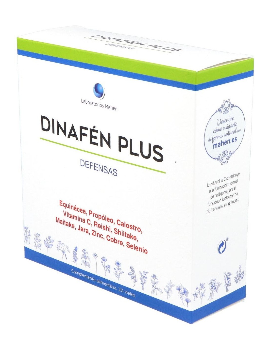 Dinafen Plus 20 viales es un complemento alimenticio en formato líquido que ayuda al buen funcionamiento del sistema inmunitario. Formulado con calostro, equinácea, jara, propóleo y hongos shiitake, reishi y maitake ayuda a reforzar las defensas.