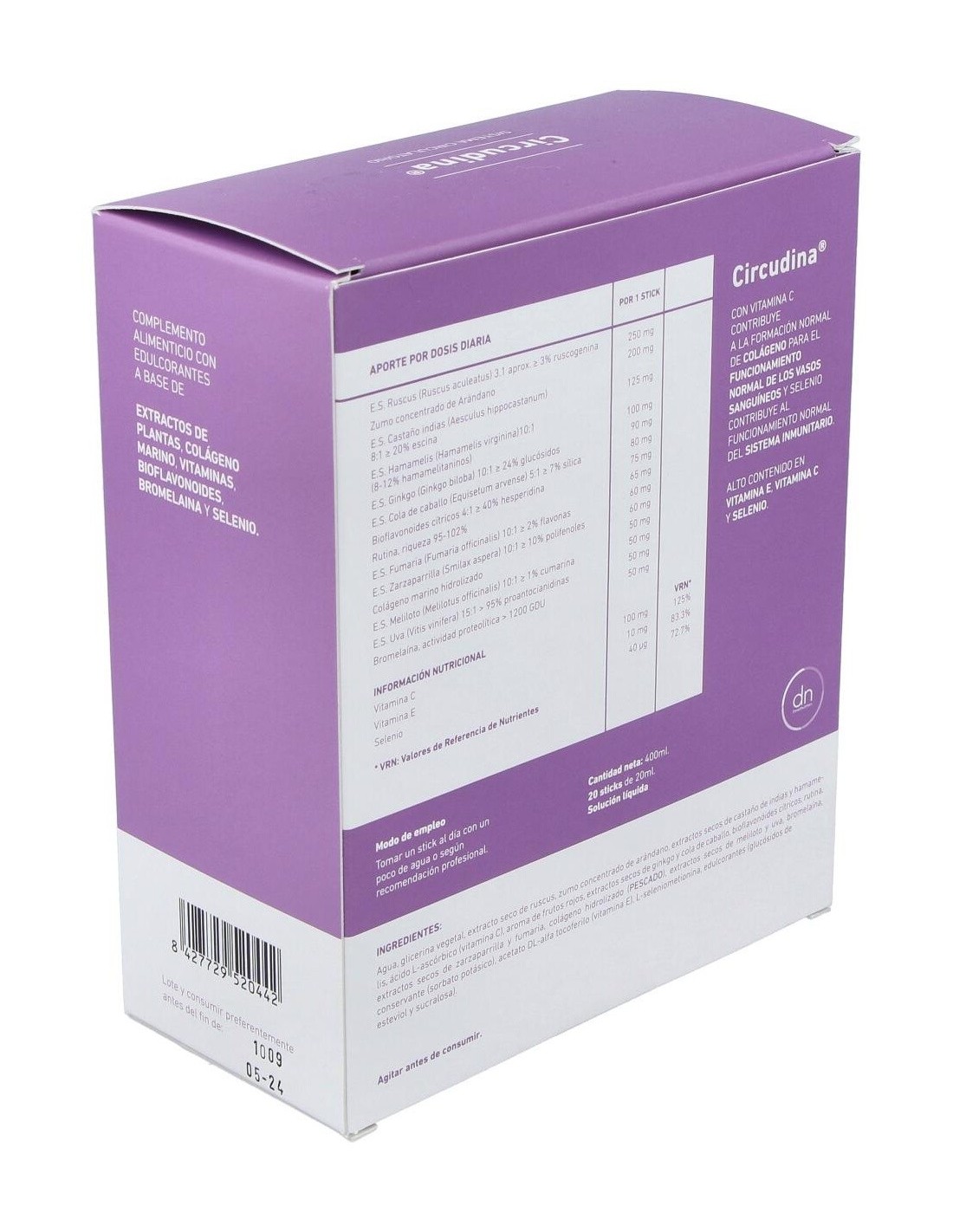 Complejo herbario a base de extractos secos de plantas, vitamina E, bioflavonoides, OPC (proantocianidinas) y colágeno marino hidrolizado enzimáticamente de acción sinérgica para ayudar a una circulación normal.
