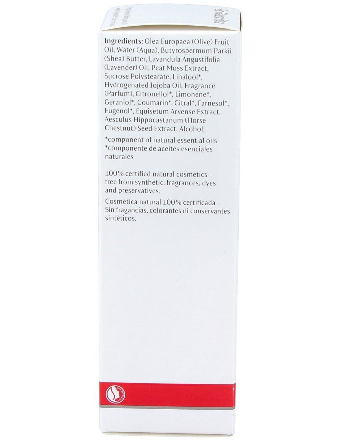 Olea Europaea Fruit Oil, Aqua, Butyrospermum Parkii Butter, Lavandula Angustifolia Oil, Peat Moss Extract, Sucrose Distearate, Linalool*, Hydrogenated Jojoba Oil, Parfum, Citronellol*, Limonene*, Geraniol*, Coumarin*, Citral*, Farnesol*, Eugenol*, Equisetum Arvense Extract, Aesculus Hippocastanum Seed Extract, Alcohol.*componente natural de aceites esenciales
