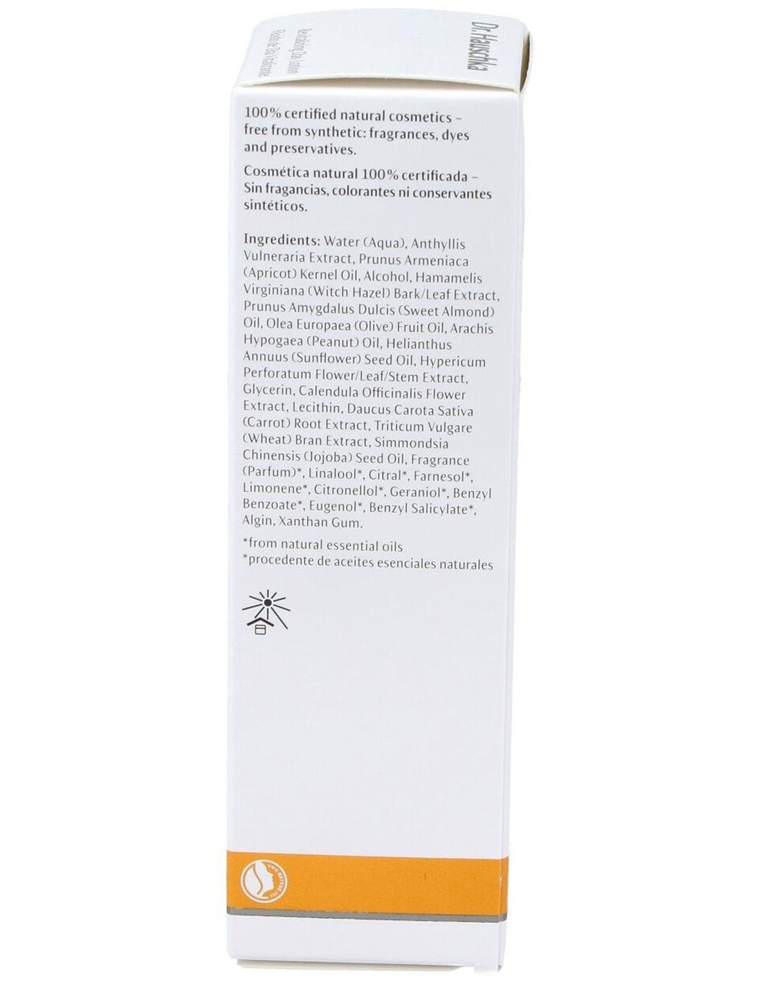 Aqua, Anthyllis Vulneraria Extract, Prunus Armeniaca Kernel Oil, Alcohol, Hamamelis Virginiana Bark/Leaf Extract, Prunus Amygdalus Dulcis Oil, Olea Europaea Fruit Oil, Arachis Hypogaea Oil, Helianthus Annuus Seed Oil, Hypericum Perforatum Flower/Leaf/Stem Extract, Glycerin, Calendula Officinalis Flower Extract, Lecithin, Daucus Carota Sativa Root Extract, Triticum Vulgare Bran Extract, Simmondsia Chinensis Seed Oil, Parfum*, Linalool*, Citral*, Farnesol*, Limonene*, Citronellol*, Geraniol*, Benzyl Benzoate*, Eugenol*, Benzyl Salicylate*, Algin, Xanthan Gum.