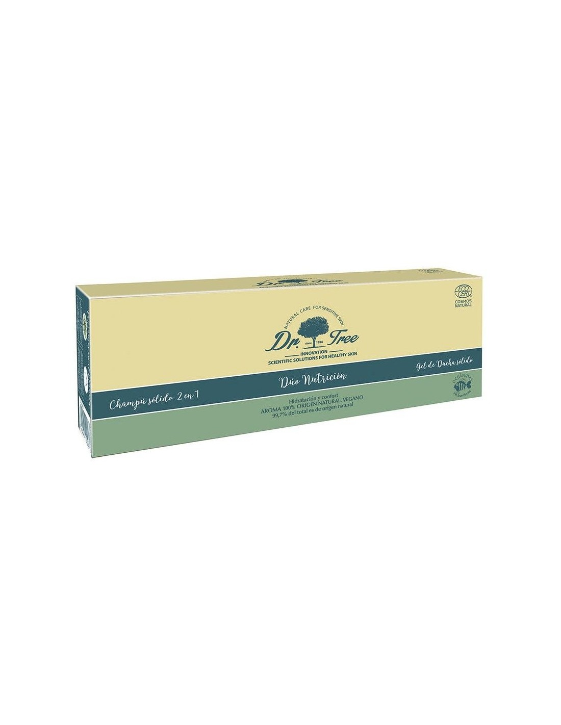 DR. TREEContiene:\ - Champú Solido Nutrición 2 en 1, especialmente formulado con agentes de limpieza derivados del coco que limpian y acondicionan el cabello en profundidad.\ - Gel Sólido Nutrición hidrata, que regenera y calma la piel.
