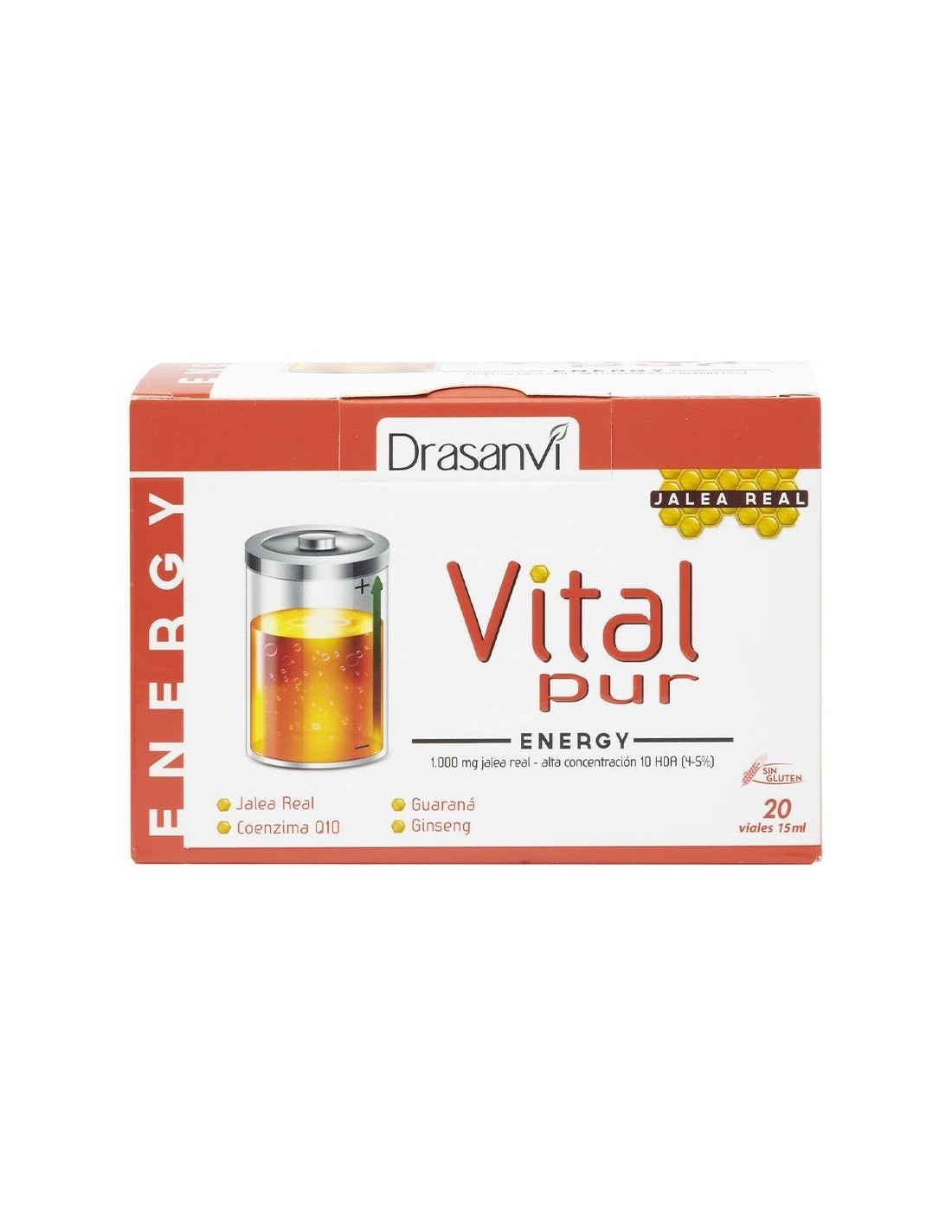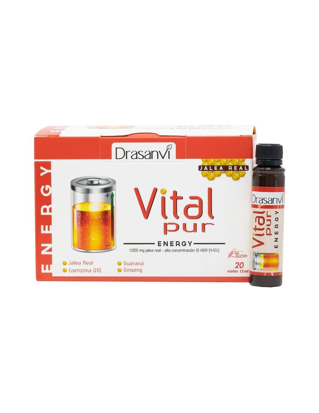 Complemento que ayuda a disminuir el cansancio y la fatiga. Basa su formulación en la Jalea Real (1000 mg) reforzada con minerales como el Hierro. El Hierro es un mineral de gran importancia ya que ayuda a disminuir el cansancio y la fatiga. Complementan la acción la Vitamina B3, Vitamina B5, Vitamina B1, Vitamina B6 (contribuye al metabolismo energético normal) Vitamina B2, extractos vegetales como el Ginseng, Eleuterococco y Guaraná. Vitalpur Energy, no lleva azúcares añadidos, y opta por la Stevia (Edulcorante extraído de las hojas de una planta).