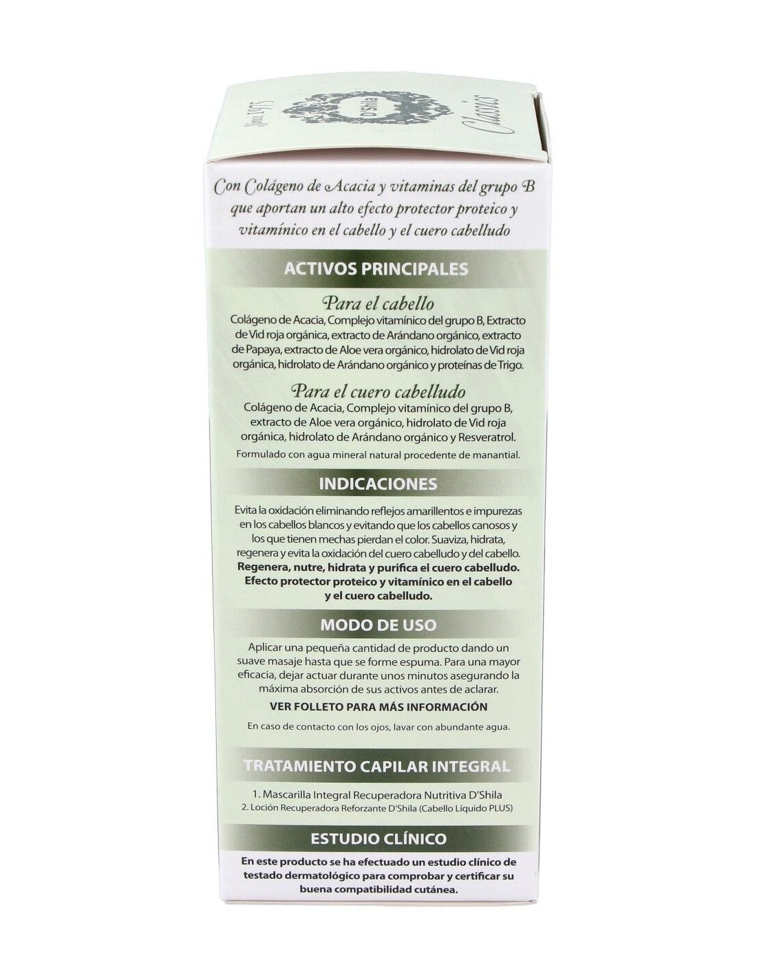 Ayuda a recuperar y potenciar el color. En los cabellos blancos, ayuda a eliminar los reflejos amarillentos y las impurezas, reavivando su color natural. En los cabellos teñidos y en aquellos con mechas rubias, realza su luminosidad y evita que se oxiden y pierdan color. Suavizante, regenerador, hidratante y antioxidante del cuero cabelludo.
