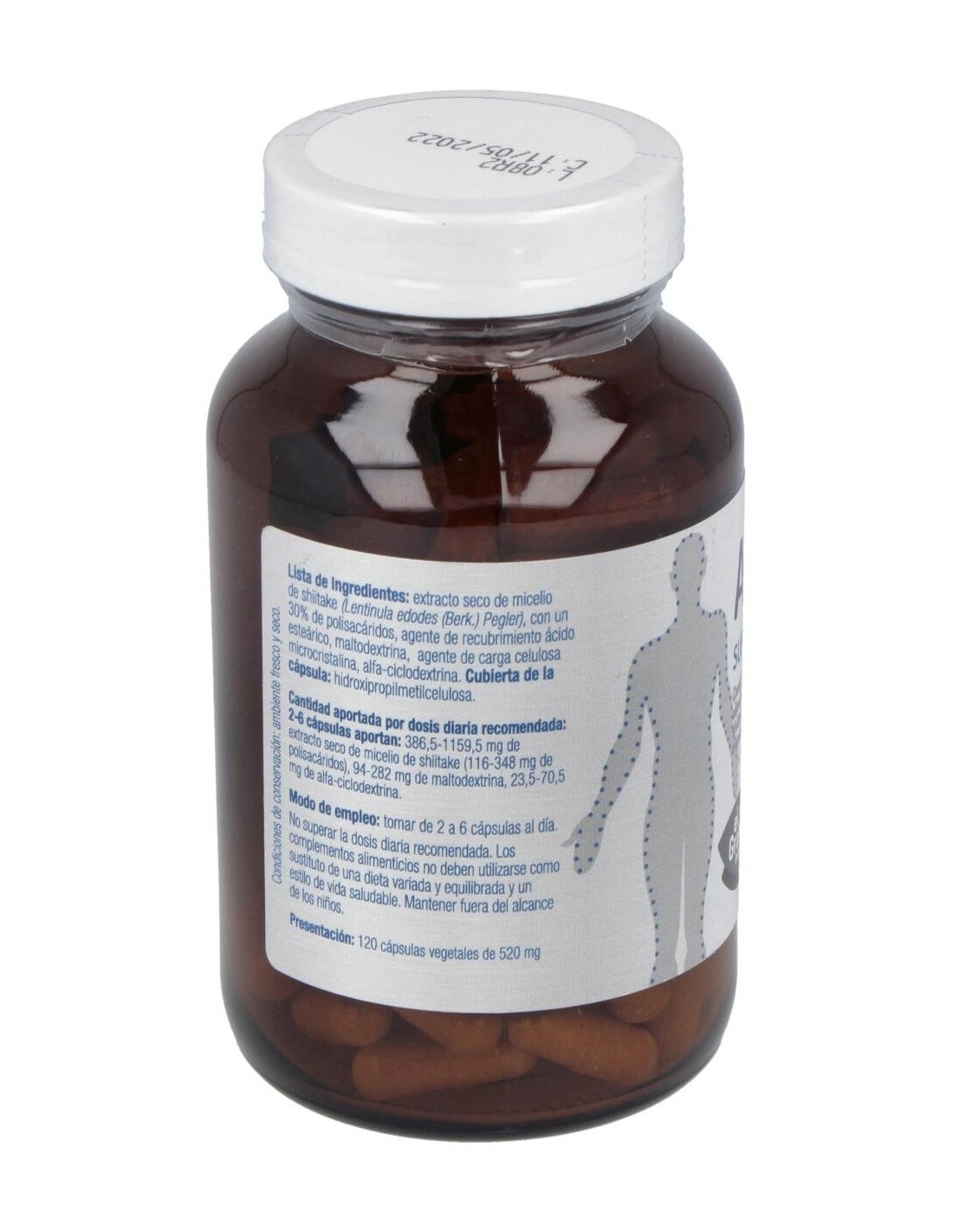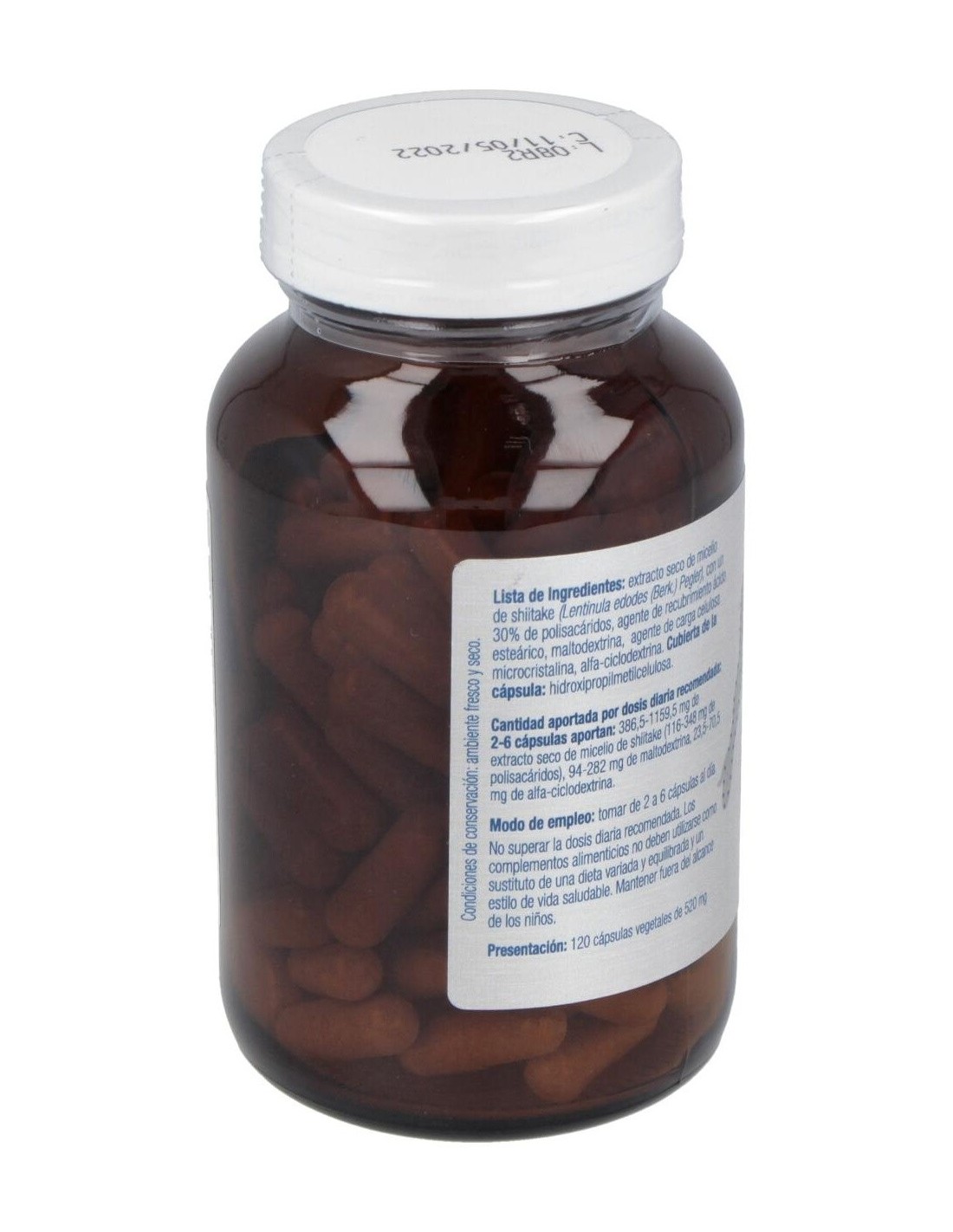 Extracto seco de micelio de shiitake (Lentinula edodes (Berk.) Pegler), con un 30% de polisacáridos, agente de recubrimiento ácido esteárico, maltodextrina, agente de carga celulosa microcristalina, alfa-ciclodextrina. Cubierta de la cápsula: espesante hidroxipropilmetilcelulosa.