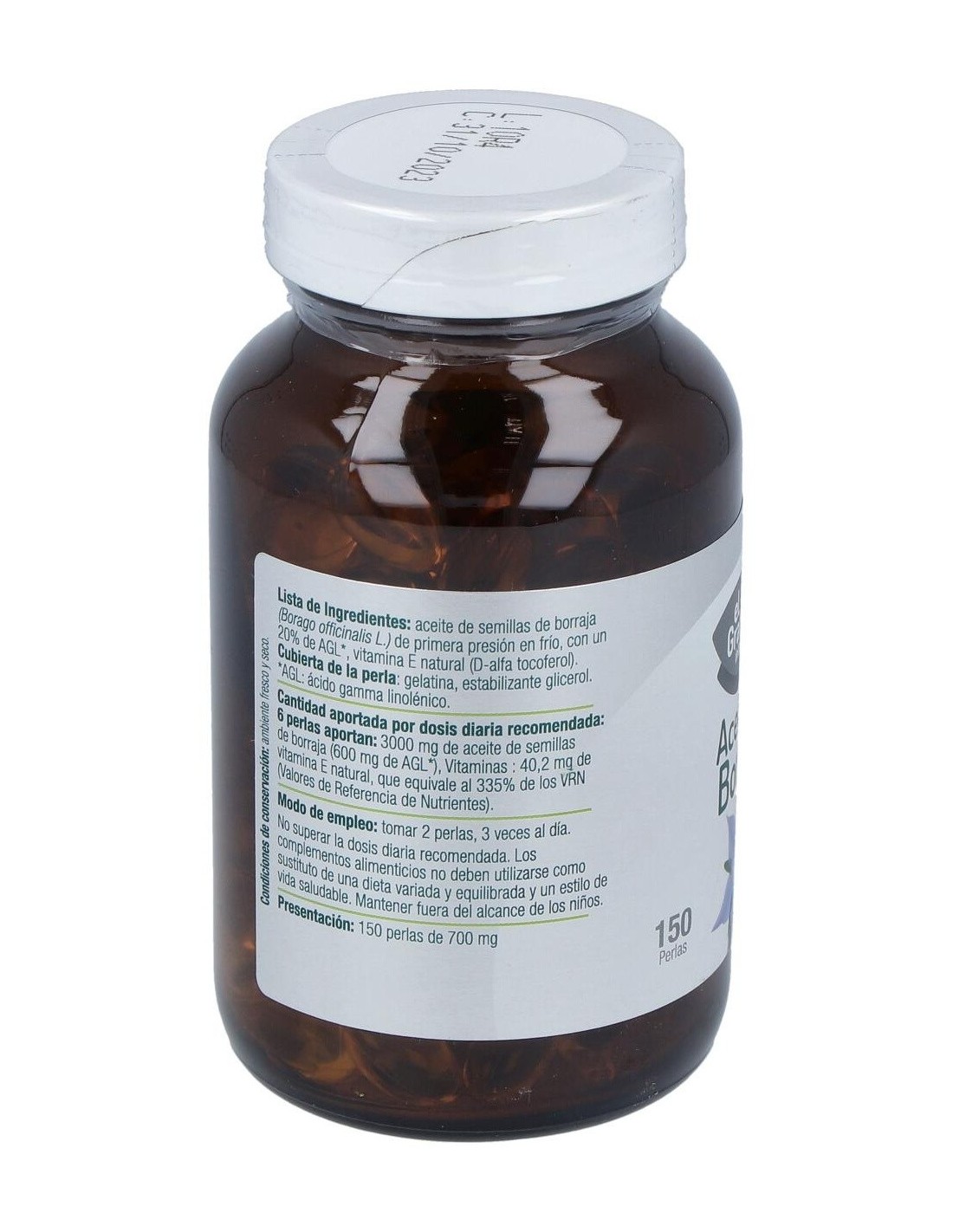ACEITE DE SEMILLAS DE BORRAJA (BORAGO OFFICINALIS L.) DE PRIMERA PRESIÓN EN FRÍO, CON UN 20% DE AGL, VITAMINA E NATURAL (D-ALFA TOCOFEROL). CUBIERTA DE LA PERLA: GELATINA, ESTABILIZANTE GLICEROL. AGL: ÁCIDO GAMMA LINOLÉNICO.
