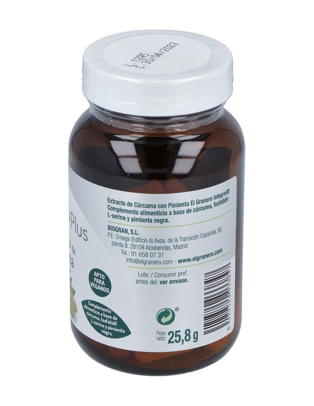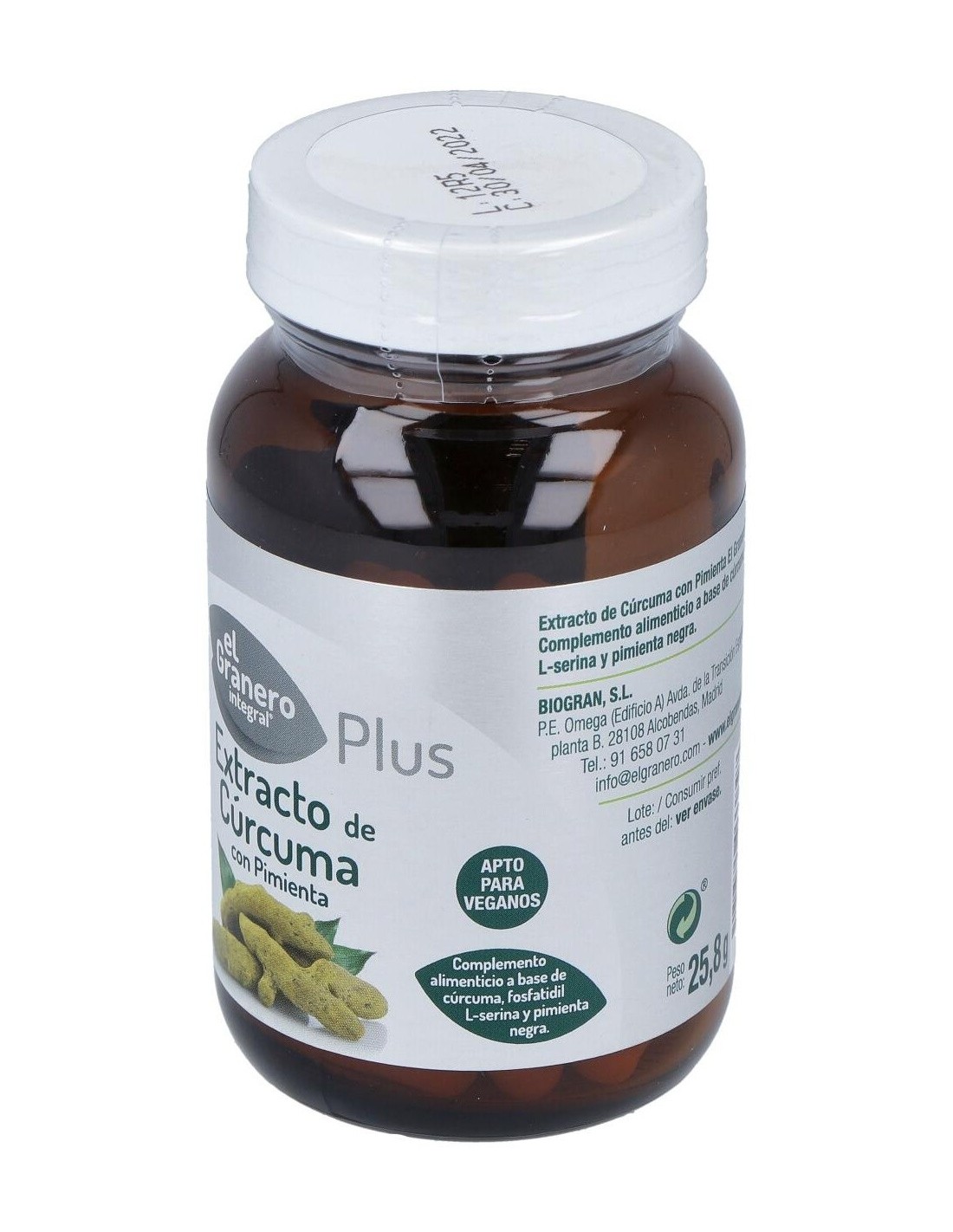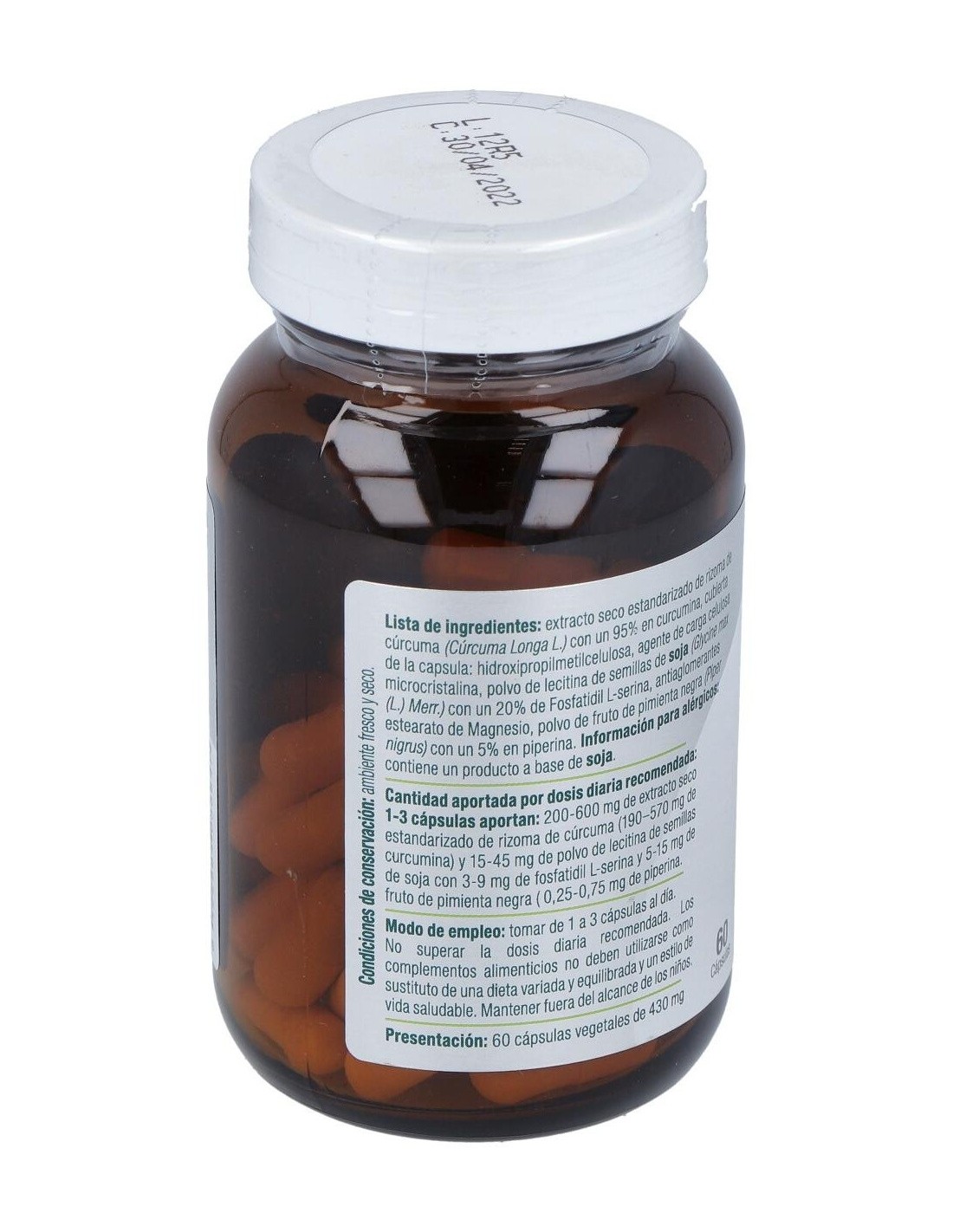 Es un complemento alimenticio que ha sido elaborado a base de cúrcuma, pimienta negra y fosfatidil L-serina. La curcumina que se encuentra en la raíz de la cúrcuma es el principio activo clave de esta planta y la responsable de su color amarillo brillante. La curcumina puede inhibir compuestos involucrados en el dolor articular. Para aliviar molestias articulares como la rigidez, se combinan con frecuencia la cúrcuma con sulfato de glucosamina. La cúrcuma también se está utilizando cada vez más en formulaciones para mejorar los problemas de espalda. A este producto se le añadido pimienta para una correcta absorción de sus principios activos.