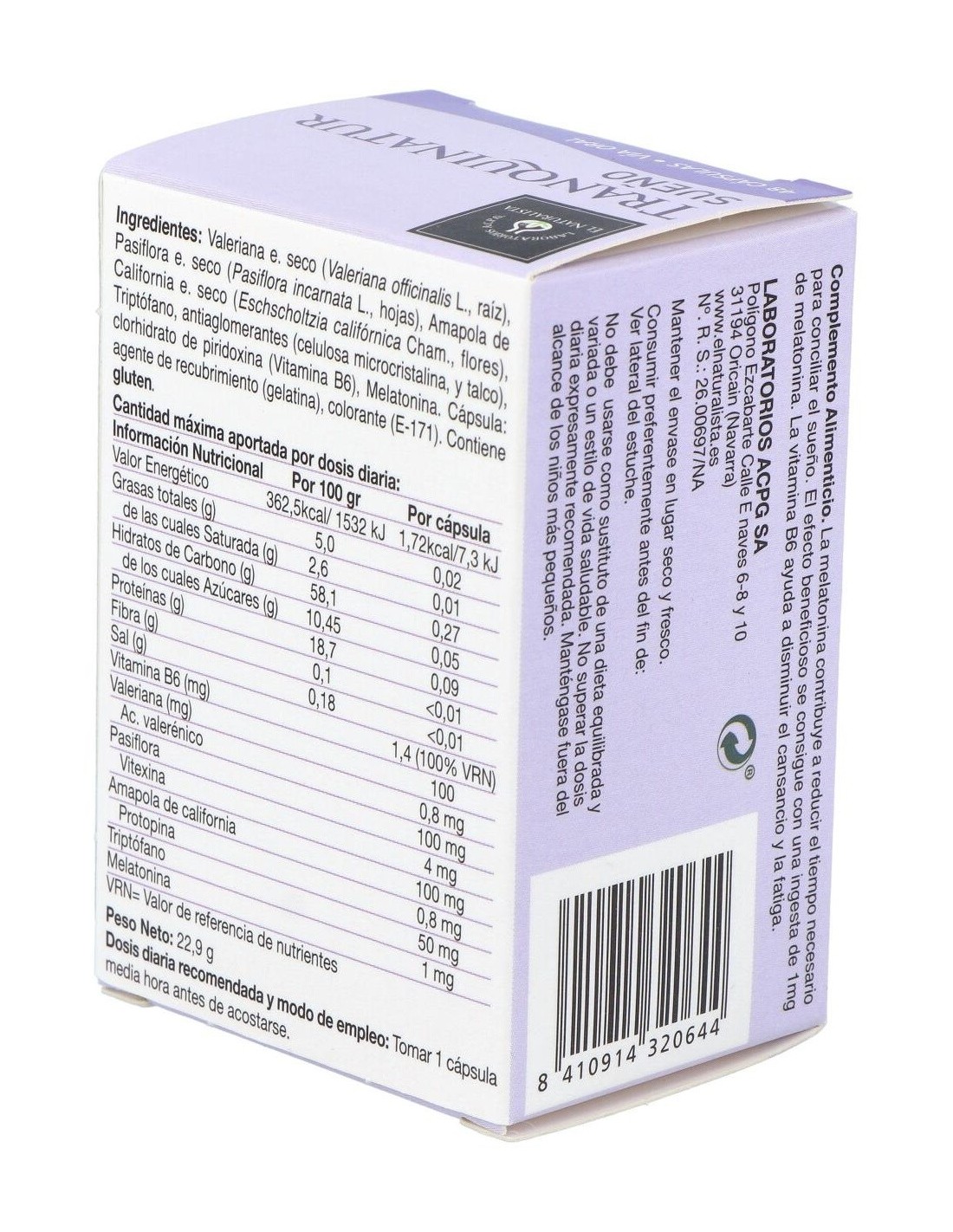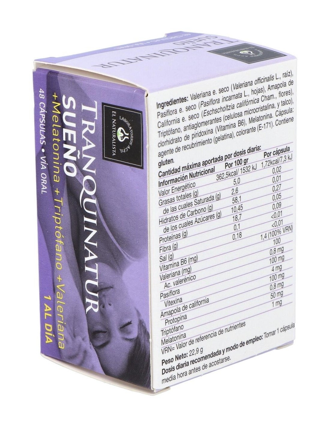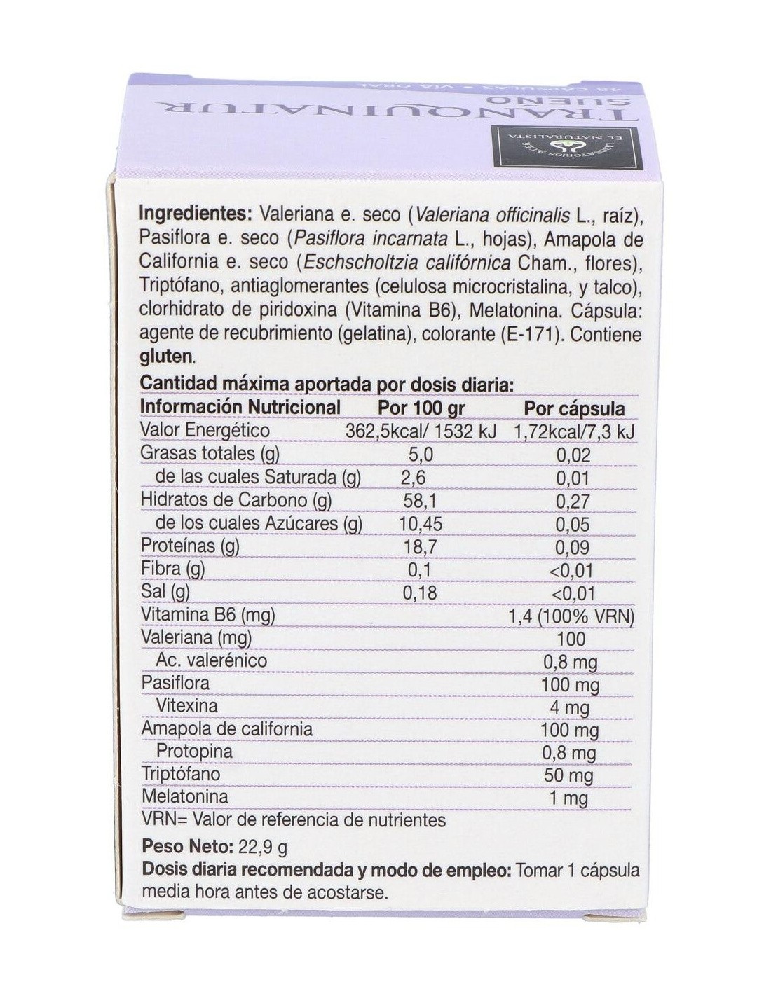 EL NATURALISTACombina las propiedades sedantes de las plantas (Valeriana, Pasiflora y Amapola de California) con las acciones del triptófano y de la melatonina que están directamente relacionadas con la dificultad para conciliar el sueño. Combina las propiedades sedantes de las plantas (Valeriana, Pasiflora y Amapola de California) con las acciones del triptófano y de la melatonina que están directamente relacionadas con la dificultad para conciliar el sueño.