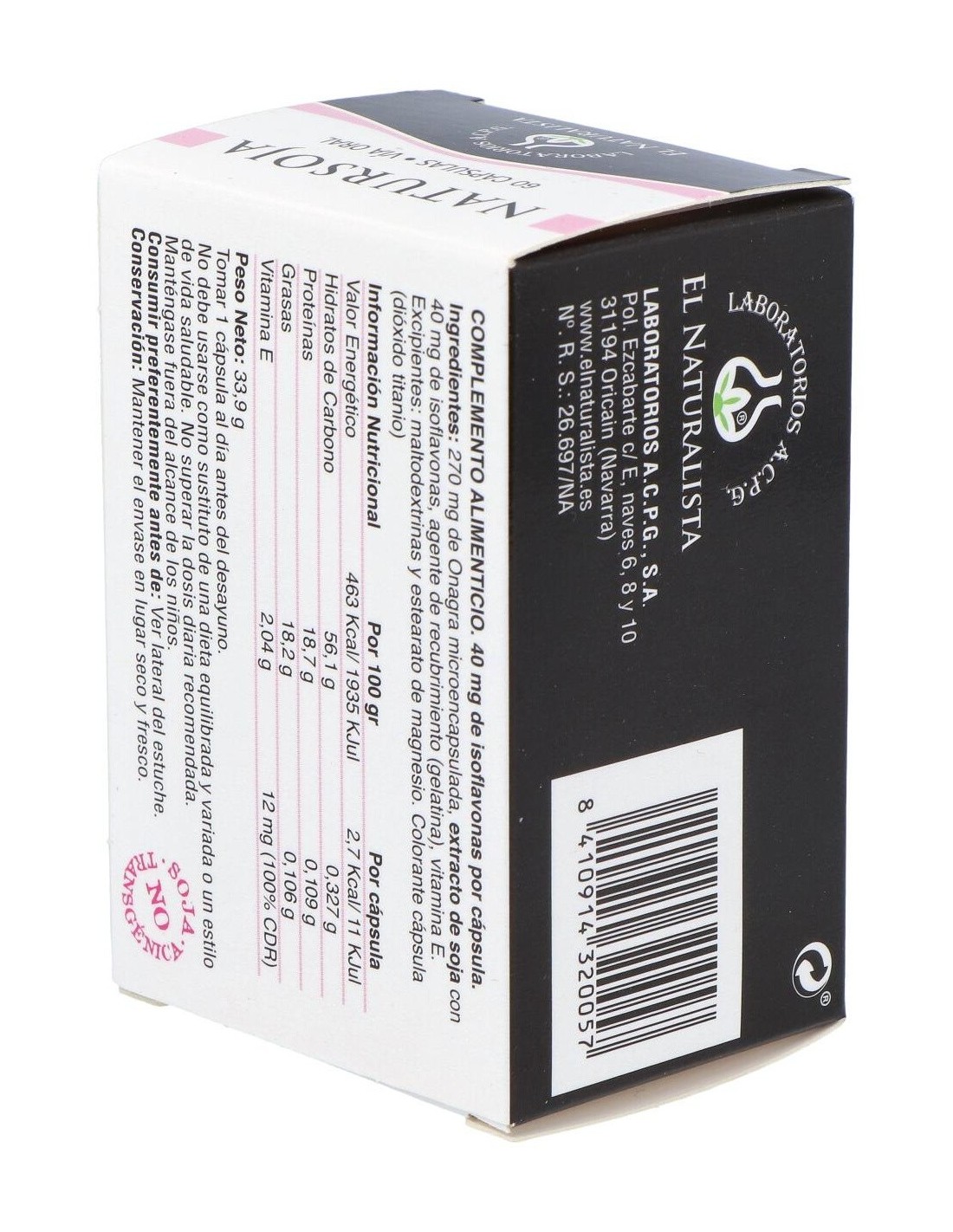 EL NATURALISTAProducto a base de extracto de soja rico en isoflavonas, aceite de onagra microencapsulado y vitamina E natural. Ayuda en el tratamiento de los síntomas vasomotores de la menopausia (sofocos, sudores nocturnos, palpitaciones).