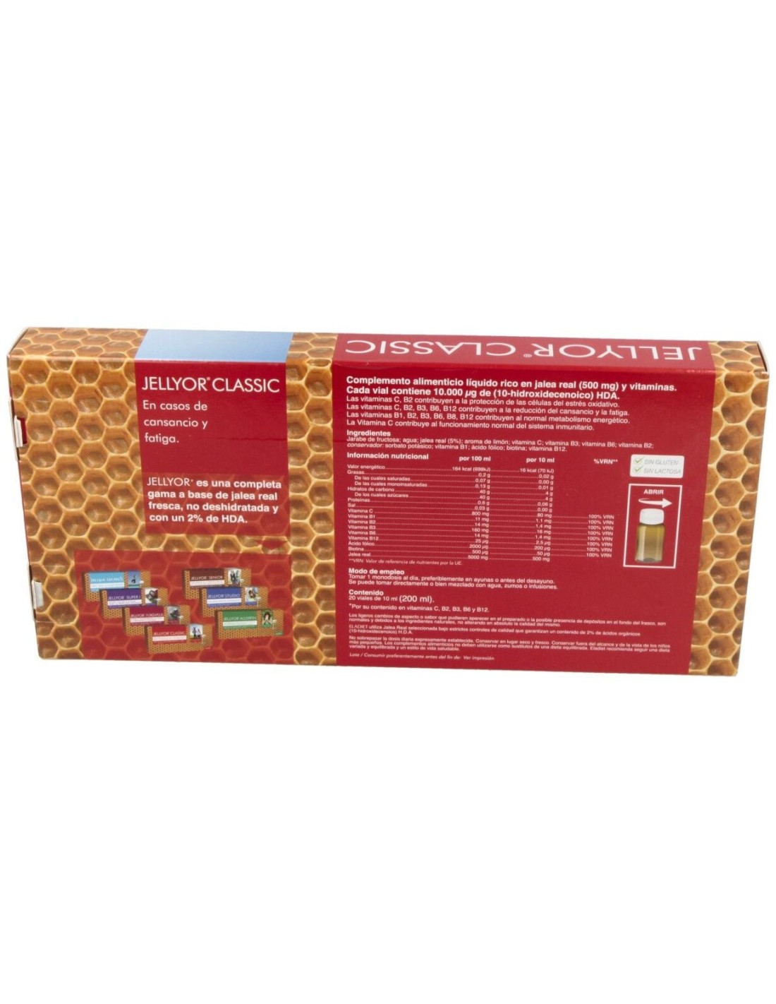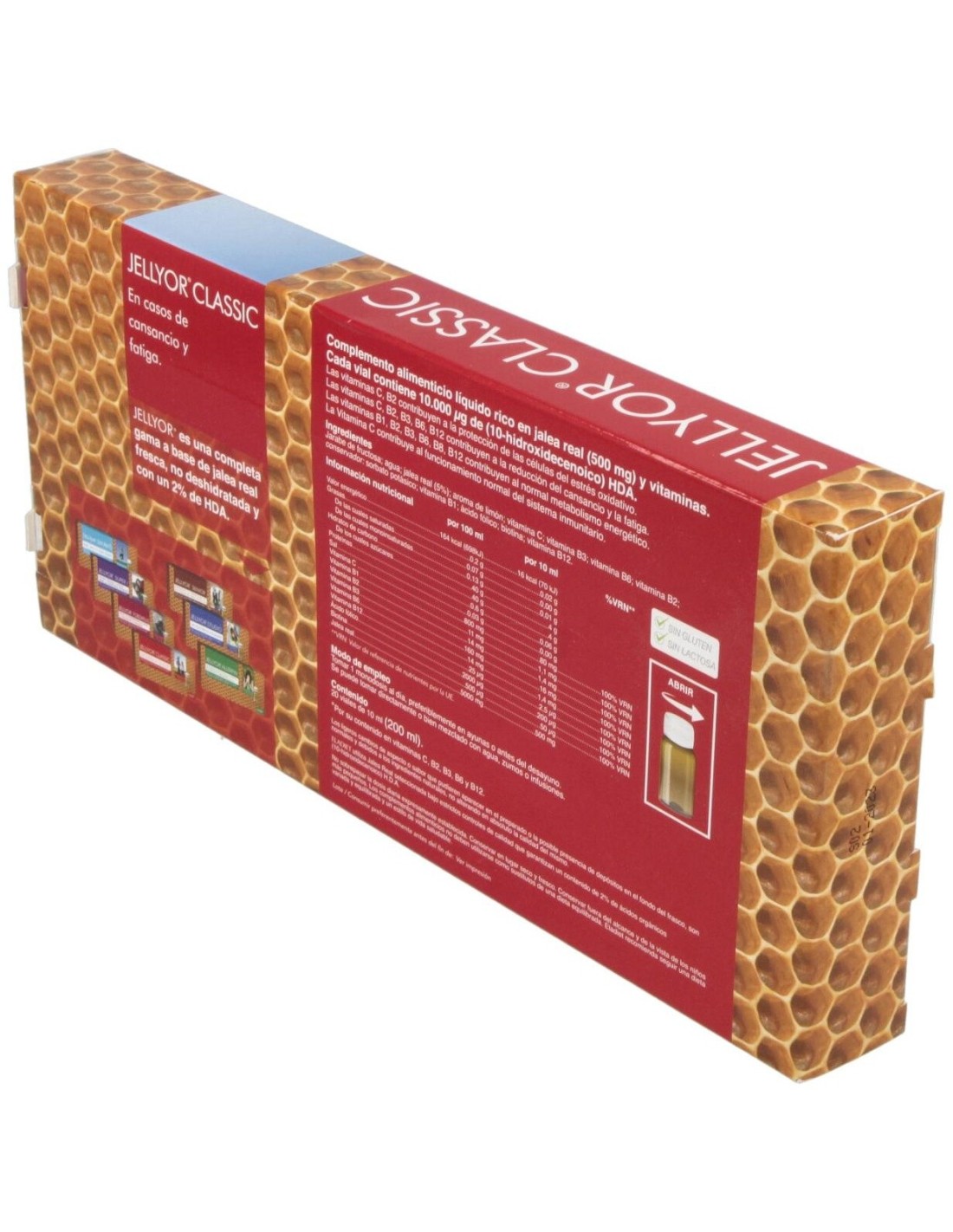 Jellyor classic es un complemento alimenticio líquido que permite reducir el cansancio durante periodos de sobre esfuerzo mental, físico, etapas de crecimiento o incluso, la fatiga derivada por la falta de apetito. Su principal ingrediente, la jalea real, posee propiedades que proporcionan una gran cantidad de energía evitando cuadros de fatiga.