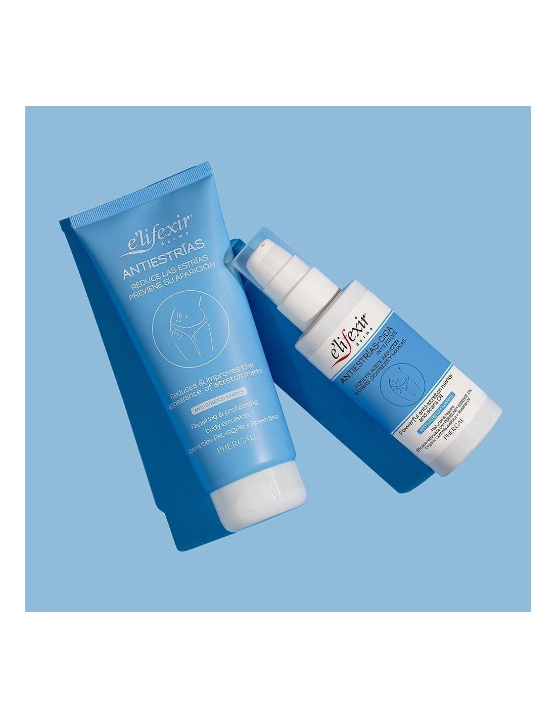 ELIFEXIRGel en crema fresco que actúa en las 3 etapas de formación de las estrías garantizando una acción total. Sus activos frenan el proceso de formación de las estrías, inician la regeneración del tejido dañado y por último hidratan en profundidad para prevenir su futura aparición.