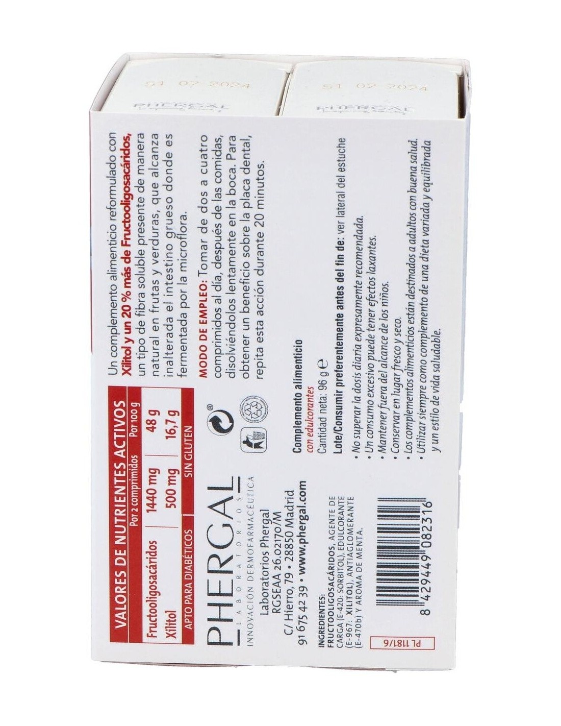 Fructooligosacáridos, agente de carga ((E-420: sorbitol), edulcorante (E-967: xilitol), edulcorante (E-967), antiglomerante (E-470b) y aroma de menta.