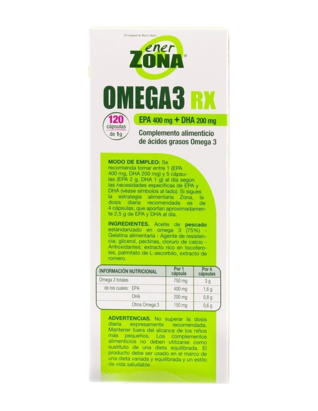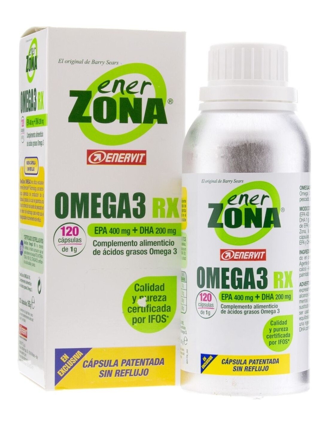ENERZONASuplemento dietético de ácidos grasos omega 3. Contiene EPA y DHA en una proporción de 2:1. Certificado por 3 organismos internacionales ( IFOS, ORIVO y Friend of the Sea). Una cápsula patentada sin sabor residual. EnerZona Omega 3 RX , ayuda a cubrir la necesidad de estos ácidos grasos en caso de ingesta reducida o mayor necesidad. EPA y DHA contribuyen a mantener el funcionamiento normal del corazón, cerebro y visión y a mantener niveles normales de triglicéridos en sangre.