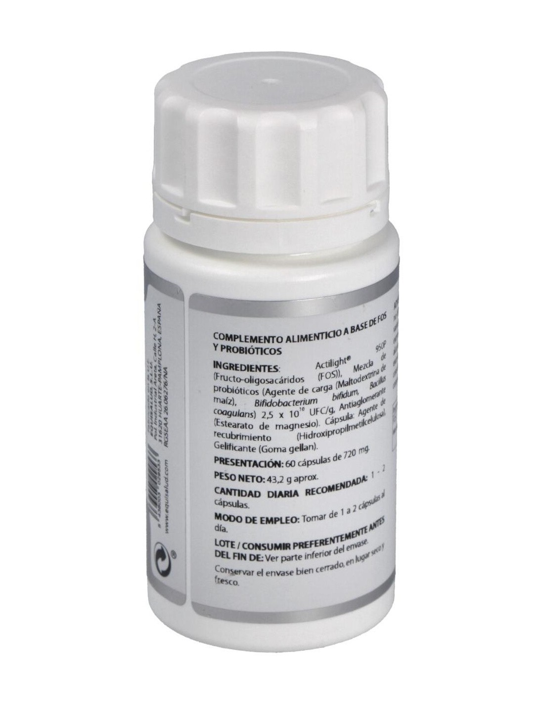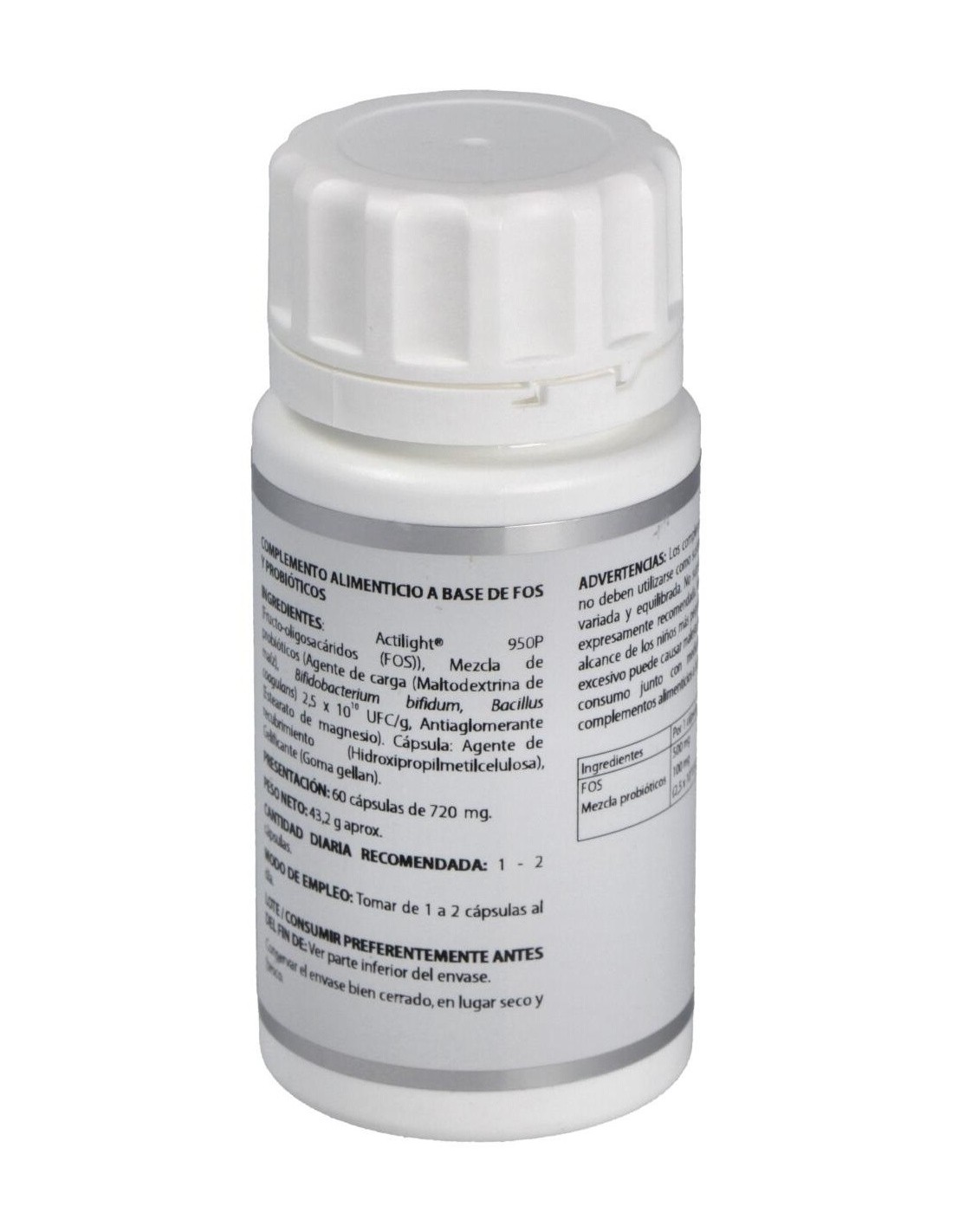 Actilight® 950P (Fructo-oligosacáridos (FOS)), 500 mg: mezcla de probióticos (maltodextrina de maíz (agente de carga), Bifidobacterium bifidum, Bacillus coagulans) 2,5x1010 UFC/g, 100 mg. Excipiente tecnológico: estearato de magnesio (antiaglomerante), c.s. Envoltura: agente de recubrimiento (hidroxipropilmetilcelulosa) y gelificante (goma gellan).