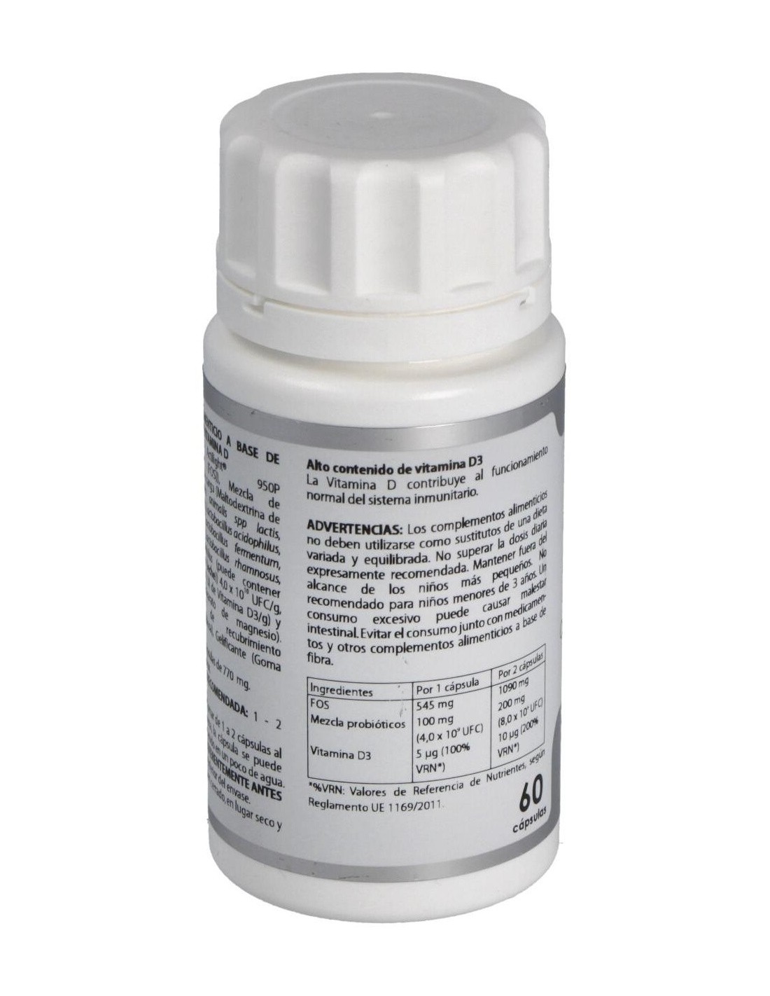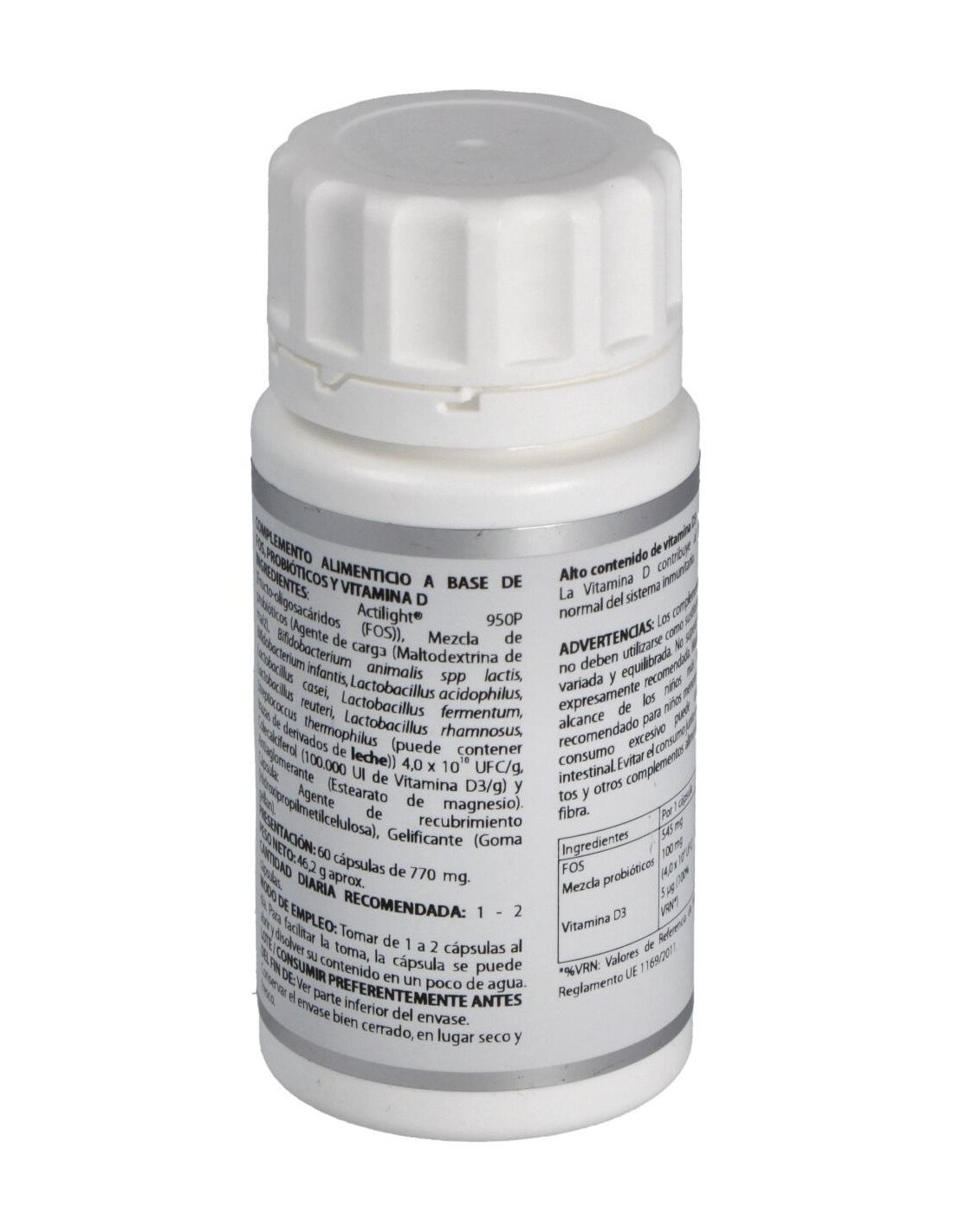 ACTILIGHT® 950P (FRUCTO-OLIGOSACÁRIDOS (FOS)), 545 MG; MEZCLA DE PROBIÓTICOS (MALTODEXTRINA DE MAÍZ (AGENTE DE CARGA), BIFIDOBACTERIUM ANIMALIS SPP LACTIS, BIFIDOBACTERIUM INFANTIS, LACTOBACILLUS ACIDOPHILUS, LACTOBACILLUS CASEI, LACTOBACILLUS FERMENTUM, LACTOBACILLUS REUTERI, LACTOBACILLUS RHAMNOSUS, STREPTOCOCCUS THERMOPHILUS) 4,0X1010 UFC/G, 100 MG; COLECALCIFEROL (>100.000 UI DE VITAMINA D3/G), 2 MG. EXCIPIENTE TECNOLÓGICO: ESTEARATO DE MAGNESIO (ANTIAGLOMERANTE), C.S. Envoltura: AGENTE DE RECUBRIMIENTO (HIDROXIPROPILMETILCELULOSA) Y GELIFICANTE (GOMA GELLAN).