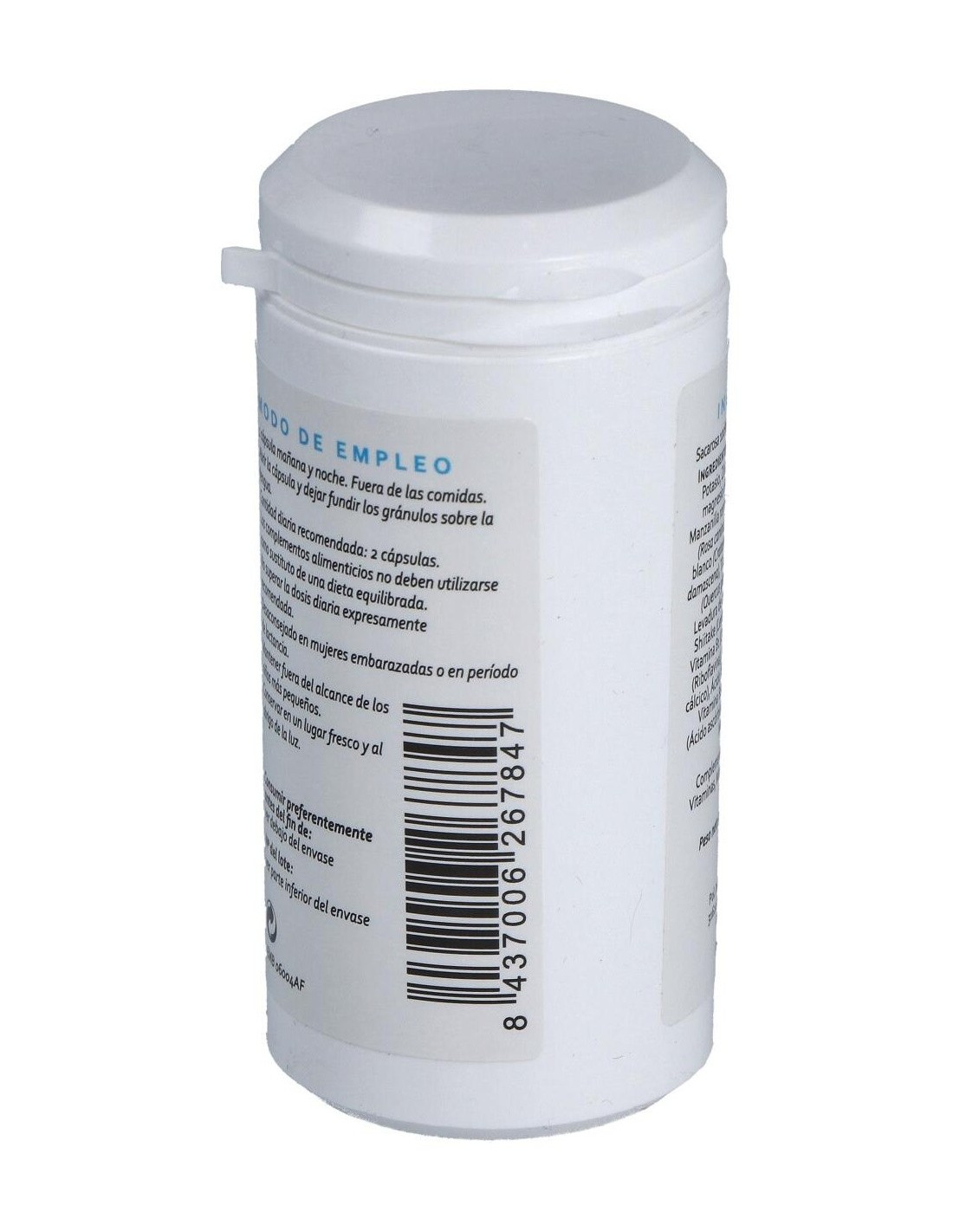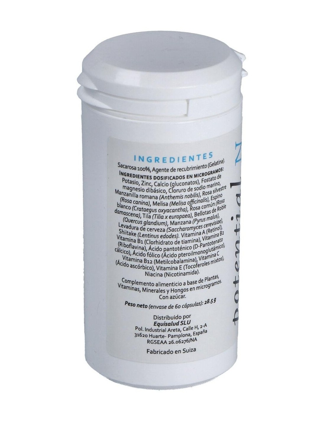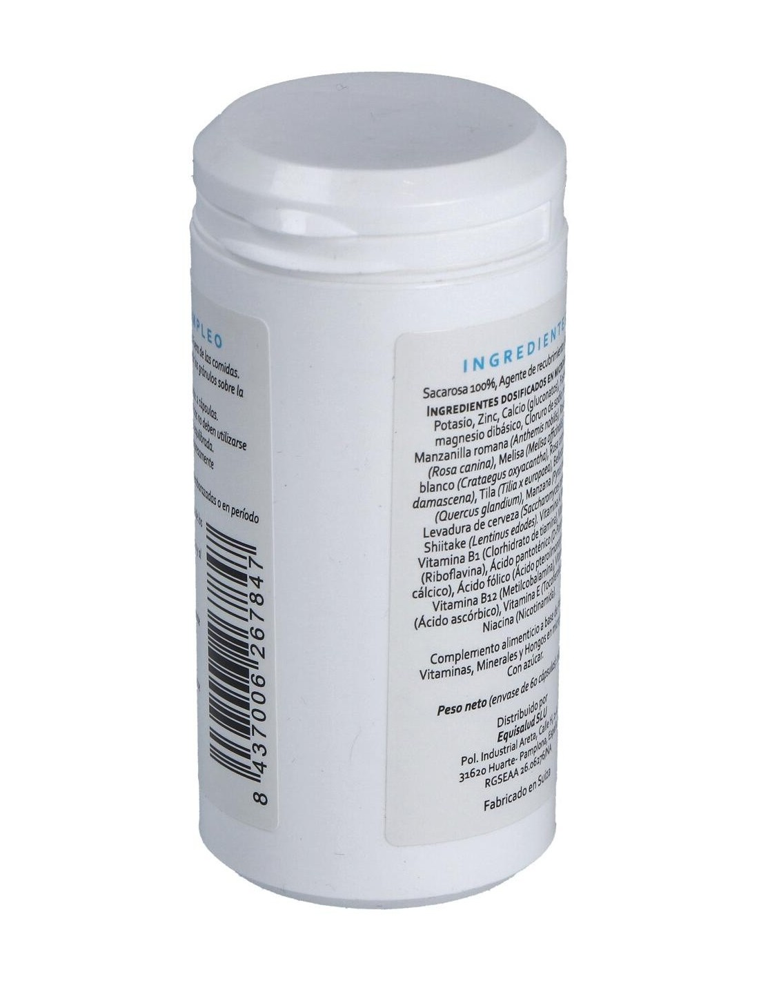 Potasio, Zinc, Calcio (gluconatos), Fosfato de magnesio dibásico, Cloruro de sodio marino. Manzanilla romana (Anthemis nobilis), Rosa silvestre (Rosa canina), melisa (Melissa officinalis), Espino blanco (Crataegus oxycantha), Rosa común (Rosa damascena), Tila (Tilia x europaea), Bellotas de Roble (Querqus glandium), Manzana (Pyrus malus), Levadura de cerveza (Saccharomyces cerevisiae). Shiitake (Lentinus Edodes) Vitaminas: Vitamina A (Retinol), Vitamina B1 (Clorhidrato de tiamina), Vitamina B2 (Riboflavina), Ácido pantoténico (D-Pantotenato cálcico), Ácido fólico (Ácido pteroilmonoglutámico), Vitamina B12 (Metilcobalamina), Vitamina C (Ácido ascórbico), Vitamina E (Tocoferoles mixtos), Niacina (Nicotinamida). Envoltura: agente de recubrimiento (gelatina), sacarosa 100%.