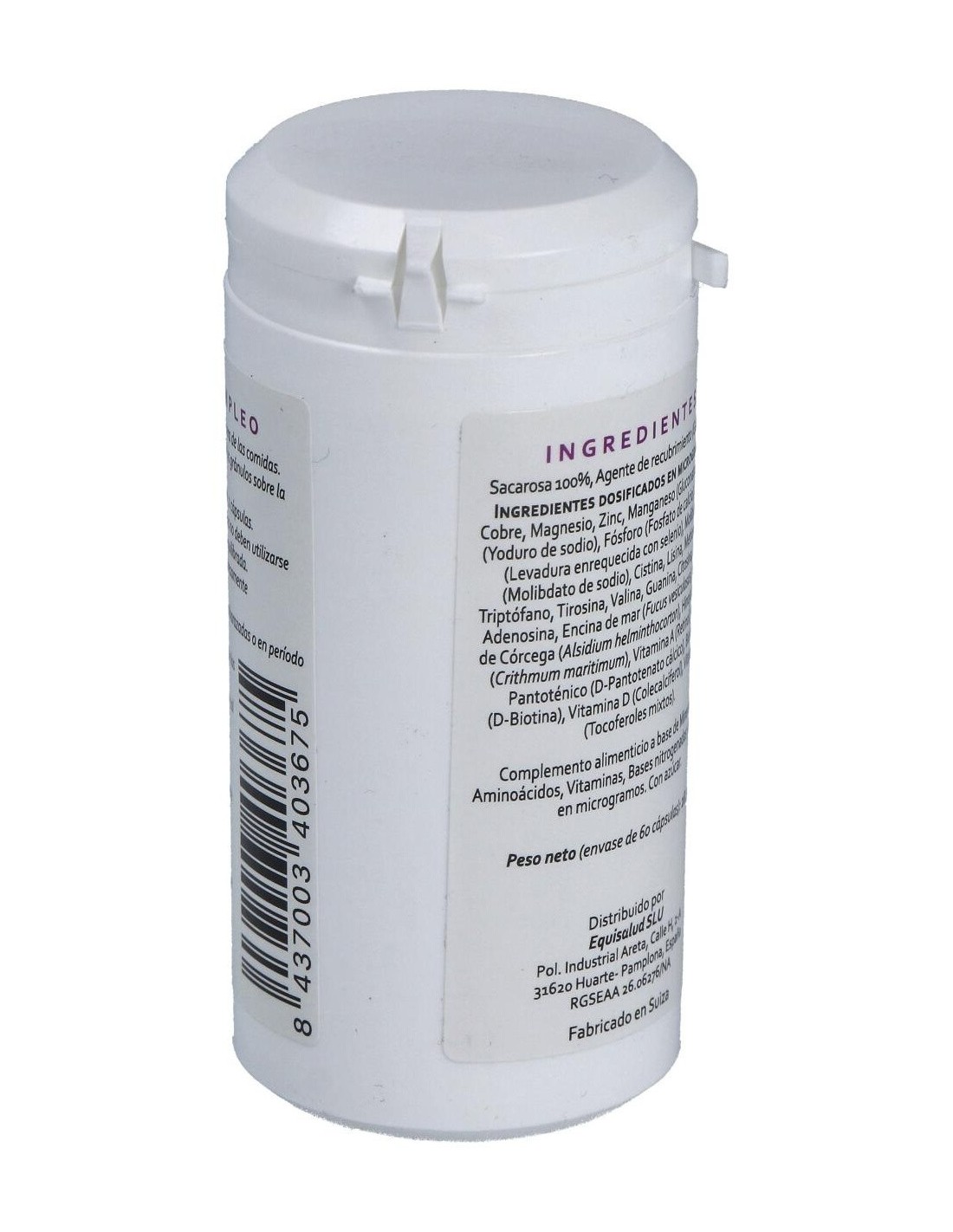 Cobre, magnesio, zinc, manganeso (gluconatos), yodo (yoduro de sodio), fósforo (fosfato de calcio), selenio (levadura enriquecida con selenio), molibdeno (molibdato de sodio). Cistina, lisina, metionina, triptófano, tirosina, valina, guanina, citosina, uracilo, adenosina. Encina de mar (Fucus vesiculosus), musgo de Córcega (Alsidium helminthocorton), hinojo marino (Crithmum maritimum). Vitamina A (retinol), biotina (D-biotina), vitamina D (colecalciferol), vitamina E (mezcla de tocoferoles), ácido pantoténico (D-pantotenato cálcico). Agente de recubrimiento (gelatina), sacarosa 100%.