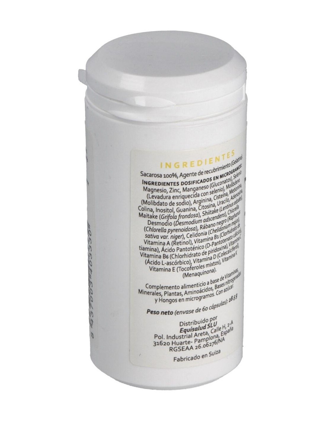 Minerales: magnesio, zinc y manganeso (gluconatos), selenio (levadura enriquecida con selenio), molibdeno (molibdato de sodio). Aminoácidos: arginina, cisteína, metionina, colina, inositol, guanina, citosina, uracilo, adenosina. Plantas: desmodio (Desmodium adscendens), chlorella (Chlorella pyrenoidosa), rábano negro (Raphanus sativus var. niger), celidonia (Chelidonium majus). Hongos: maitake (Grifola frondosa), shiitake (Lentinus edodes). Vitaminas: vitamina A (retinol), vitamina B1 (clorhidrato de tiamina), ácido pantoténico (D-pantotenato cálcico), vitamina B6 (clorhidrato de piridoxina), vitamina C (ácido L-ascórbico), vitamina D (colecalciferol), vitamina E (mezcla de tocoferoles), vitamina K (menaquinona). Envoltura: Agente de recubrimiento (gelatina), sacarosa 100%.