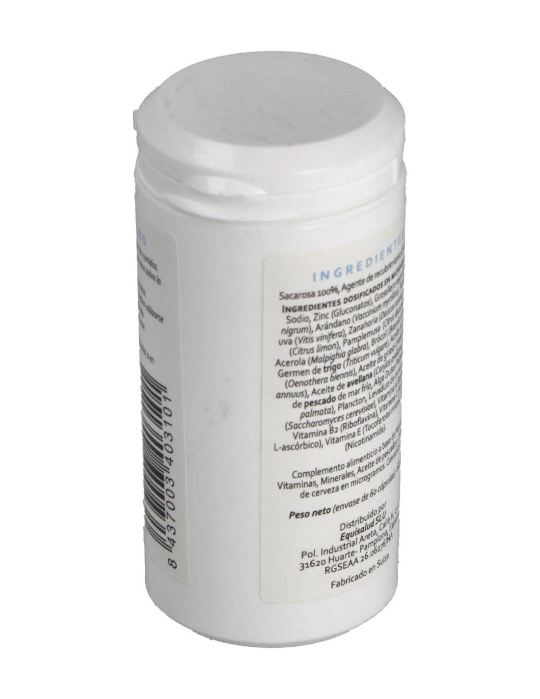 Minerales: sodio y zinc (gluconatos). Plantas: grosellero negro (Ribes nigrum), arándano (Vaccinium myrtillus), semilla de uva (Vitis vinifera), zanahoria (Daucus carota), limón (Citrus × limon), pamplemusa (Citrus decumana), acerola (Malpighia glabra), brócoli (Brassica species), germen de trigo (Triticum vulgare), aceite de onagra (Oenothera biennis), aceite de girasol (Helianthus annuus), aceite de avellana (Corylus avellana), aceite de pescado de mar frío, alga dulse (Palmaria palmata), plancton, levadura de cerveza (Saccharomyces cerevisiae). Vitaminas: vitamina A (retinol), vitamina B2 (riboflavina), vitamina E (mezcla de tocoferoles), vitamina C (ácido L-ascórbico), niacina (nicotinamida). Envoltura: Agente de recubrimiento (gelatina), sacarosa 100%.