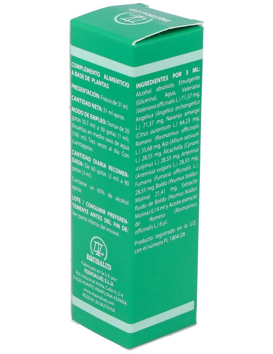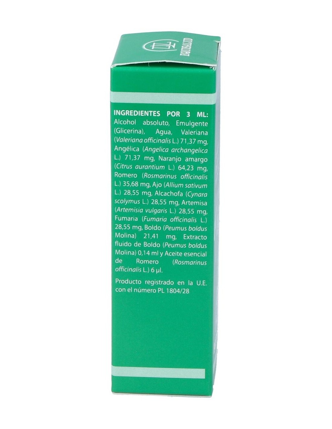 Valeriana (Valeriana officinalis L.), angélica (Angelica archangelica L.), naranjo amarga (Citrus aurantium L.), romero (Rosmarinus officinalis L.), ajo (Allium sativum L.), alcachofa (Cynara scolymus L.), artemisa (Artemisia vulgaris L.), fumaria (Fumaria officinalis L.) y boldo (Peumus boldus Molina). Diluyentes: alcohol absoluto, glicerina y agua purificada.