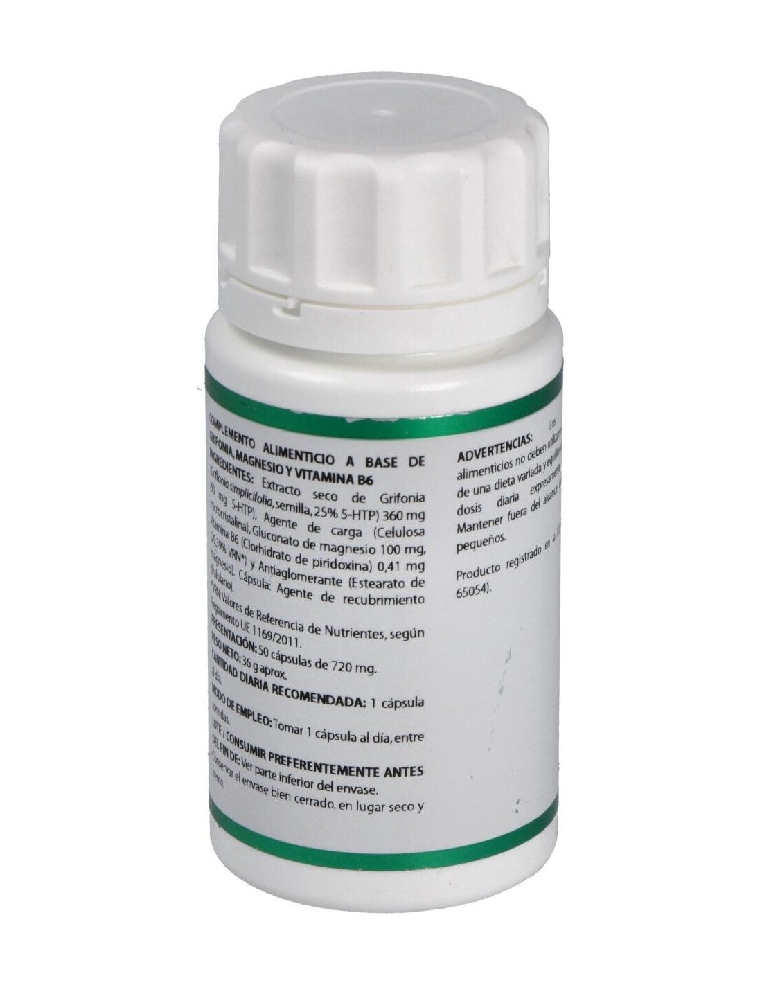 Complemento alimenticio a base de grifonia, magnesio y vitamina B6. La grifonia es rica en 5-HTP que es un precursor de la serotonina, metabolito intermedio entre el triptófano y la serotonina. En el organismo humano el 5-http rápidamente se convierte en serotonina. Esta sustancia es un neurotransmisor imprescindible para lograr la transmisión nerviosa. Apto para vegetarianos, diabéticos y pacientes con dietas restrictivas.