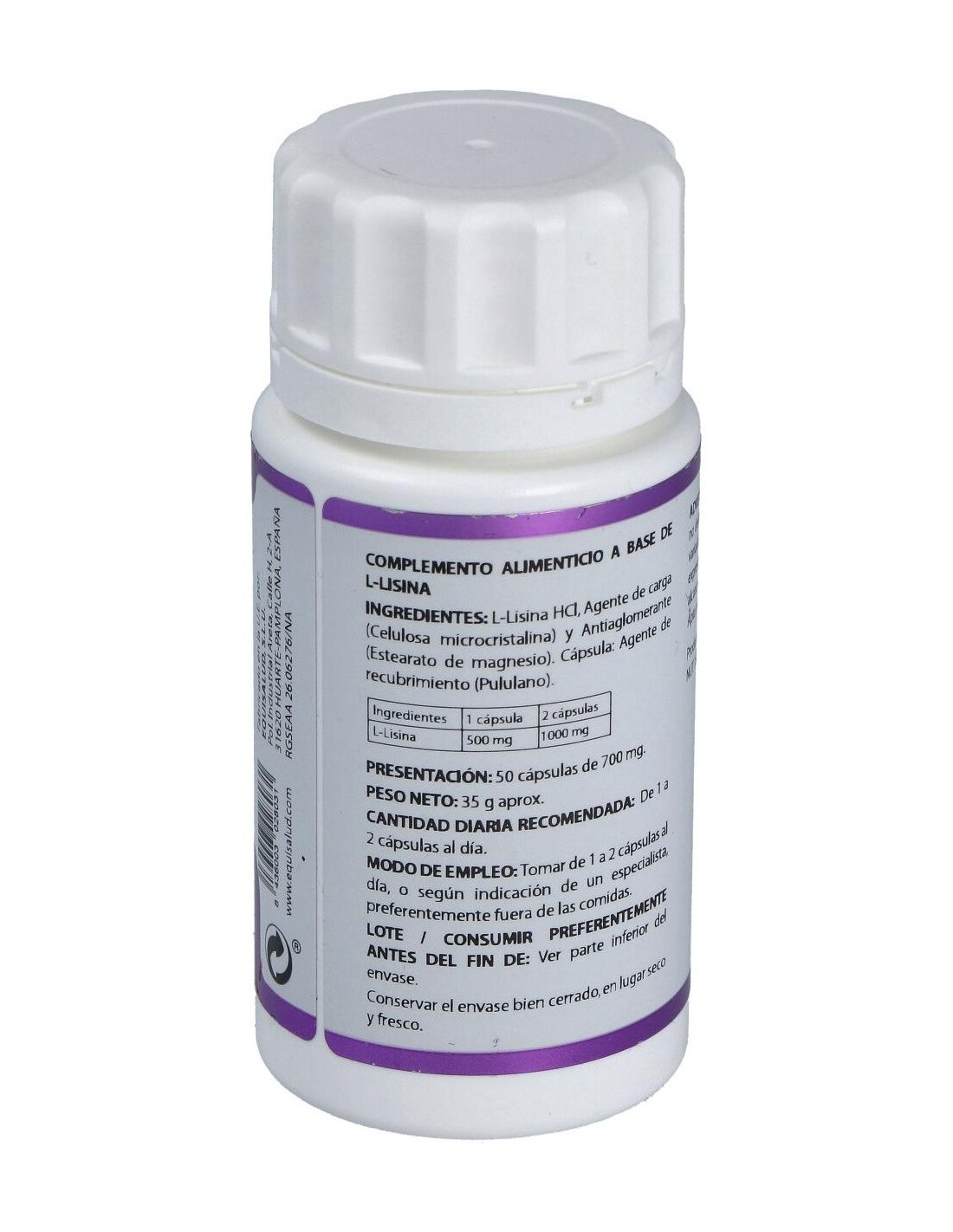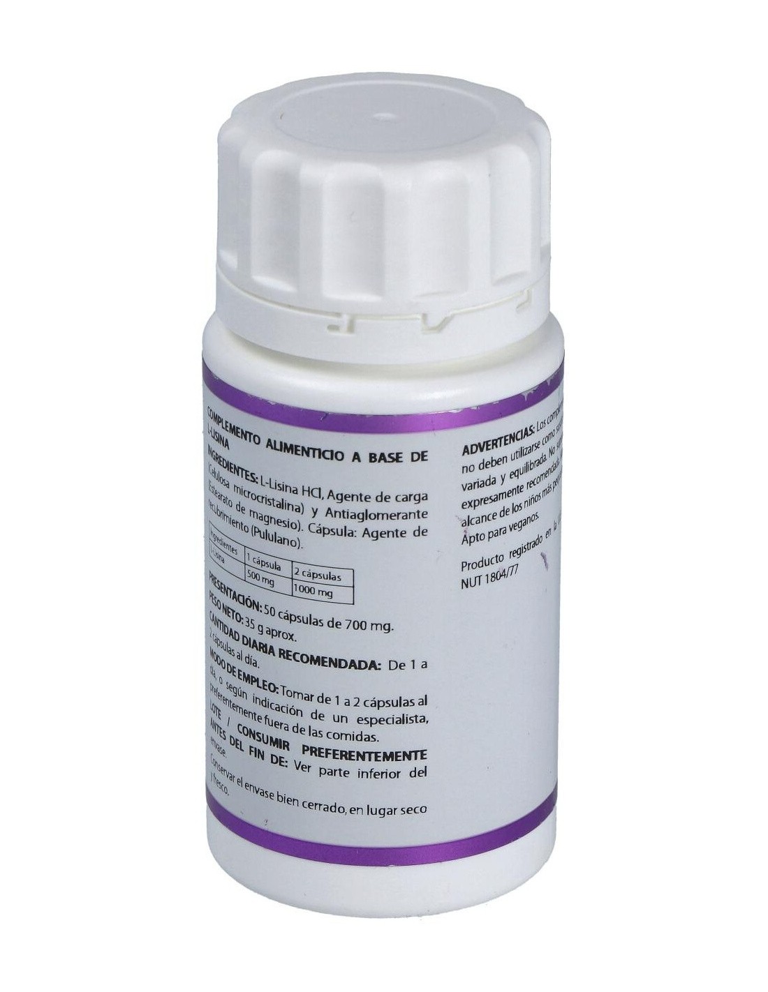 La L-Lisina interviene en el crecimiento y reparación de tejidos y en la producción de enzimas, hormonas y anticuerpos. Se encuentra en grandes cantidades en el tejido muscular, por lo que es necesaria cuando se desea un crecimiento del mismo. En los últimos años se ha puesto en evidencia un posible papel beneficioso de la L-Lisina en el tratamiento del virus del Herpes.Composición activa por cápsula:500 mg de L-Lisina (L-Lisina HCL).Ingredientes:L-lisina, Celulosa microcristalina, Estearato de magnesio, Polisacárido de origen vegetal (pululano).Modo de empleo:Tomar de 1 a 2 cápsulas al día fuera de las comidas.Presentación:Envase de 50 cápsulas.Recomendaciones y advertencias:Apto para veganos.