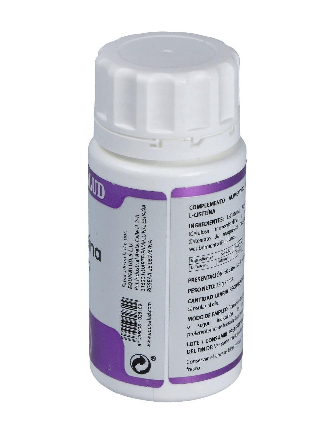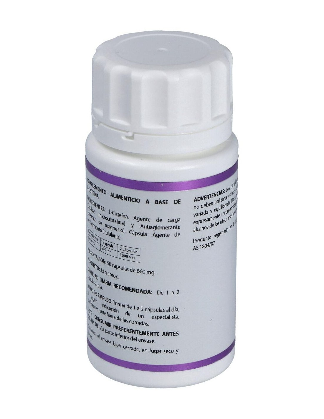 Composición por cápsula:500 mg de L-Cisteína. Modo de empleo:Tomar de 1 a 2 cápsulas al día fuera de las comidas. Presentación:Bote de 50 cápsulas.
