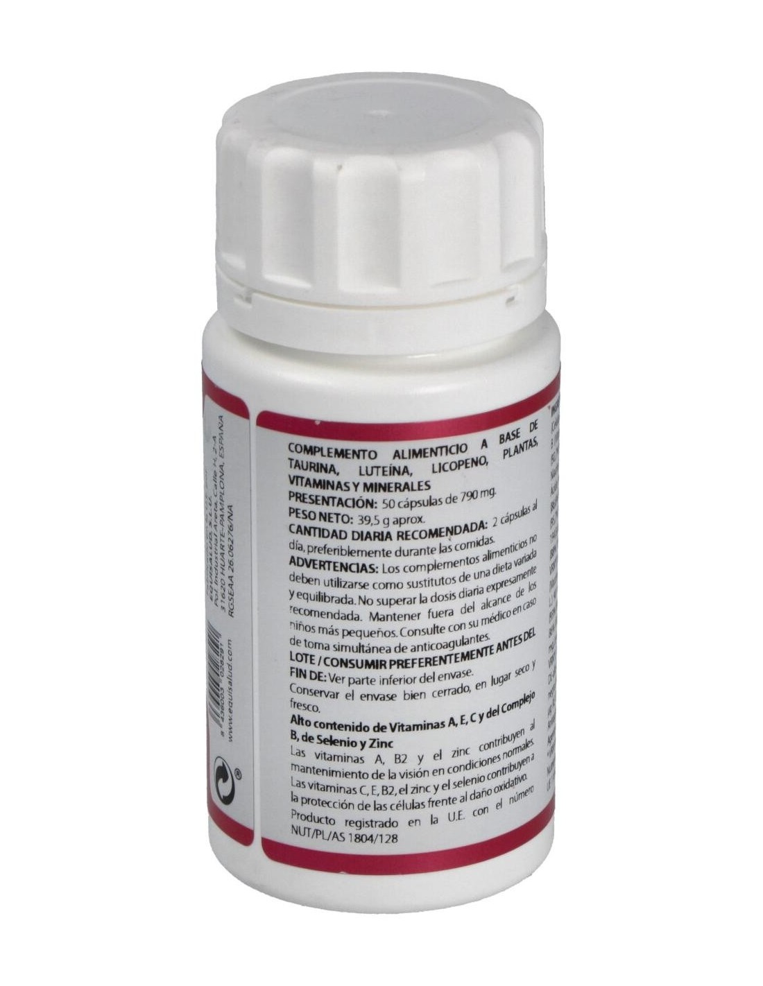 Taurina, 100 mg: complejo B (vitaminas: B1 (clorhidrato de tiamina), B2 (riboflavina), niacina (nicotinamida), ácido pantoténico (D-pantotenato cálcico), B6 (clorhidrato de piridoxina), folato (ácido pteroilmonoglutámico), B12 (cianocobalamina) y biotina (D-biotina)) en levadura de cerveza, 100 mg: arándano extracto seco (Vaccinium myrtillus L.), 50 mg: ginkgo extracto seco (Ginkgo biloba L.), 45 mg: vitamina C (ascorbato cálcico), 37,2 mg: gluconato de zinc (14,35% zinc), 30 mg: complejo de bioflavonoides cítricos (>50% flavonoides totales), 25 mg: levadura enriquecida con selenio (selenio 1.000 ppm), 25 mg (aporta 25 µg de selenio): luteína (>10% luteína), 7 mg: vitamina E (acetato de DL-alfa-tocoferilo), 3,36 mg: pimienta negra extracto seco (Piper nigrum L.), 2 mg: beta-caroteno (>10% beta-caroteno), 2 mg: licopeno (>3% licopeno), 0,3 mg. Envoltura: polisacárido de origen vegetal (pululano).
