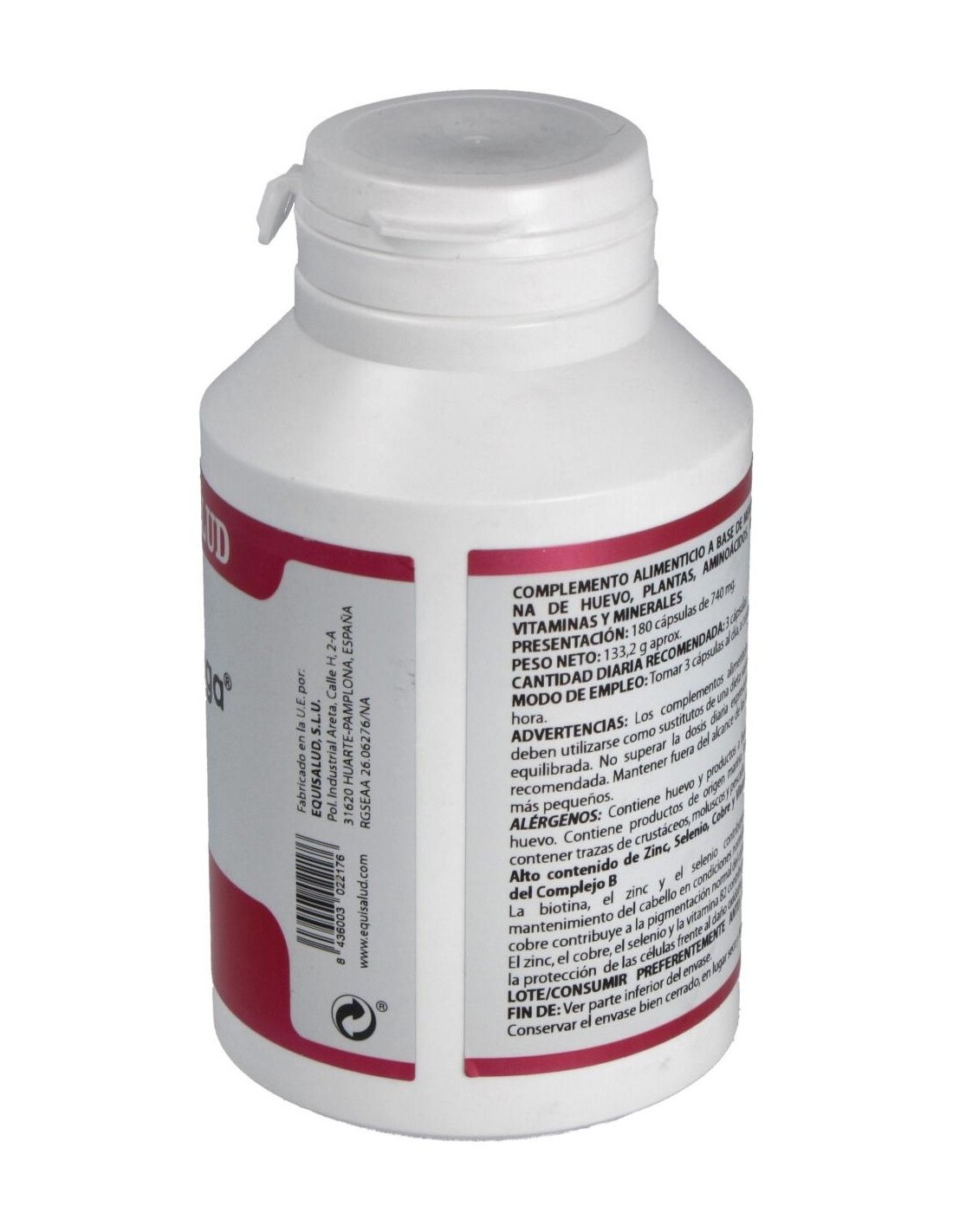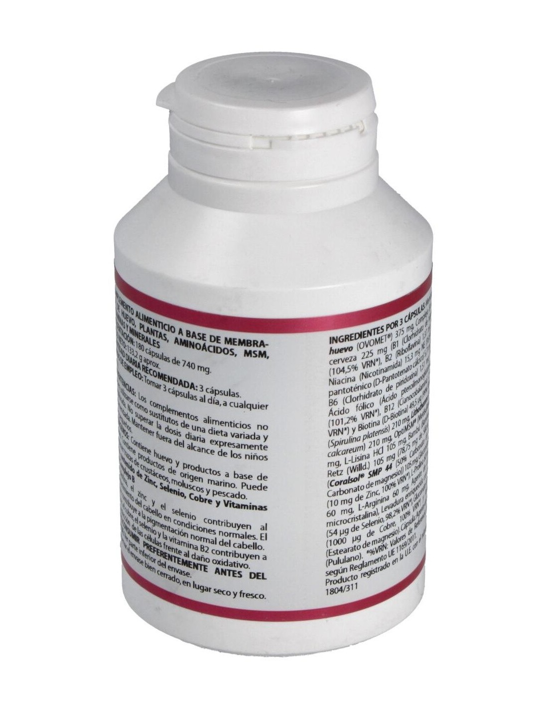 MEMBRANA INTERNA DE HUEVO (OVOMET®), 125 MG; COMPLEJO B EN LEVADURA DE CERVEZA, 75 MG; ESPIRULINA (SPIRULINA PLATENSIS), 70 MG; LITHOTHAMNE (LITHOTHAMNIUM CALCAREUM), 70 MG; OPTIMSM (METILSULFONILMETANO) 50 MG, L-LISINA HCL 35 MG, BAMBÚ (BAMBUSA ARUNDINACEA RETZ (WILLD.), 35 MG; CORAL MARINO (CORALSOL® SMP 44 (50% CARBONATO DE CALCIO Y 40% CARBONATO DE MAGNESIO)), 35 MG; GLUCONATO DE ZINC, 23,3 MG; L-PROLINA, 20 MG; L-METIONINA, 20 MG; L-ARGININA, 20 MG; LEVADURA ENRIQUECIDA CON SELENIO, 18 MG; GLUCONATO DE COBRE, 2,4 MG.