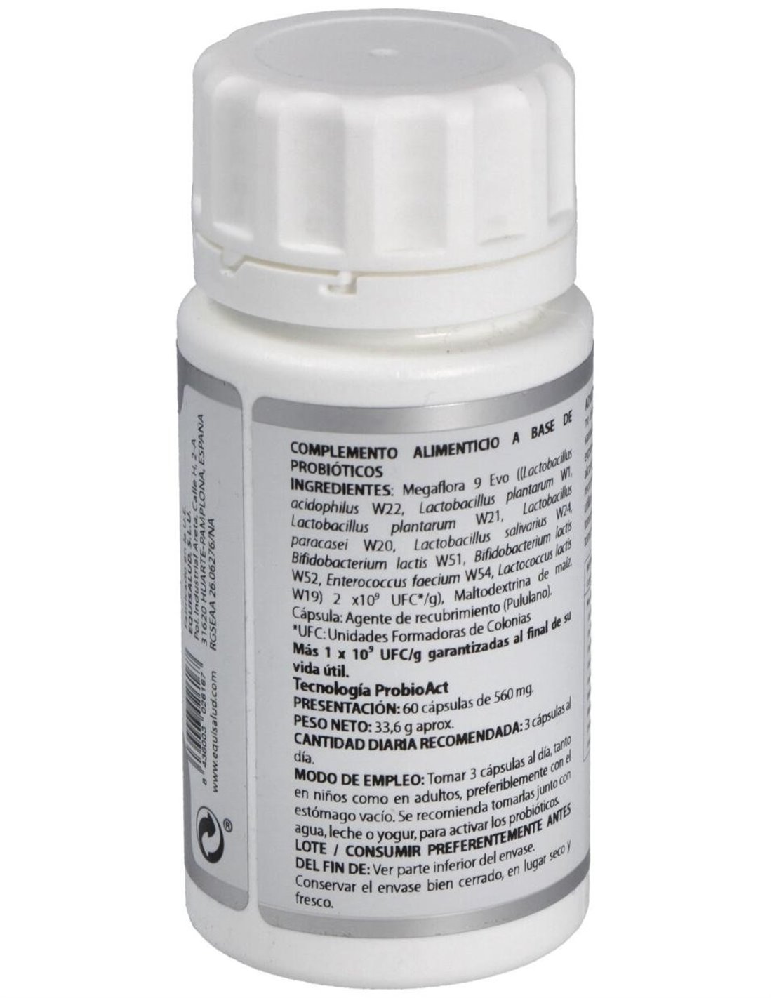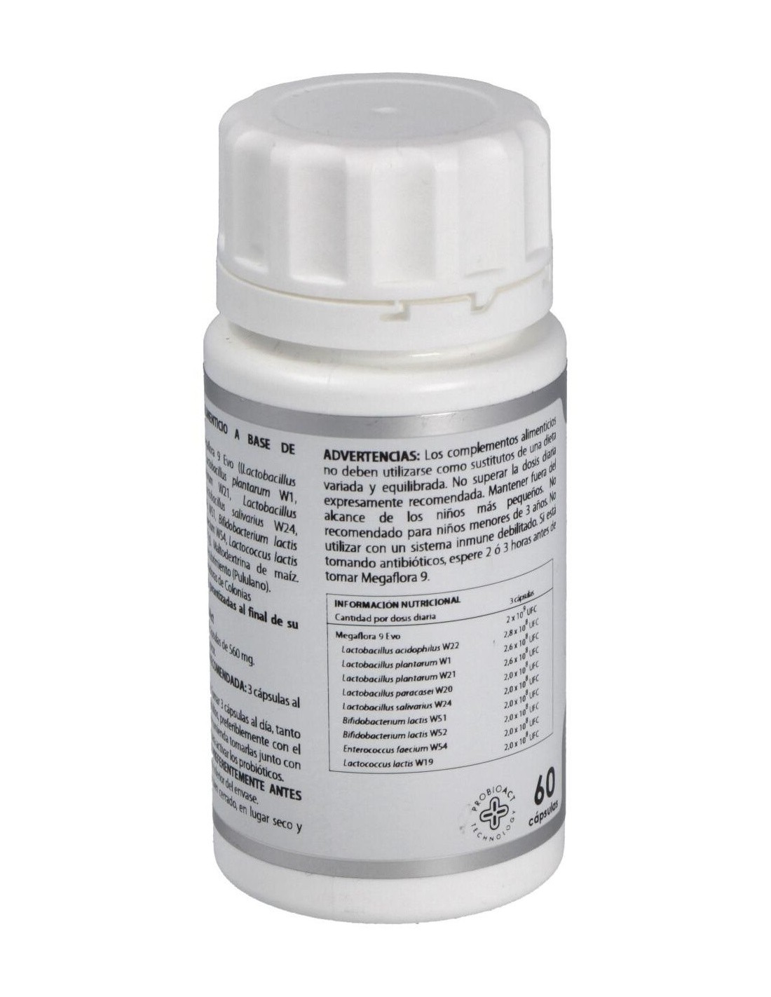 Megaflora 9® ((Bifidobacterium lactis W51, Bifidobacterium lactis W52, Enterococcus faecium W54, Lactobacillus acidophilus W22, Lactobacillus paracasei W20, Lactobacillus plantarum W21, Lactobacillus salivarius W24, Lactococcus lactis W19) 1x109 UFC/g), 990 mg. Excipiente tecnológico: maltodextrina de maíz (agente de carga). Envoltura: agente de recubrimiento (hidroxipropilmetilcelulosa) y gelificante (goma gellan).