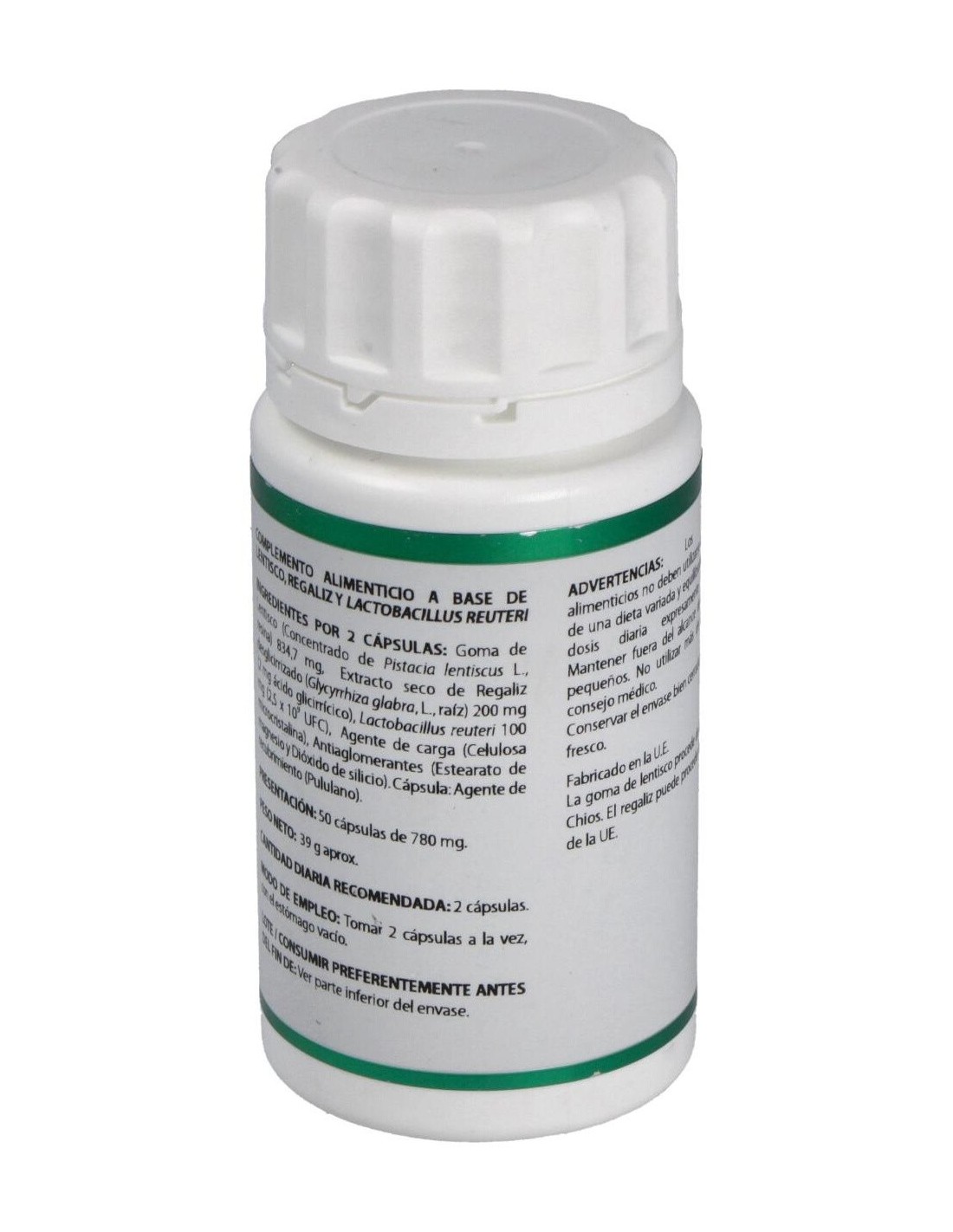 Complemento alimenticio a base de lentisco, regaliz y Lactobacillus reuteri. Apto para vegetarianos, diabéticos y pacientes con dietas restrictivas.