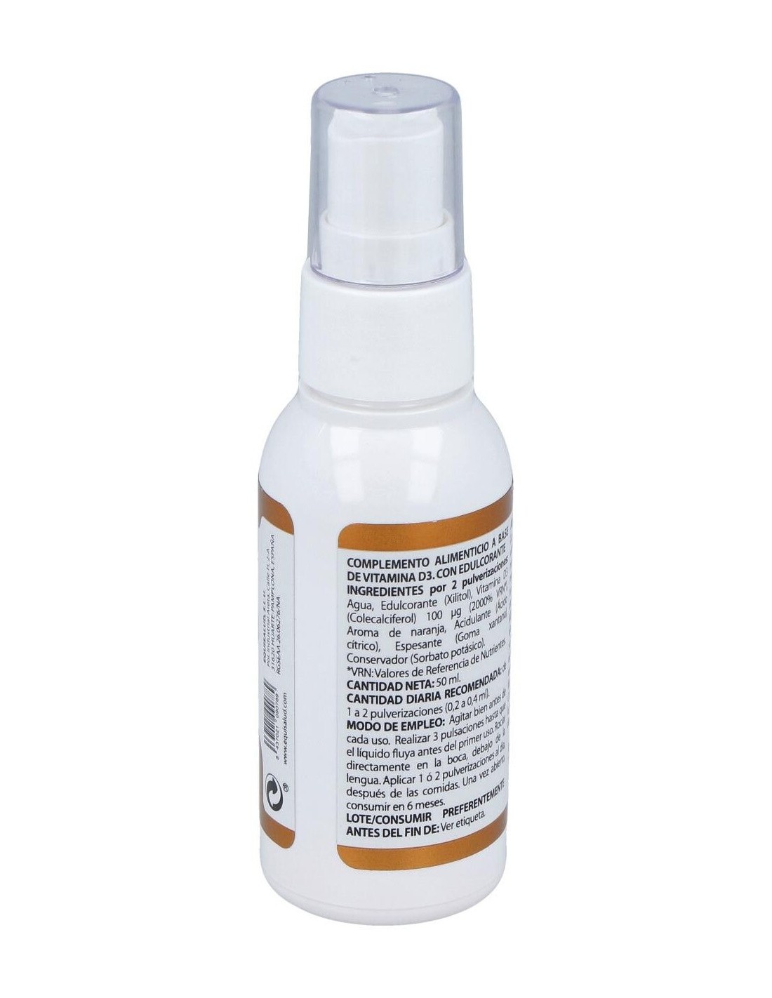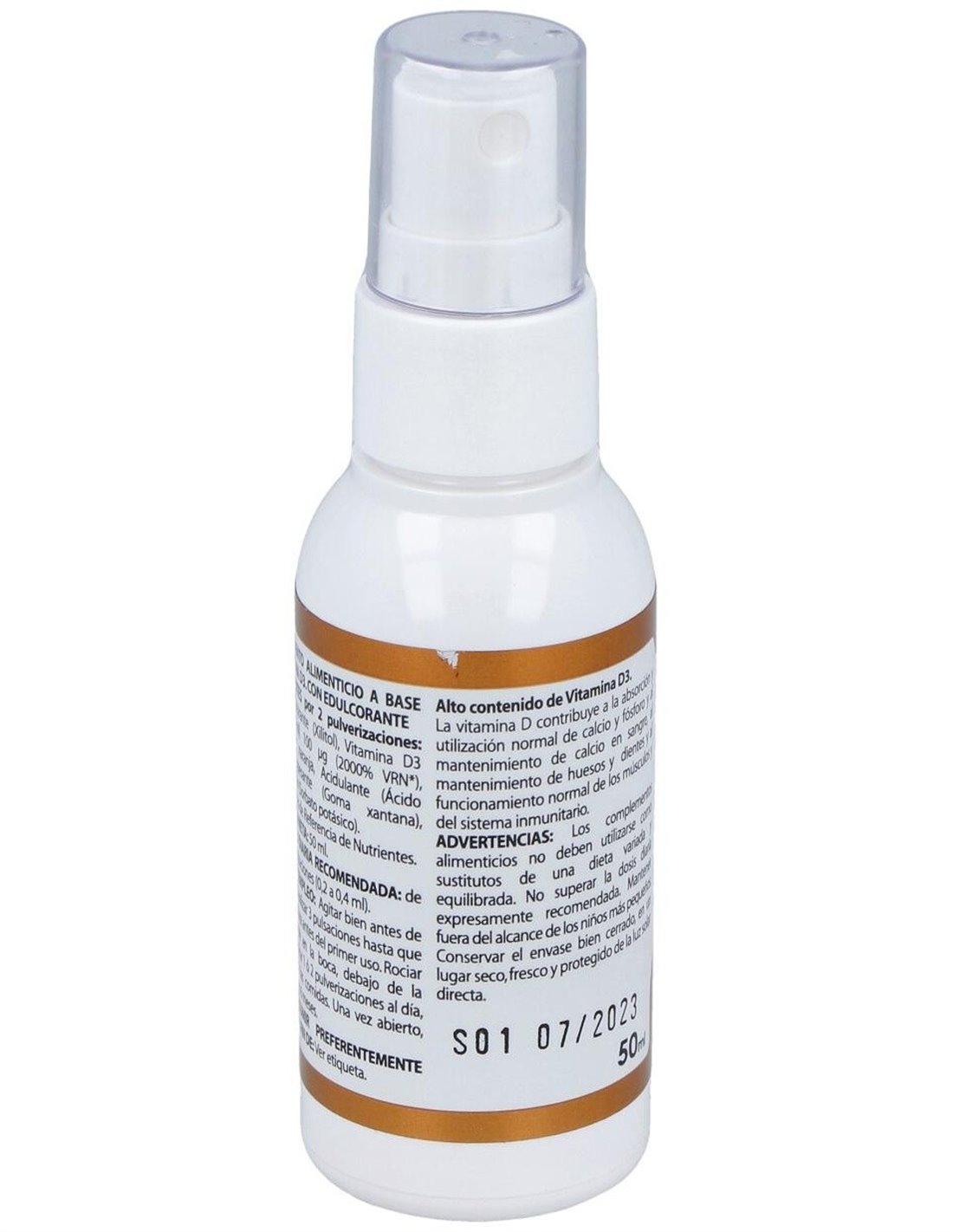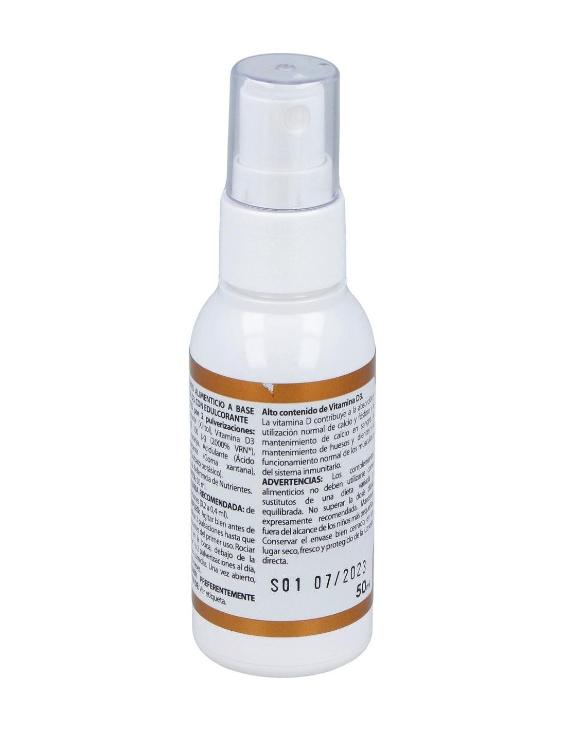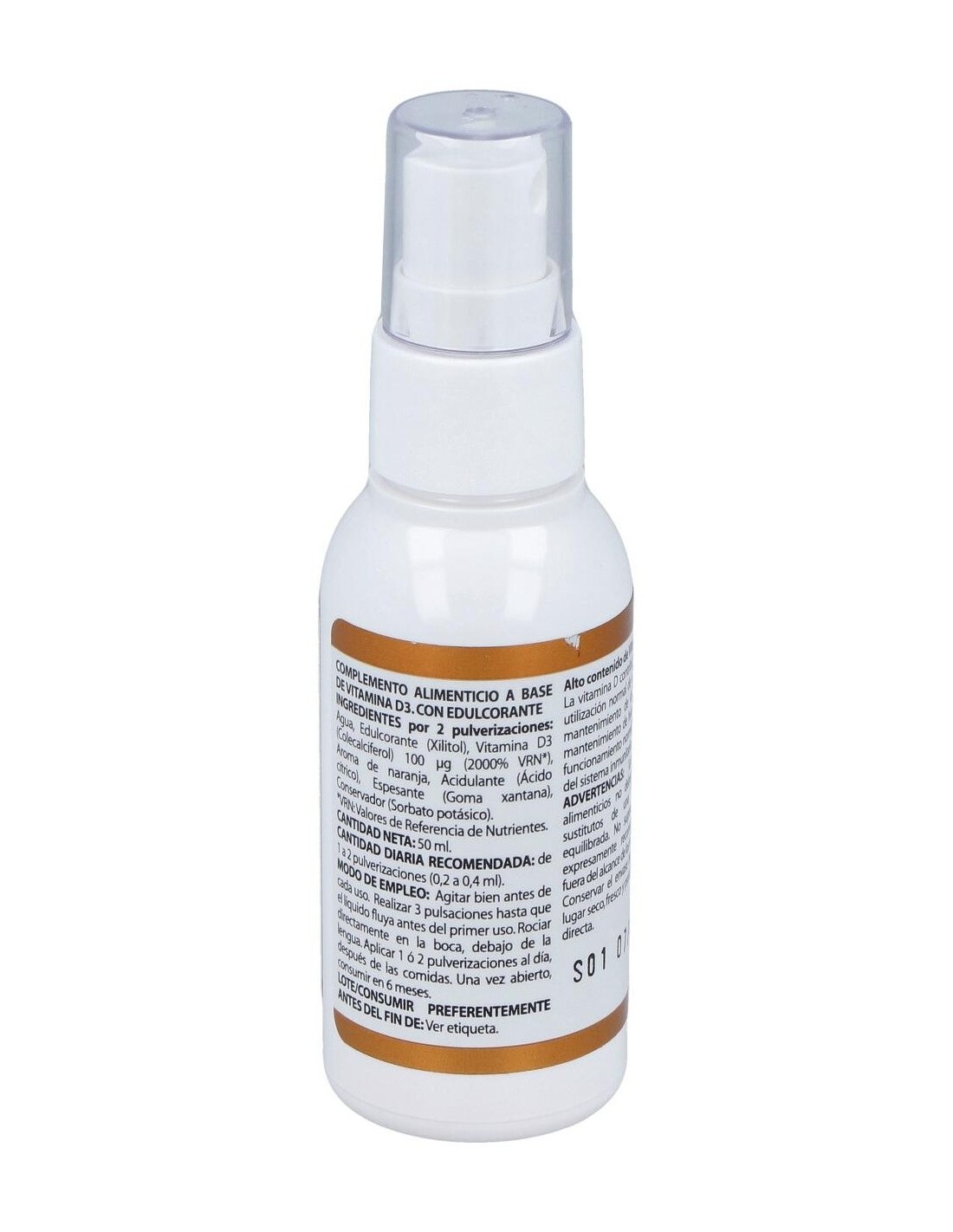 Complemento alimenticio en práctico dosificador de spray y con sabor a naranja, elaborado a base de vitamina D3, que contribuye al mantenimiento saludable de huesos y dientes. Promueve una mayor absorción de calcio en los huesos y ayuda a mantener los niveles normales de calcio en sangre.Contribuye también al funcionamiento normal del sistema inmunitario.