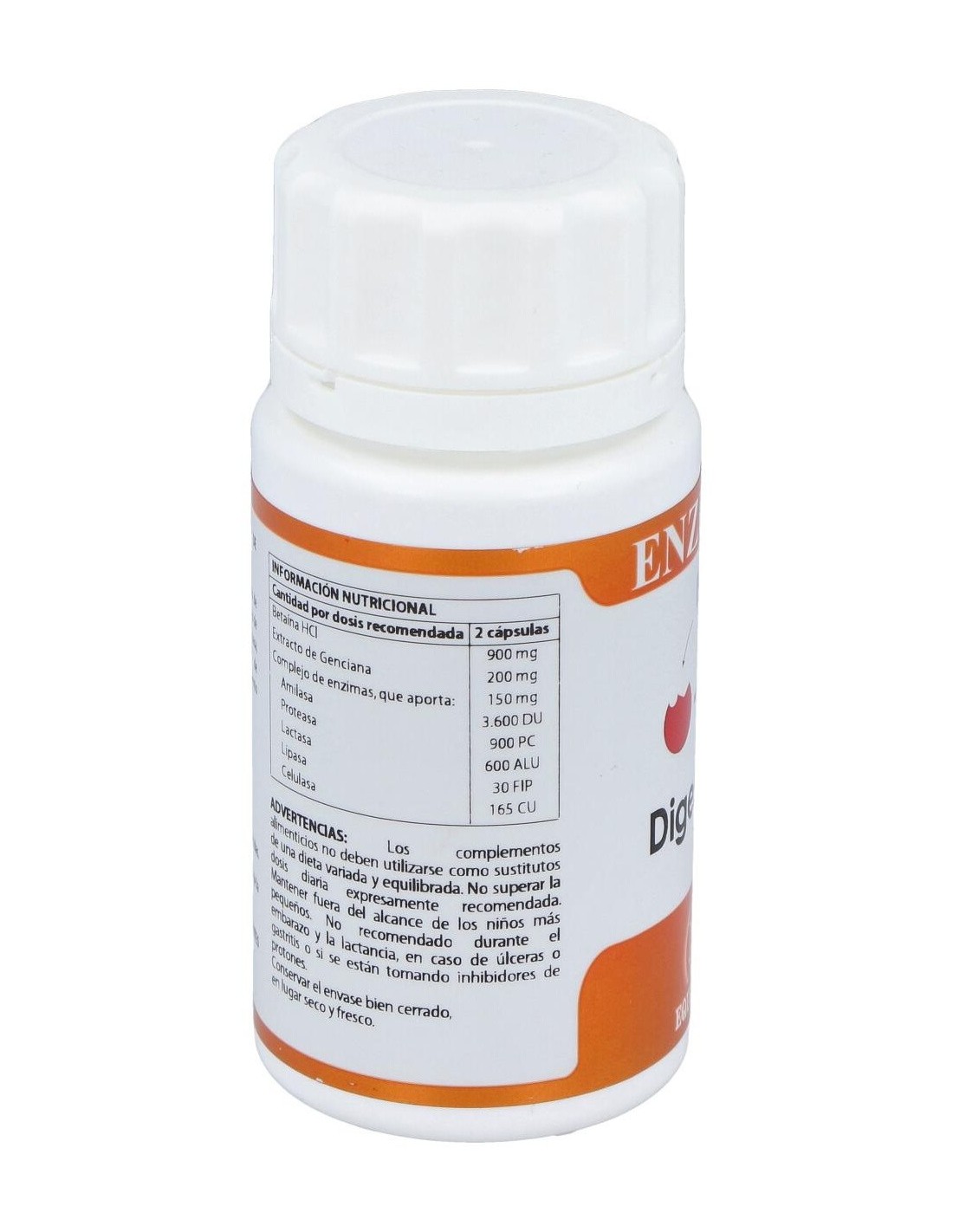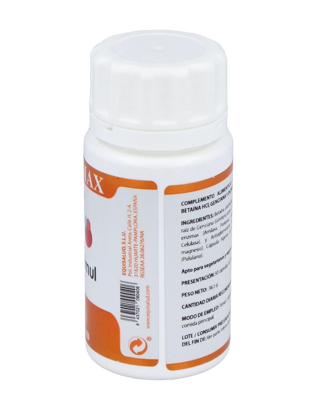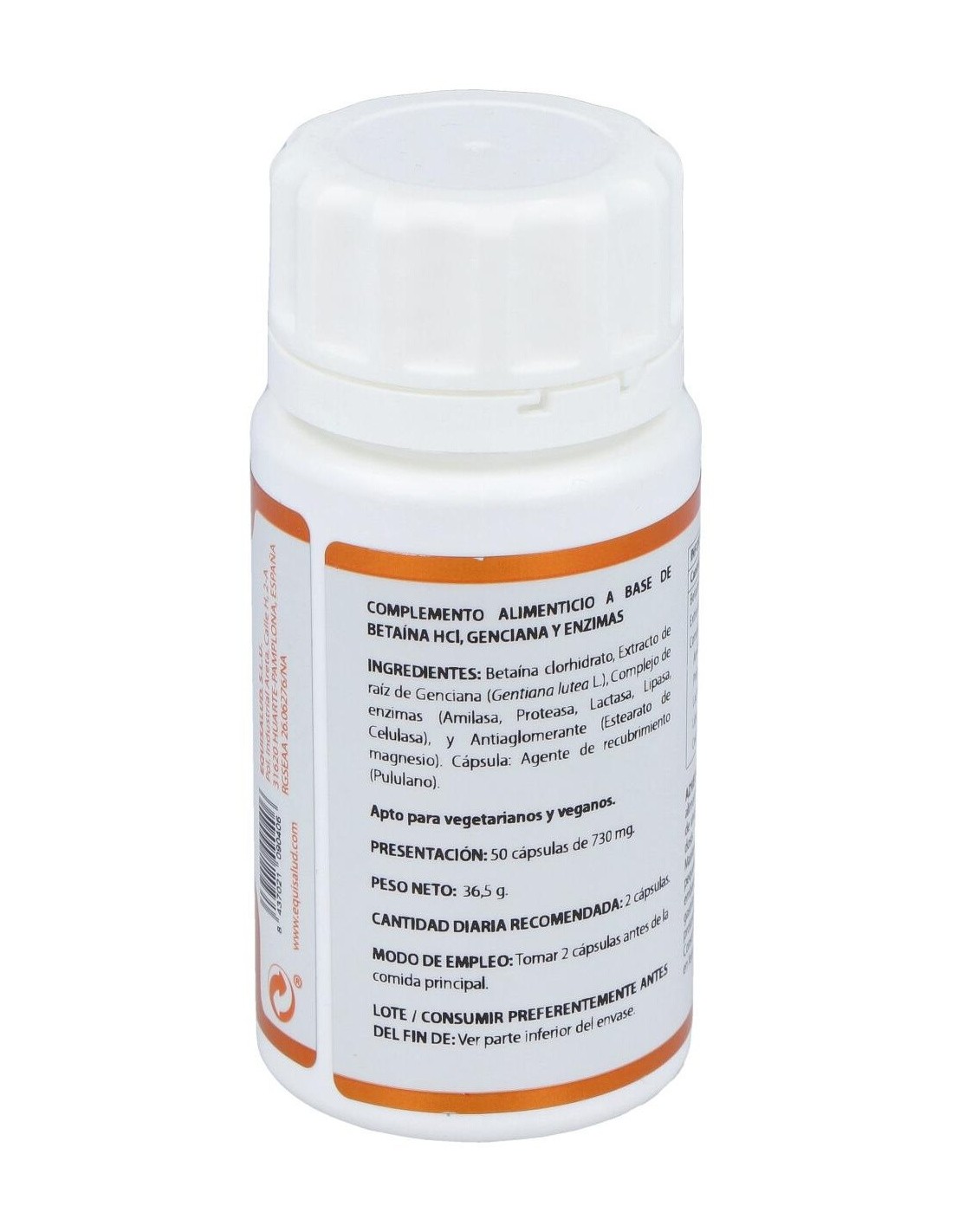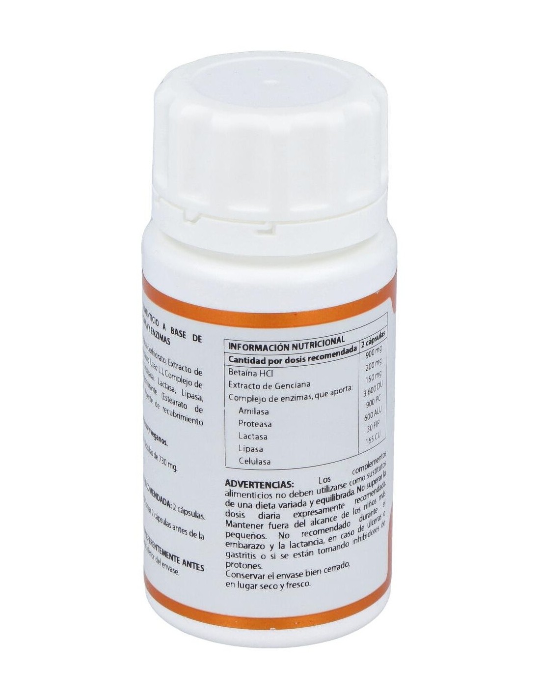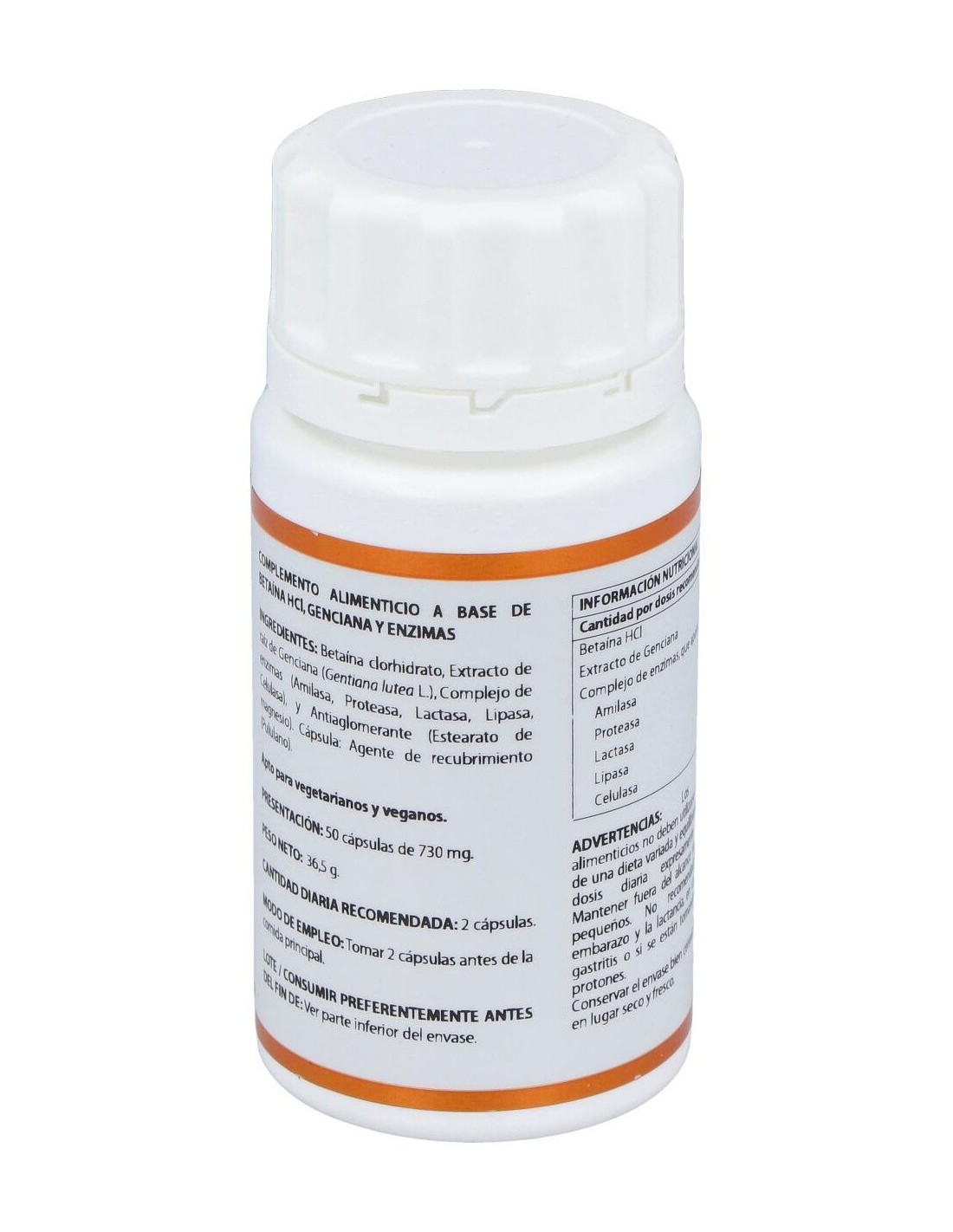 Betaína HCl 450 mg, genciana extracto seco (Gentiana lutea L.), 100 mg: complejo de enzimas de origen natural (amilasa > 24.000 DU/g, proteasa > 6.000 PC/g, lactasa > 4.000 ALU/g, lipasa > 200 FIP/g, celulasa > 1.100 CU/g), 75 mg. Envoltura: polisacárido de origen vegetal (pululano).