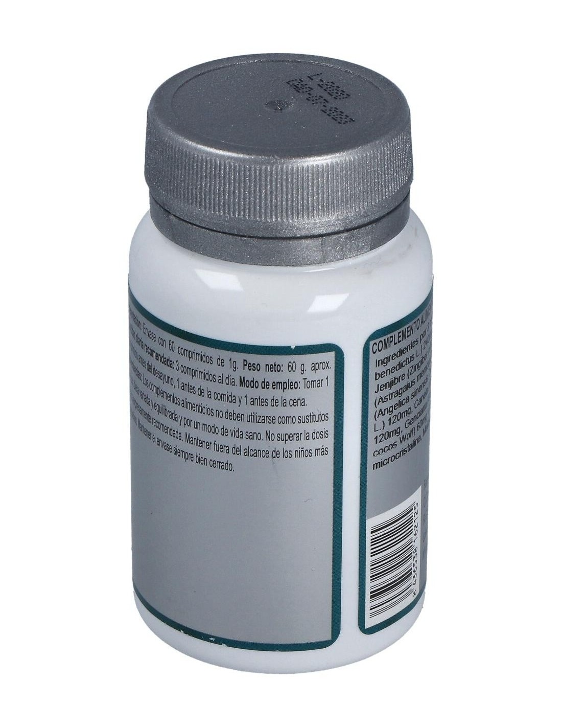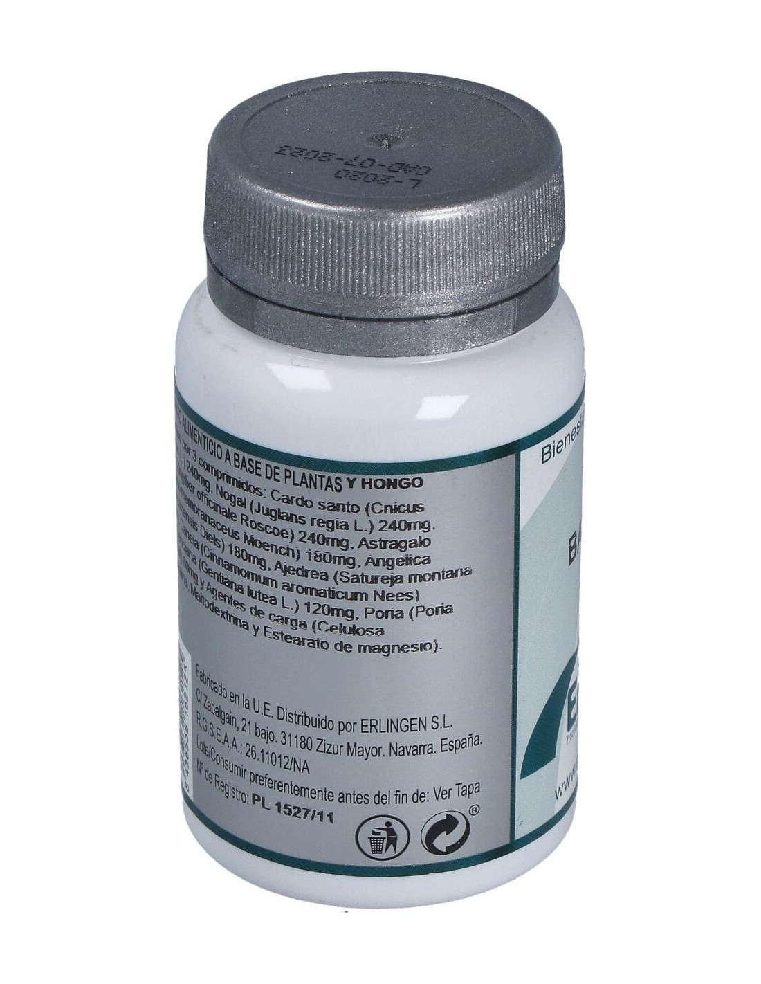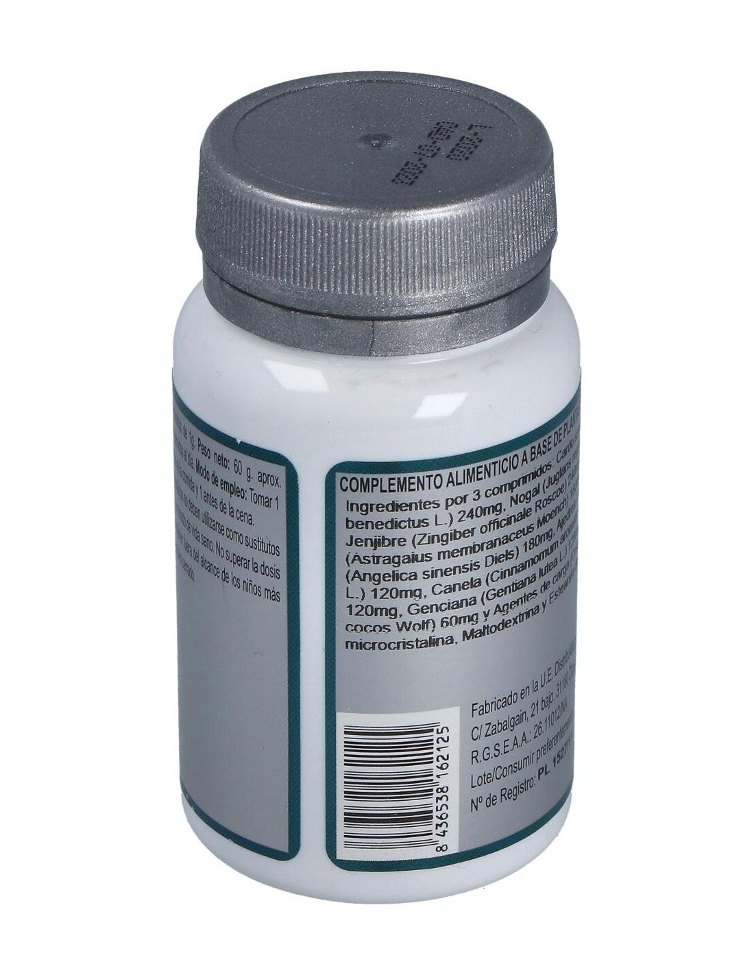 Cardo santo (Cnicus benedictus L.) 240 mg, Nogal (Juglans regia L.) 240 mg, Jengibre (Zingiber officinale Roscoe) 240 mg, Astrágalo (Astragalus membranaceus Moench) 180 mg, Angélica (Angelica sinensis Diels) 180 mg, Ajedrea (Satureja montana L.) 120 mg, Canela (Cinnamomum aromaticum Nees) 120 mg, Genciana (Gentiana lutea L.) 120 mg, Poria (Poria cocos Wolf) 60 mg y Agentes de carga (Celulosa microcristalina, Maltodextrina y Estearato de magnesio).