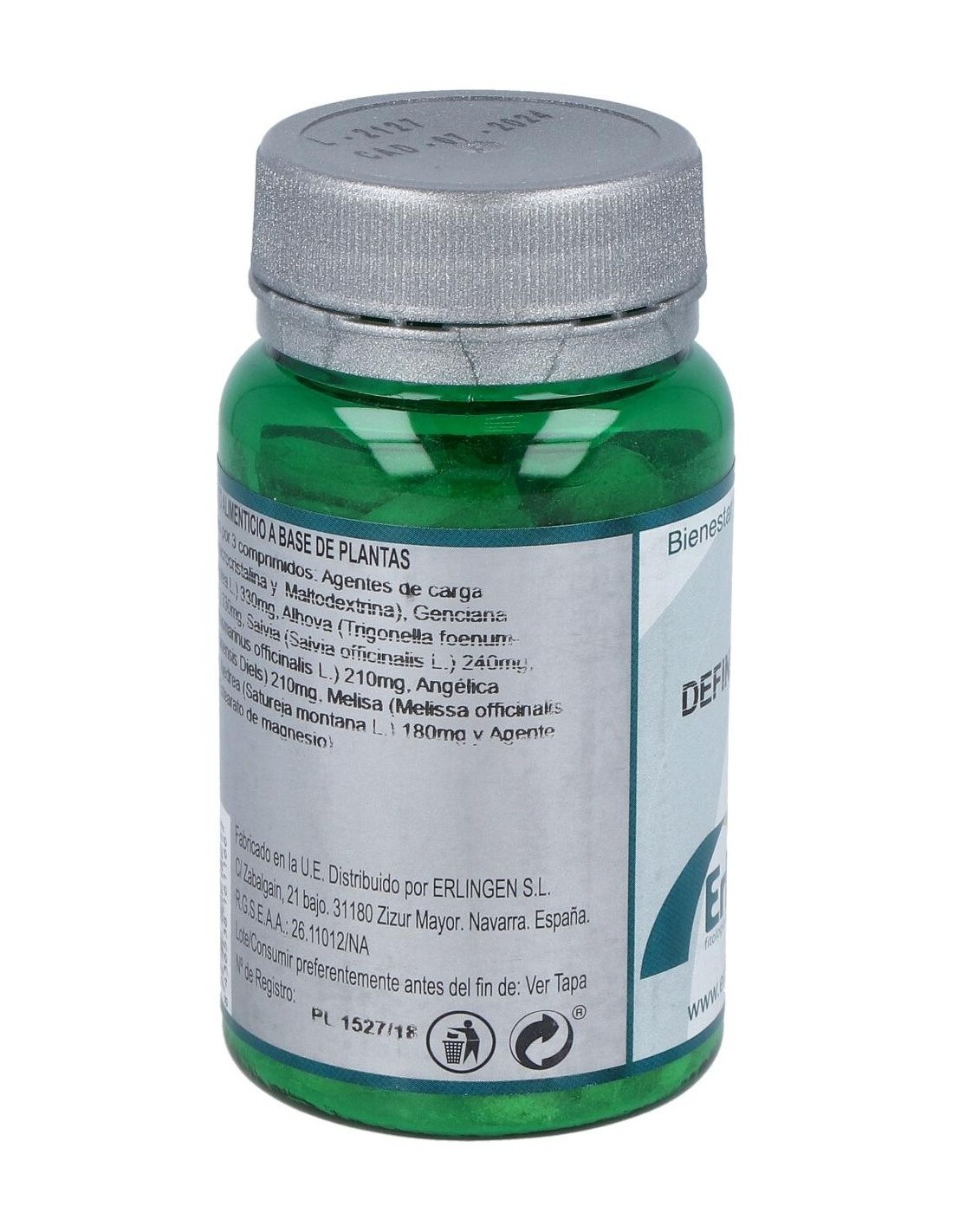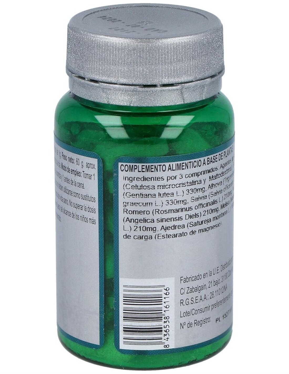 Genciana (Gentiana Lutea L.), Alholva (Trigonella Foenum-Graecum L.), Salvia (Salvia Officinalis L.), Romero (Rosmarinus Officinalis L.), Angélica (Angelica Sinensis Diels), Melisa (Melissa Officinalis L.), Ajedrea (Satureja Montana L.) Y Agentes de Carga (Celulosa Microcristalina, Maltodextrina Y Estearato de Magnesio).
