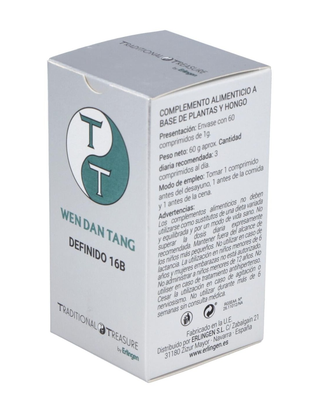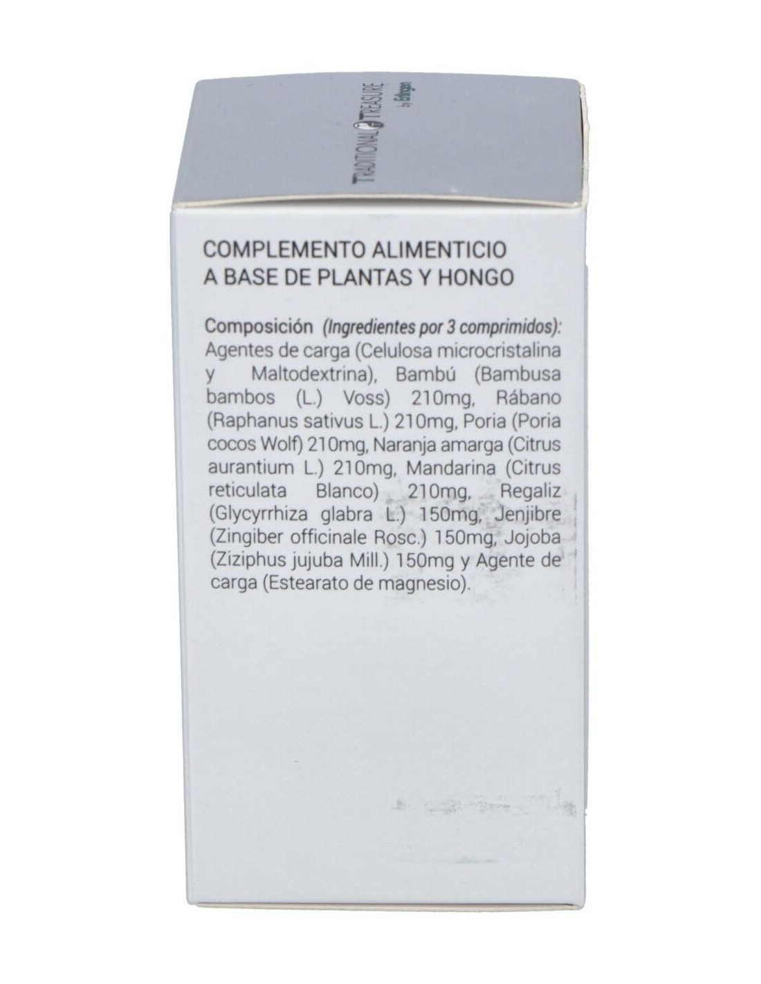 Agentes de carga (Celulosa microcristalina y Maltodextrina), Bambú (Bambusa bambos (L.) Voss) 210 mg, Rábano (Raphanus sativus L.) 210 mg, Poria (Poria cocos Wolf) 210 mg, Naranja amarga (Citrus aurantium L.) 210 mg, Mandarina (Citrus reticulata Blanco) 210 mg, Regaliz (Glycyrrhiza glabra L.) 150 mg, Jengibre (Zingiber officinale Rosc.) 150 mg, Jojoba (Ziziphus jujuba Mill.) 150 mg y Agente de carga (Estearato de magnesio).