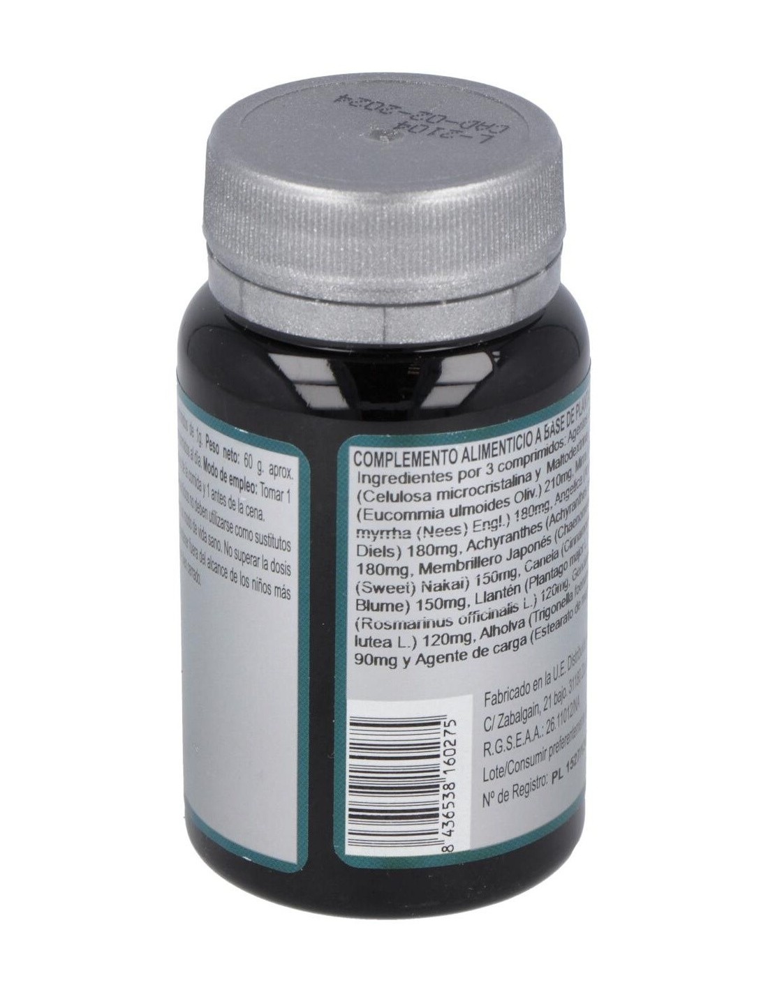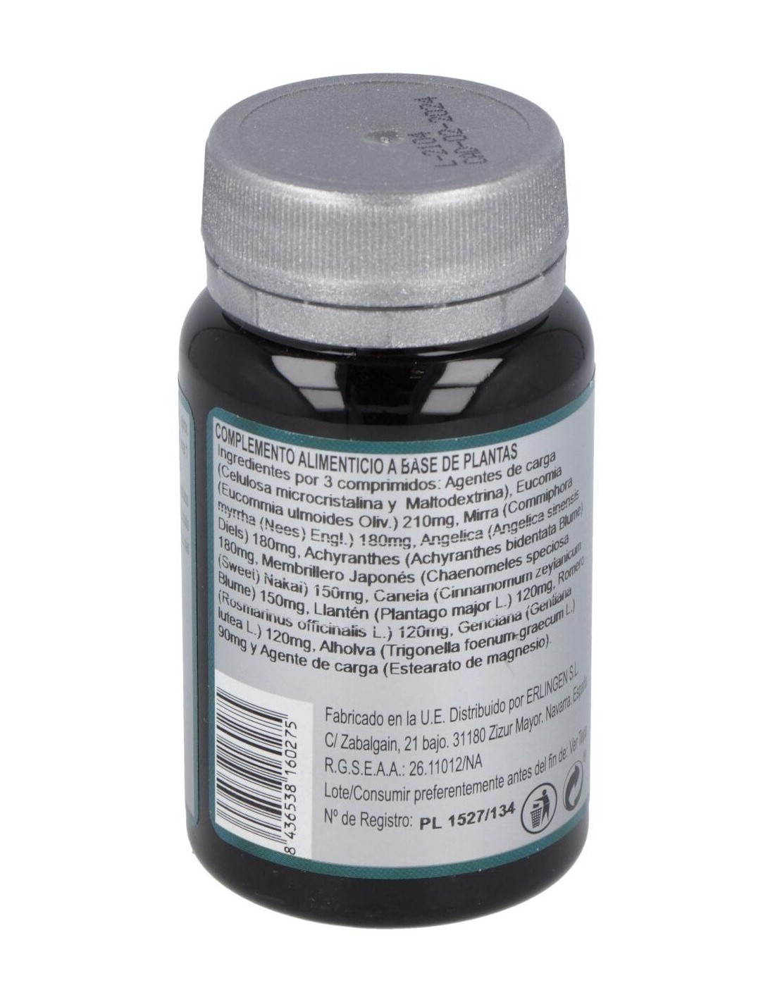 Eucomia (Eucommia ulmoides Oliv.), Mirra (Commiphora myrrha (Nees) Engl.), Angélica (Angelica sinensis Diels), Achyranthes (Achyranthes bidentata Blume), Membrillero Japonés (Chaenomeles speciosa (Sweet) Nakai), Canela (Cinnamomum zeylanicum Blume), Llantén (Plantago major L.), Romero (Rosmarinus officinalis L.), Genciana (Gentiana lutea L.), Alholva (Trigonella foenum-graecum L.) y Agentes de carga (Celulosa microcristalina, Maltodextrina y Estearato de magnesio).
