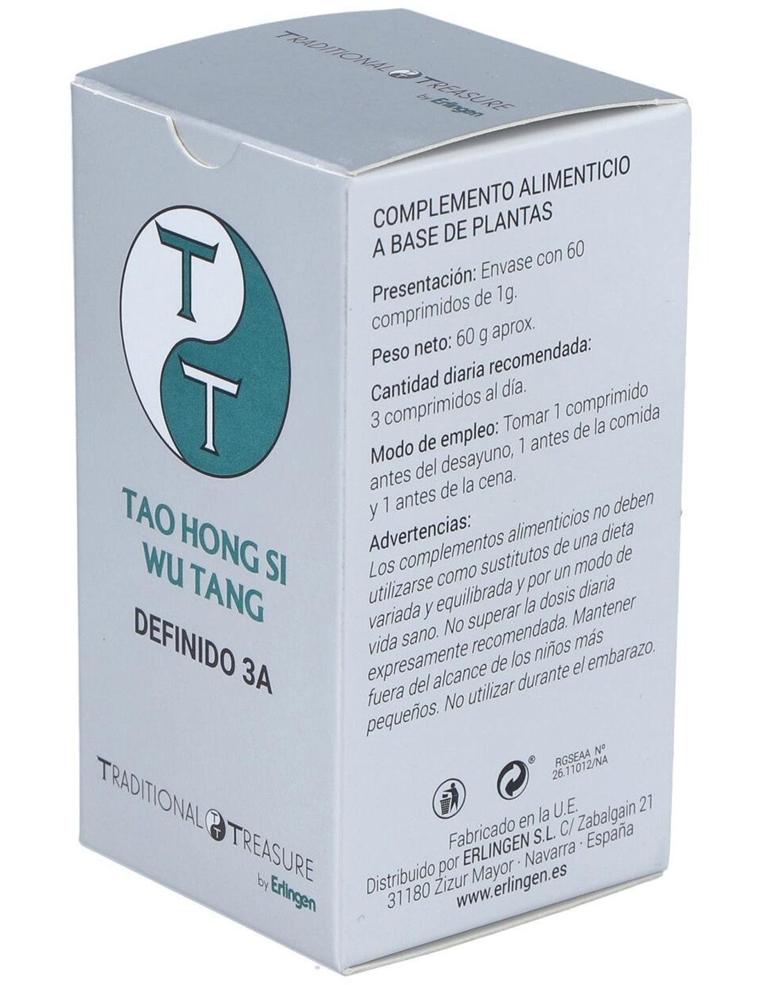 Agentes de carga (Celulosa microcristalina y Maltodextrina), Peonía (Paeonia lactiflora Pall.) 360 mg, Remania (Rehmannia glutinosa (Gaertn.) DC.) 315 mg, Angelica (Angelica sinensis (Oliv.) Diels) 285 mg, Ligusticum (Ligusticum wallichii Franch.) 255 mg, Melocotonero (Prunus persina (L.) Stokes) 180 mg, Cártamo (Carthamus tinctorius L.) 105 mg y Agente de carga (Estearato de magnesio).