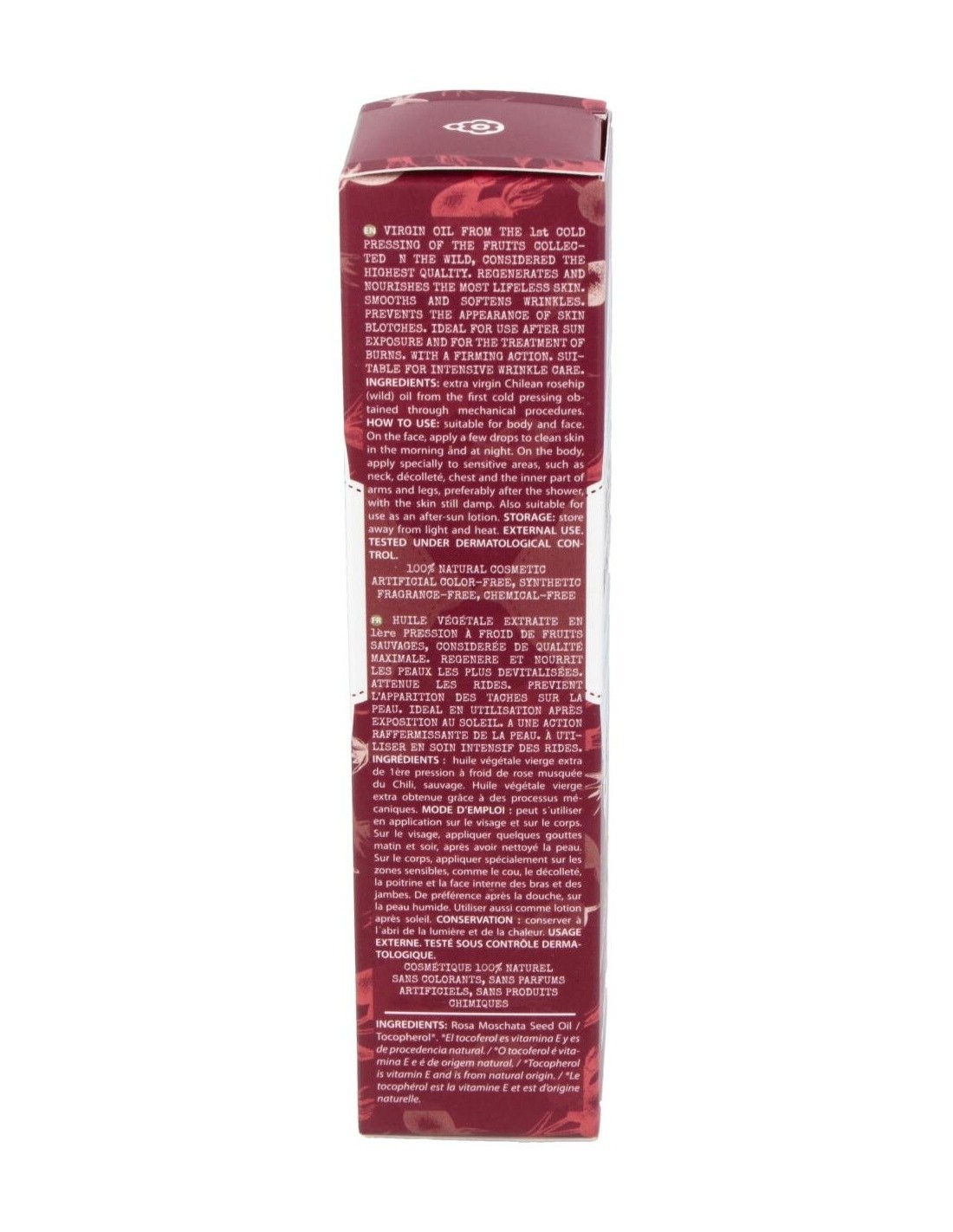 Rosa Mosqueta es un aceite vegetal virgen con un elevado contenido en O-3 vegetal (32%) y O -6(45%) es especialmente rico en compuestos específicos de acción antioxidante, como el licopeno, que le confiere su color anaranjado y sus propiedades altamente antioxidantes y regeneradoras. Con este tipo de aceite se obtendrá los beneficios que la rosa mosqueta auténtica puede proporcionar. Altamente hidratante y nutritivo, regenerador y antioxidante, cicatrizante. Está recomendado en cuidado especial de la piel desnutrida, opaca, desvitalizada y prematuramente envejecida, prevención de la aparición de arrugas, cuidado e hidratación de cicatrices y marcas en la piel y prevención de la aparición de manchas en la piel.