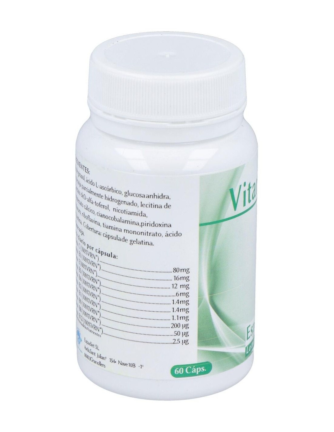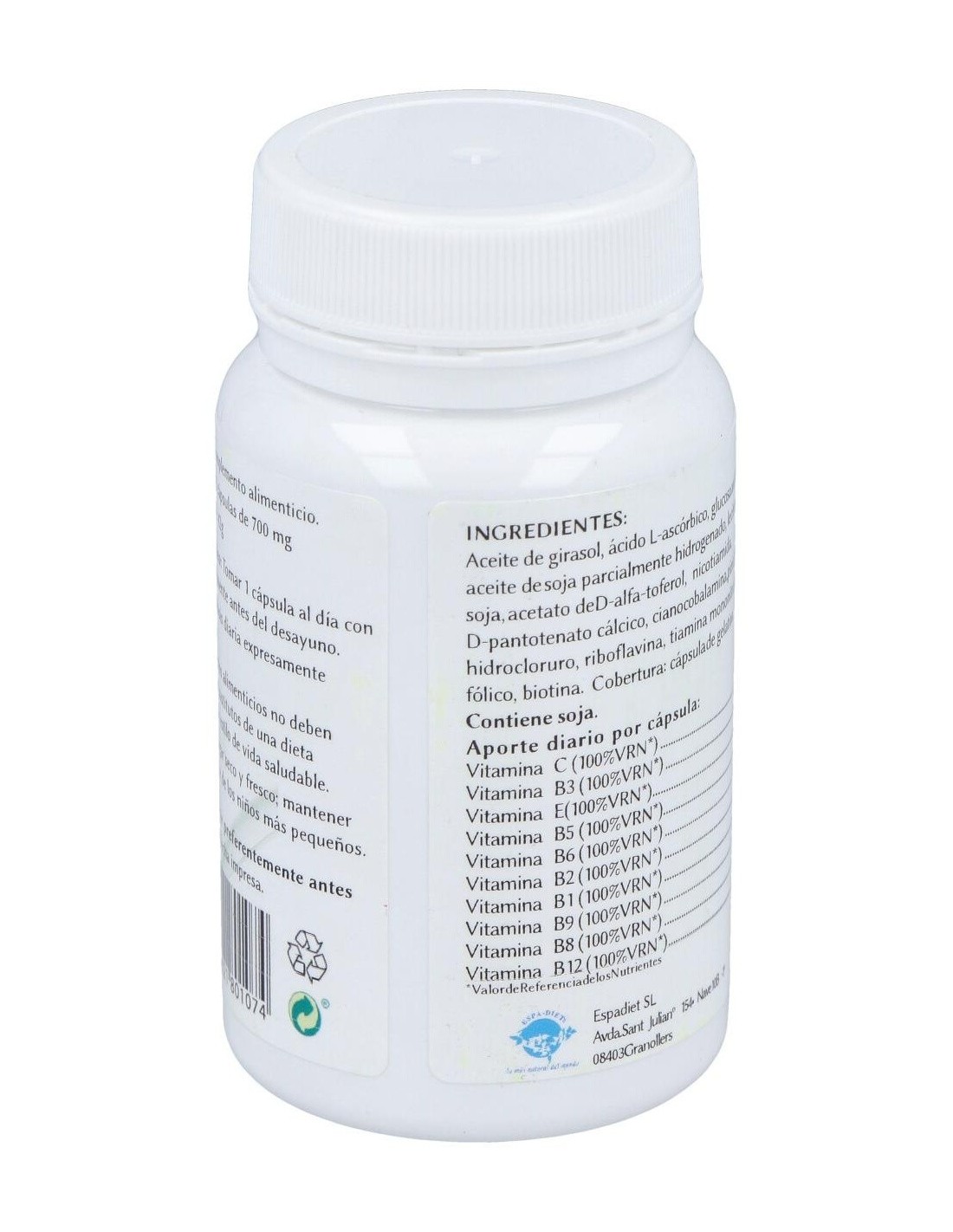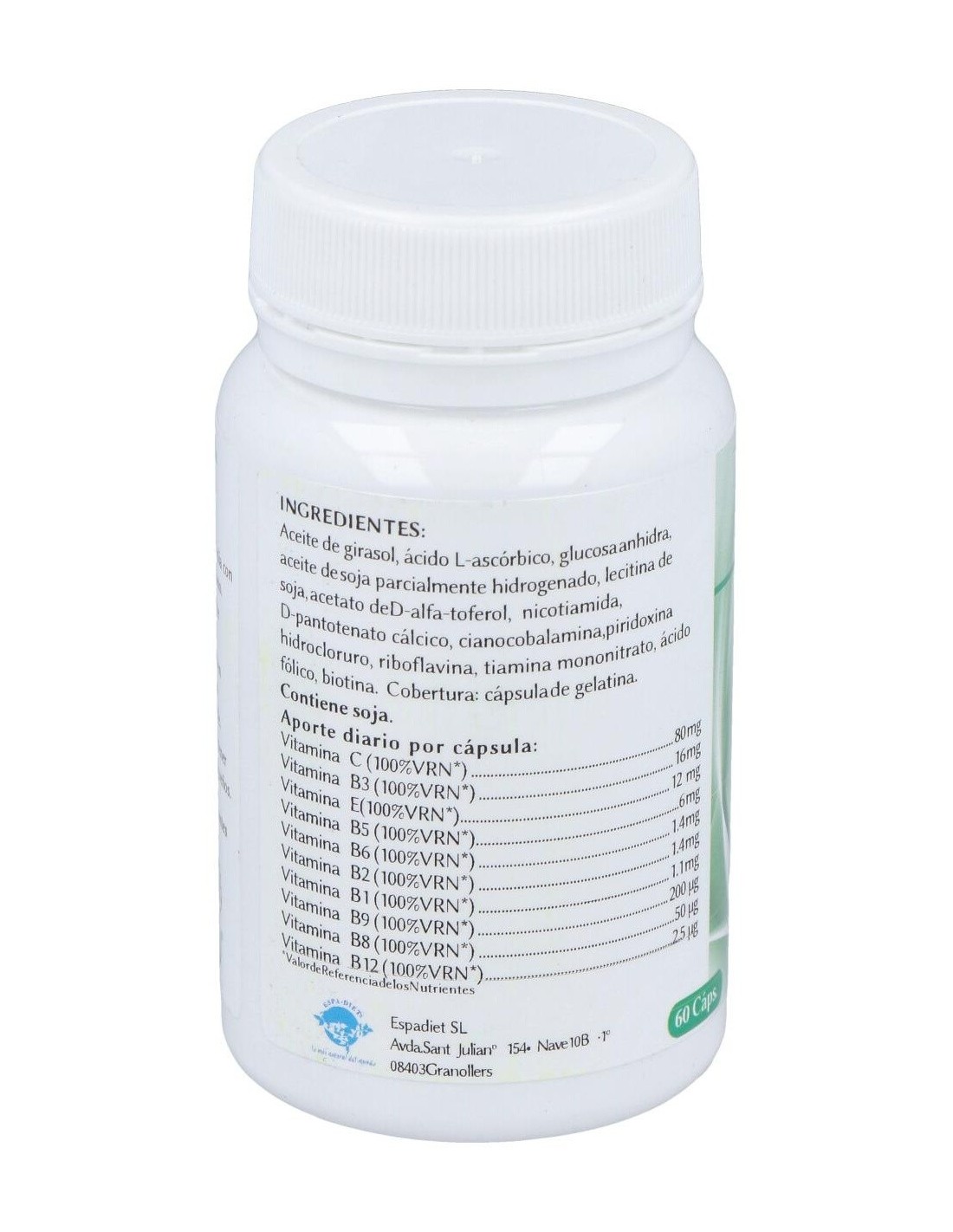 Aceite de girasol, ácido L-ascórbico, glucosa anhidra, aceite de soja parcialmente hidrogenada, lecitina de soja, acetato de d-alfa-toferol, nicotiamida, D-pantontenato cálcico, cianocobalamina, piridoxina hidrocloruro, riboflavina, tiamina mononitrato, ácido fólico, biotina, cobertura: cápsula de gelatina, glicerina, colorantes (E-171 y E-172)