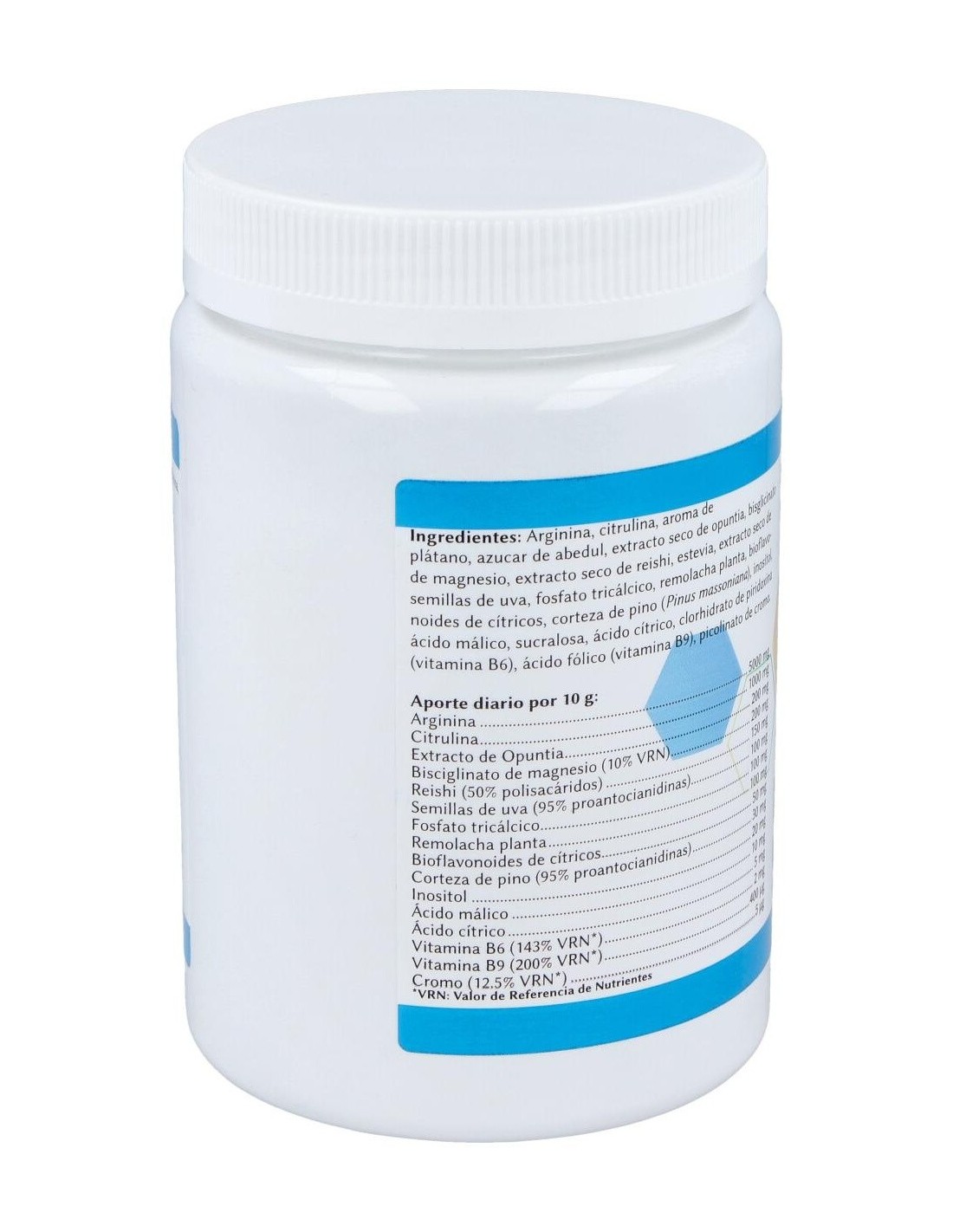 Arginina, fructosa, citrulina, aroma de naranja, extracto seco de opuntia, bisciglinato de magnesio, extracto seco de reishi, estevia, extracto seco de semillas de uva, fosfato tricálcico, remolacha planta, bioflavonoides de cítricos, corteza de pino, inositol. ácido málico, ácido cítrico, clorhidrato de piridoxina (vitamina B6), ácido fólico (vitamina B9).
