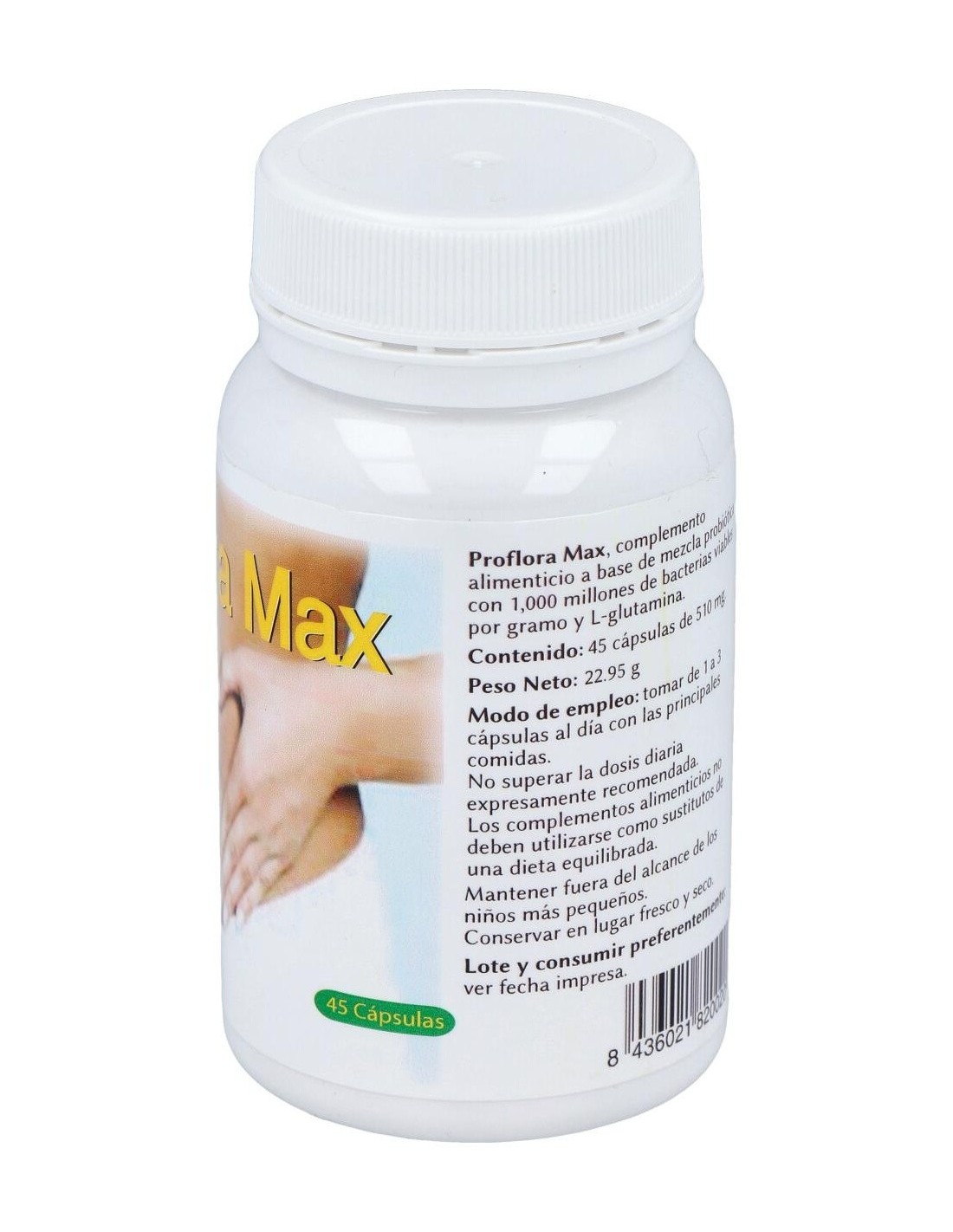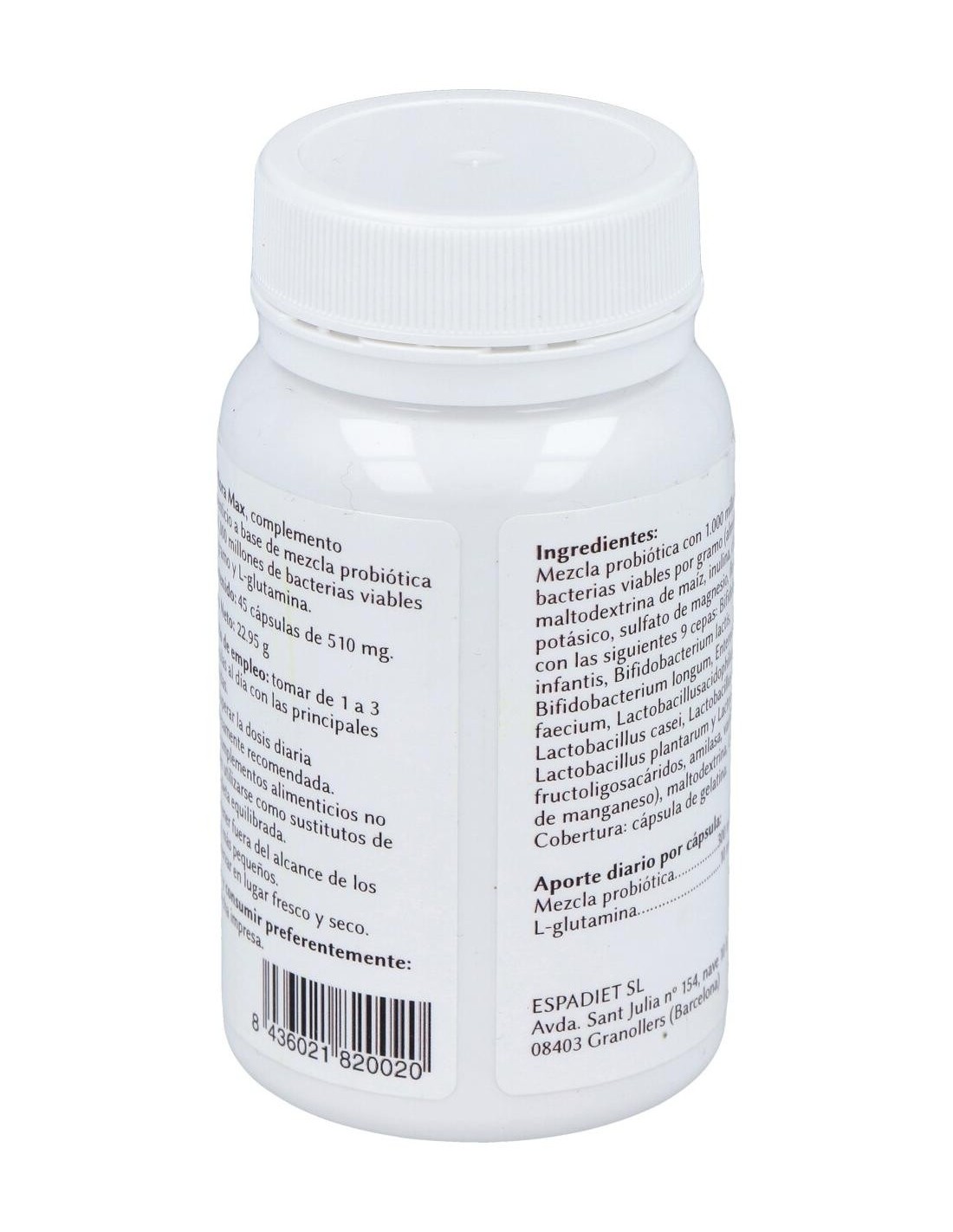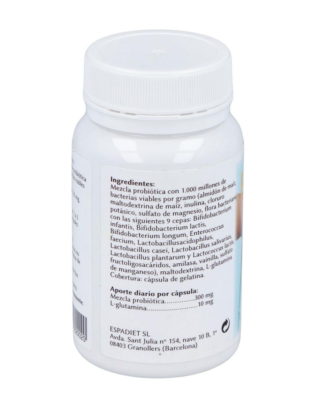 Mezcla probiótica con 1.000 millones de bacterias viables por gramo (almidón de maíz, maltodextrina de maíz, inulina, cloruro potásico, sulfato de magnesio, flora bacteriana con las siguientes 9 cepas: bifidobacterium infantis, bifidobacterium lactis, bifidobacterium longum, enterococcus faecium, lactobacillusacidophilus,lactobacillus casei, lactobacillus salivarius, lactobacillus plantarum y lactococcua lactis, fructoligosacáridos, amilasa, vainilla, sulfato de manganeso), maltodextrina, l-glutamina, cobertura: cápsula de gelatina blanca, colorante E-171.