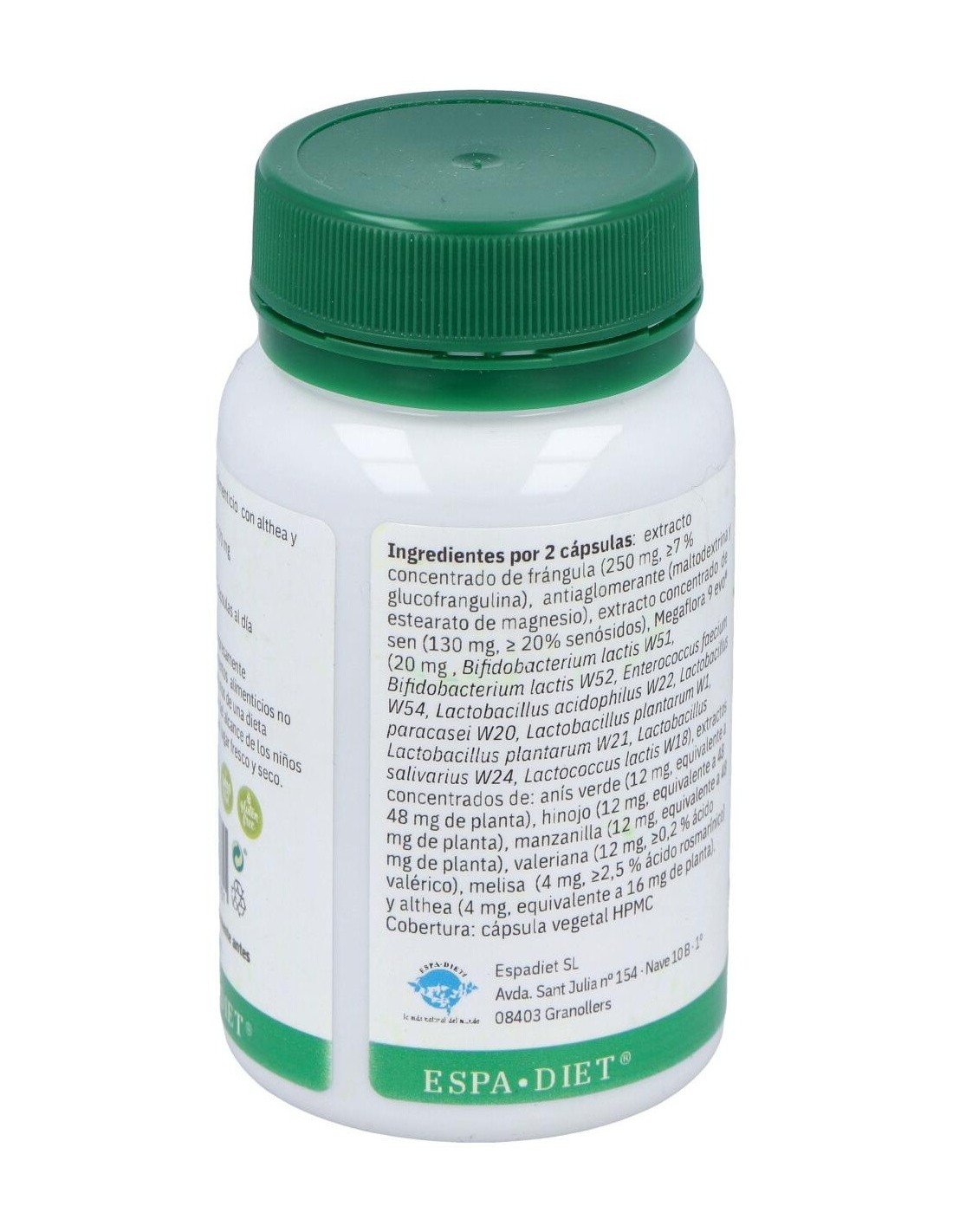 Extracto concentrado de frángula, extracto concentrado de sen, Megaflora 9 EVO®, extracto concentrado de anís verde,extracto concentrado de manzanilla, extracto concentrado de valeriana, extracto concentrado de melisa, extracto concentrado de althea. Cobertura: cápsula celulosa vegetal HPMC.
